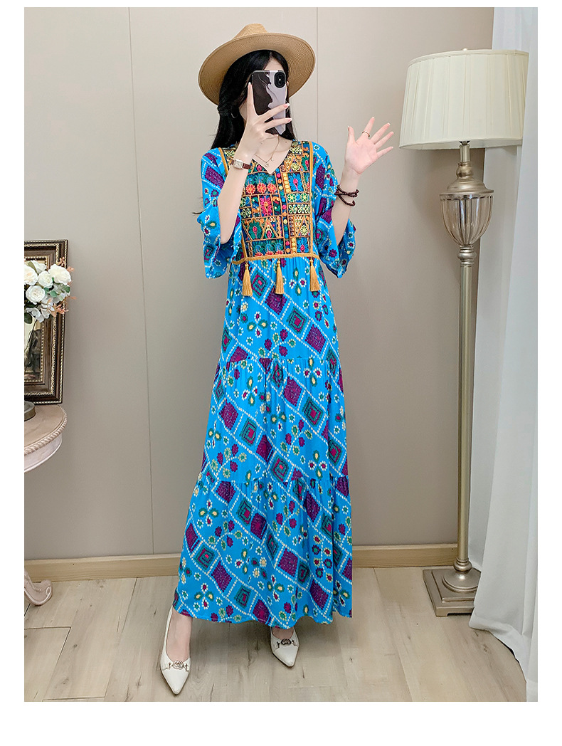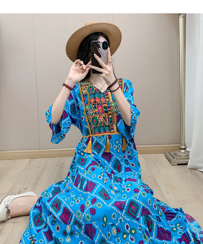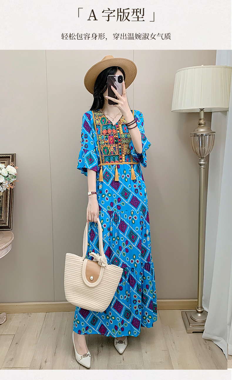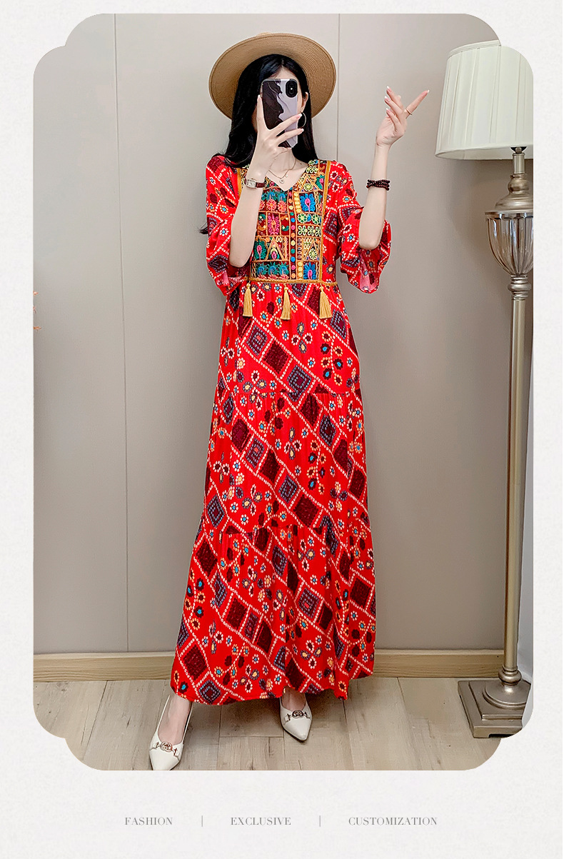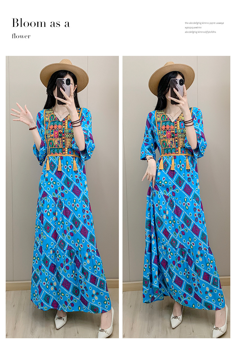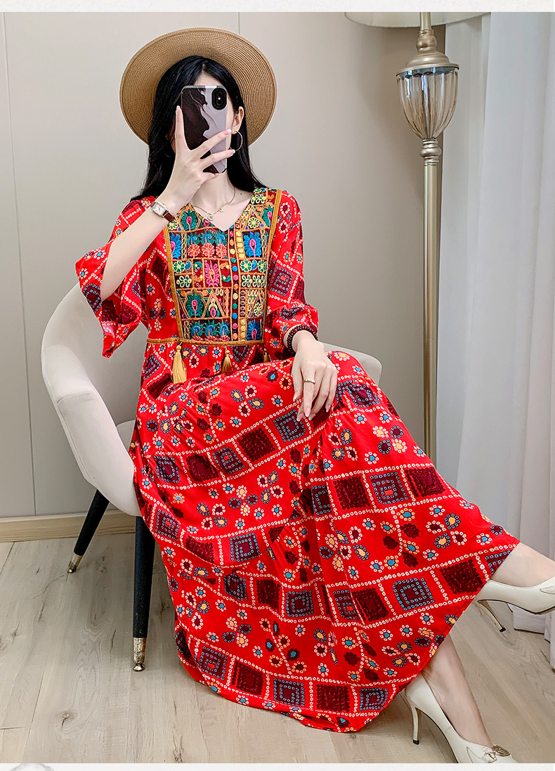 跨境棉绸沙滩裙民族风大摆裙V领中袖连衣裙刺绣复古碎花长裙子女