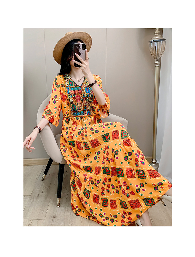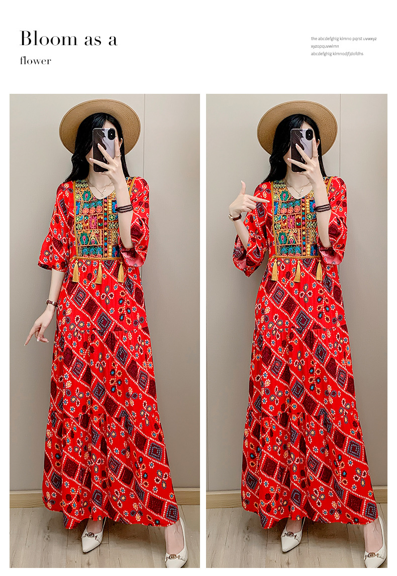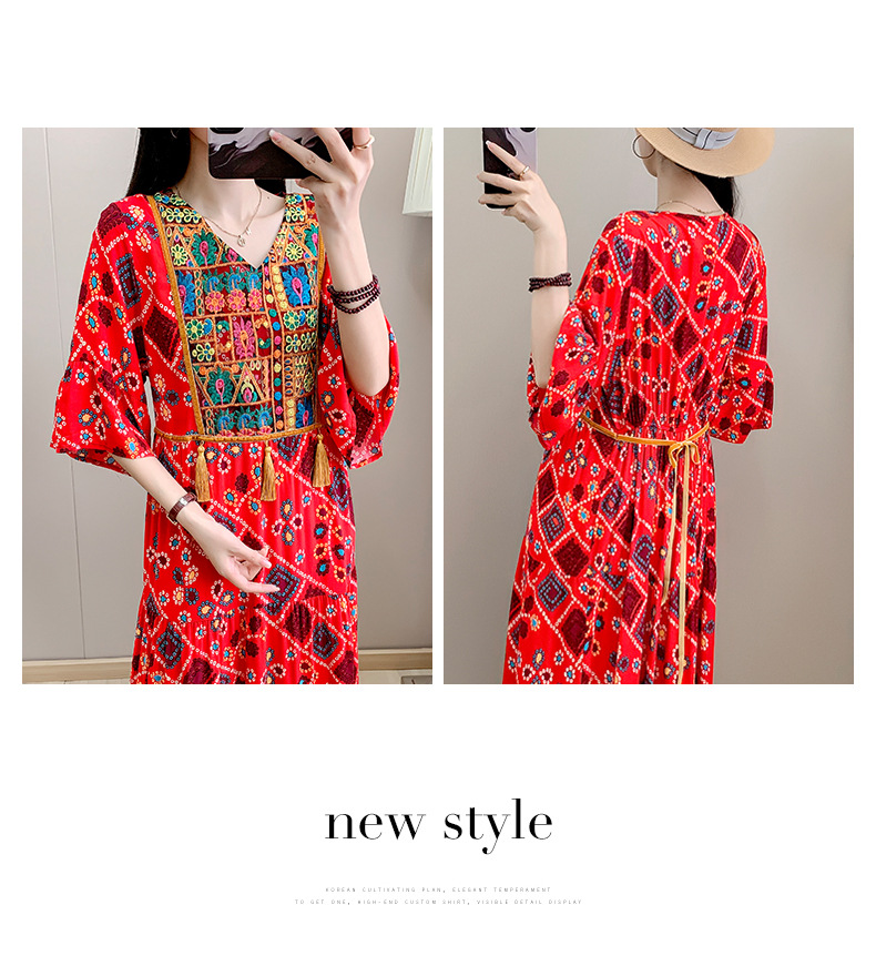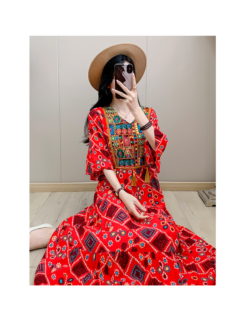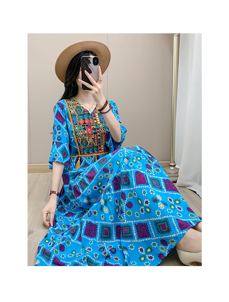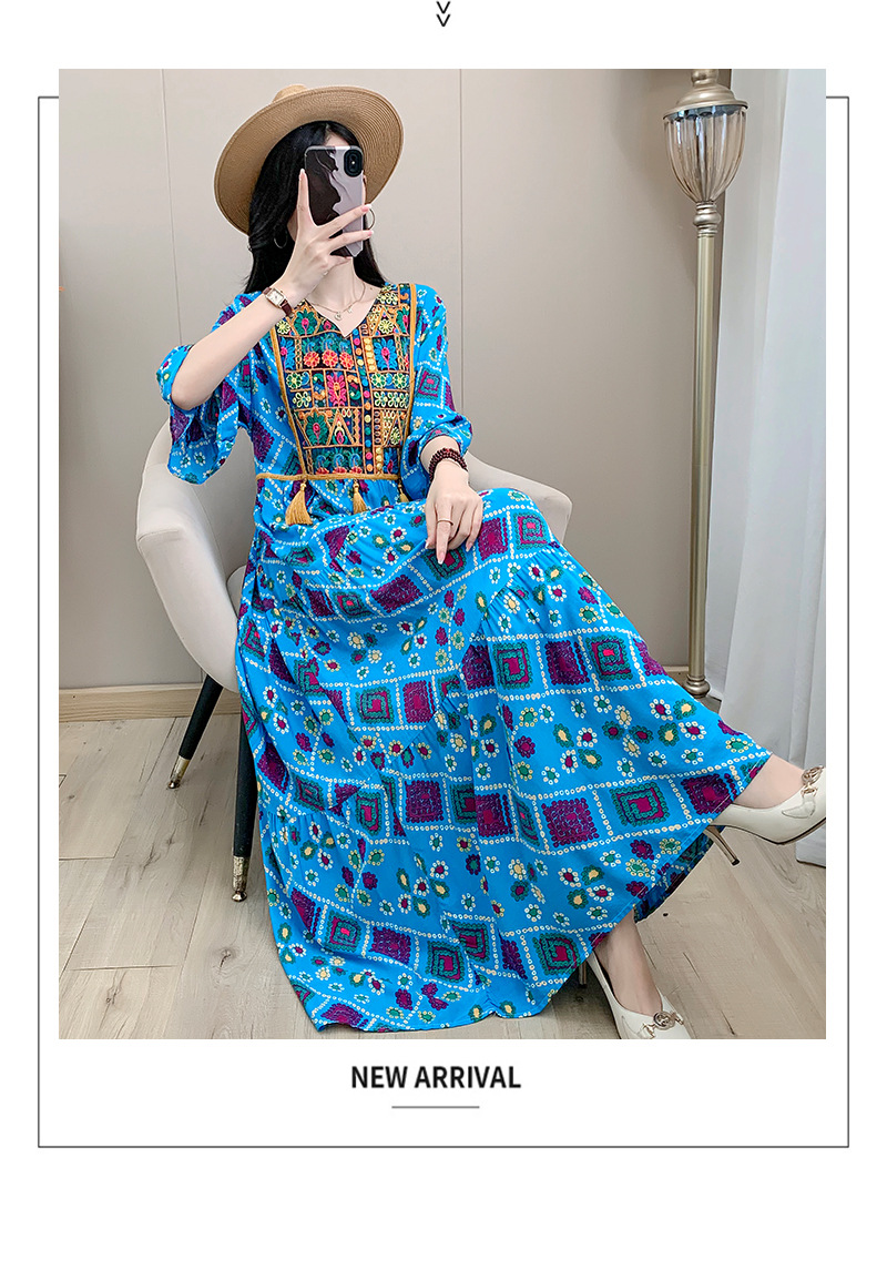跨境棉绸沙滩裙民族风大摆裙V领中袖连衣裙刺绣复古碎花长裙子女