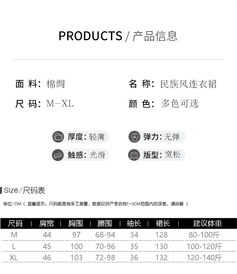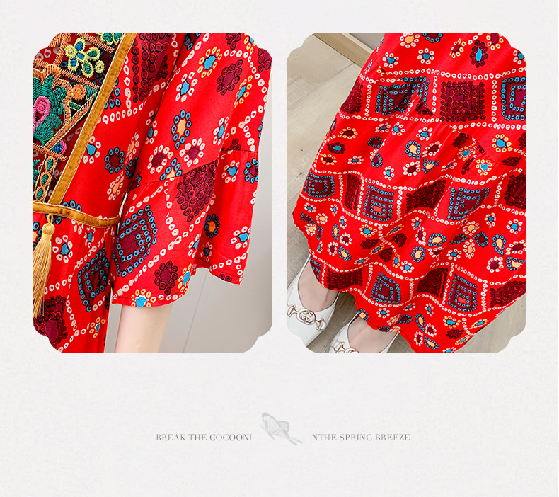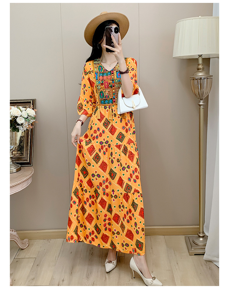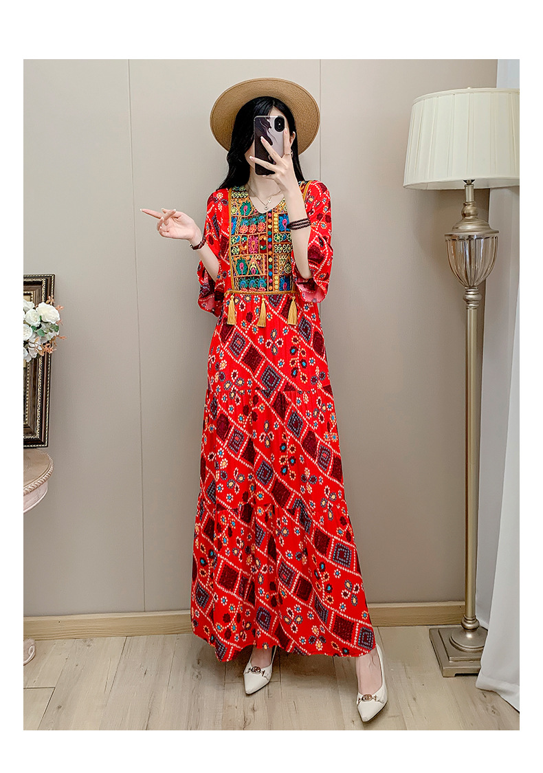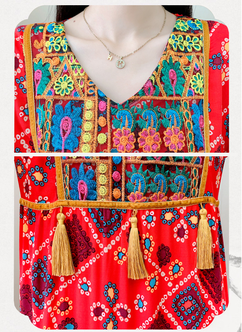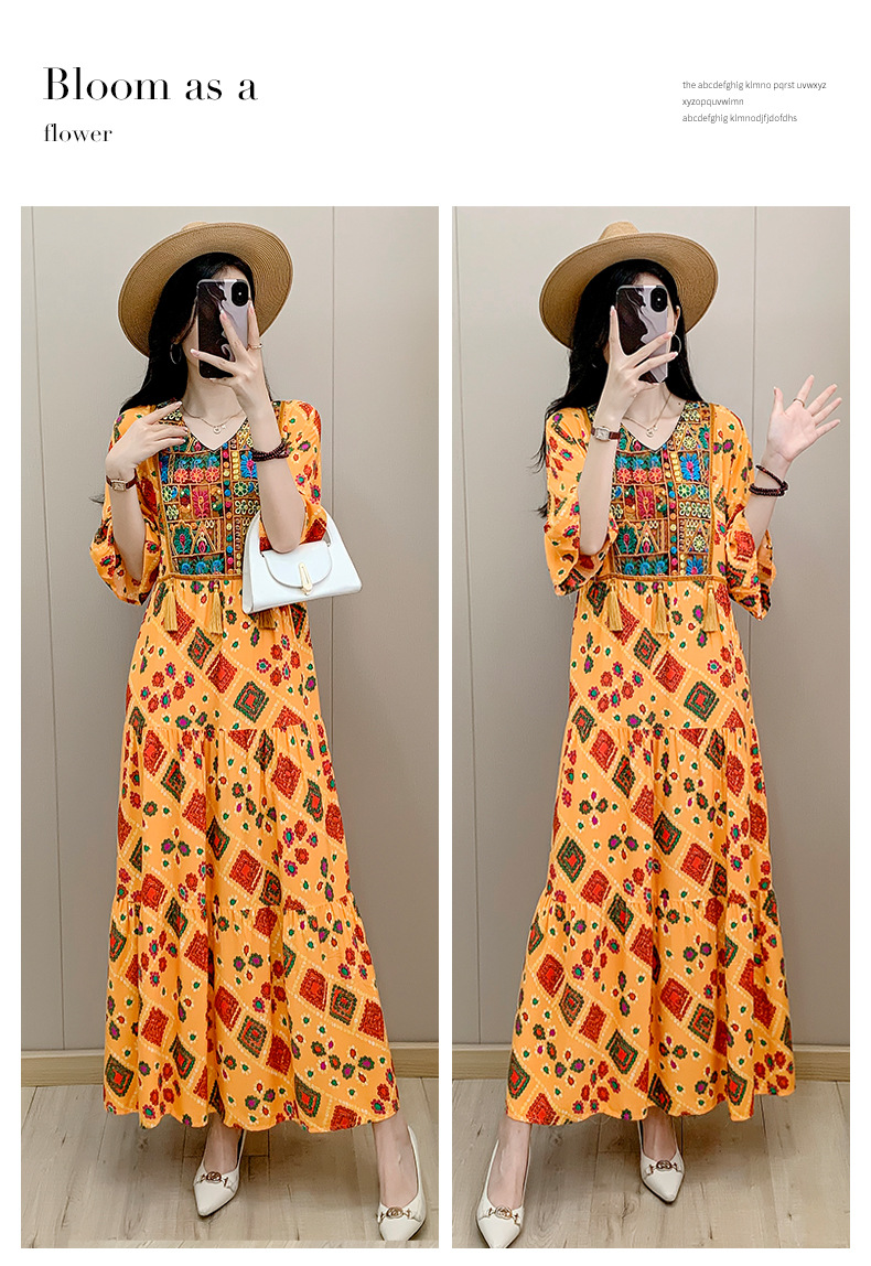 跨境棉绸沙滩裙民族风大摆裙V领中袖连衣裙刺绣复古碎花长裙子女