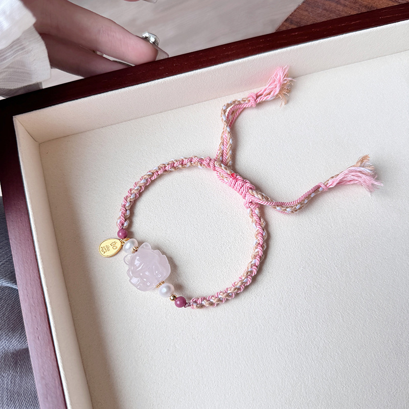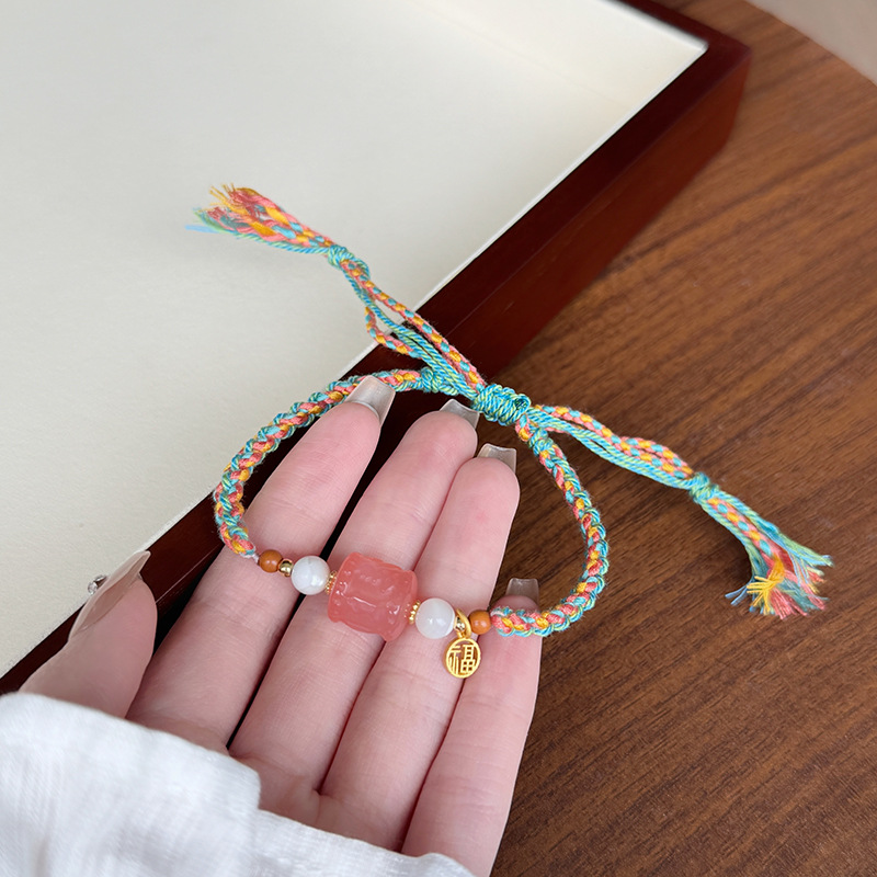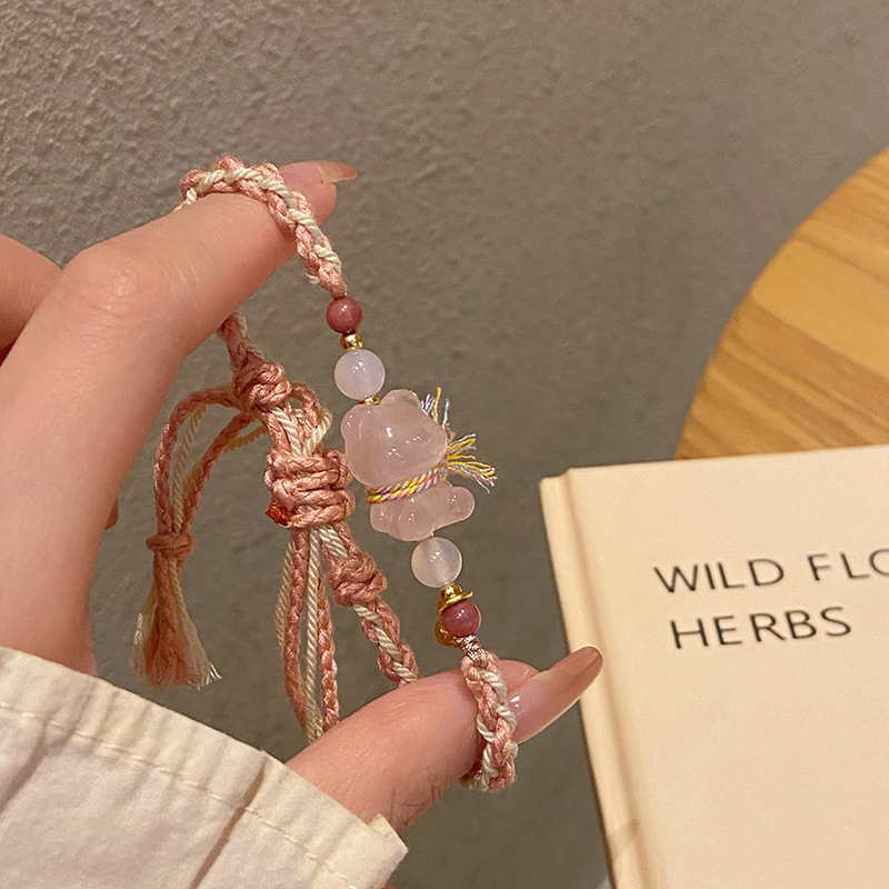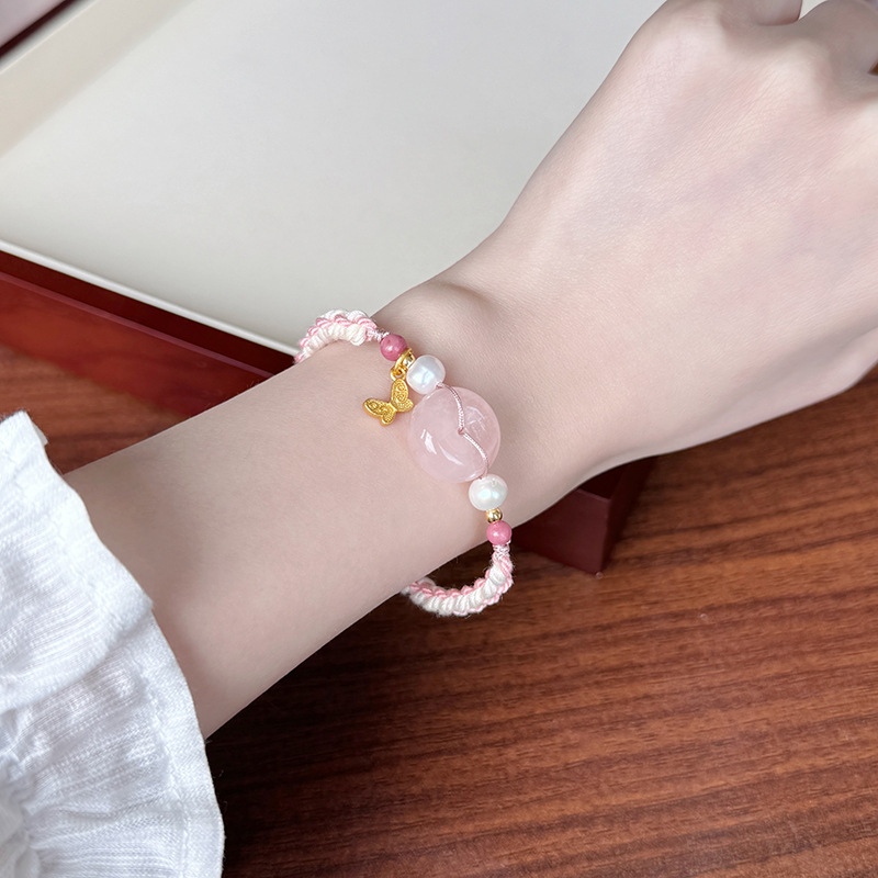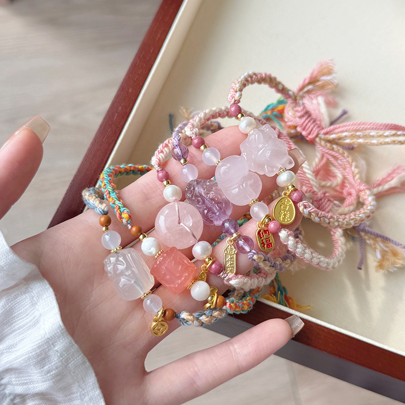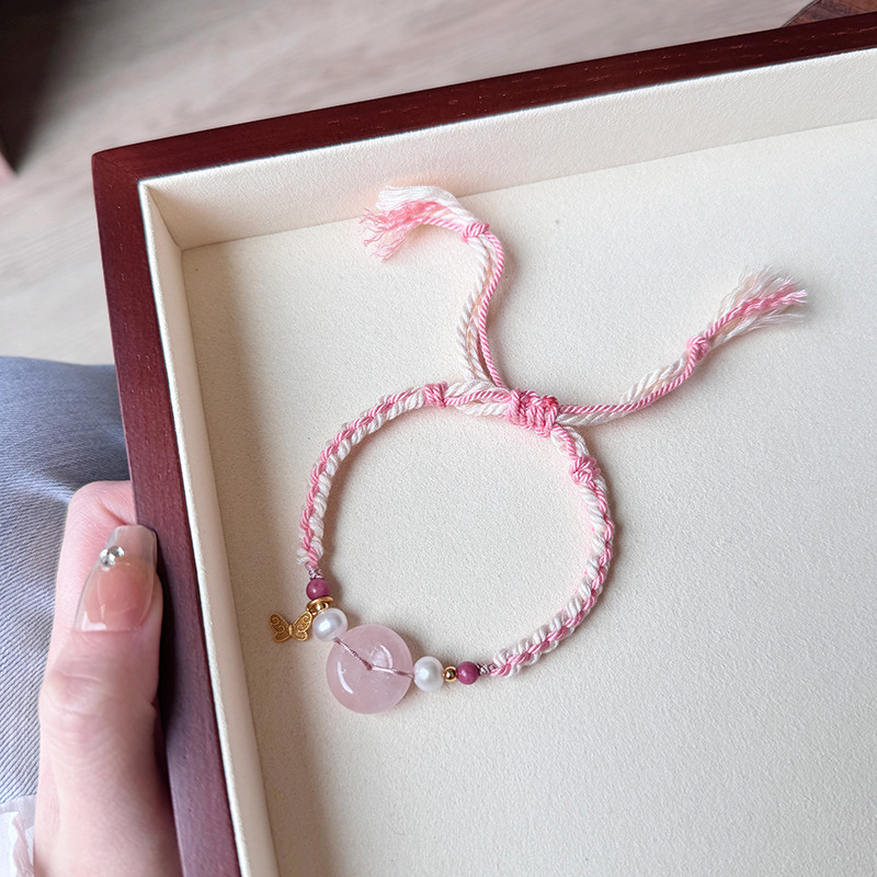 Tali Tangan Anyaman Tenun Gaya Etnik Gaya Xizang Super Peri Manis Lembut Alami Kristal Merah Muda Gesper Ping An Liontin Gelang Amethyst