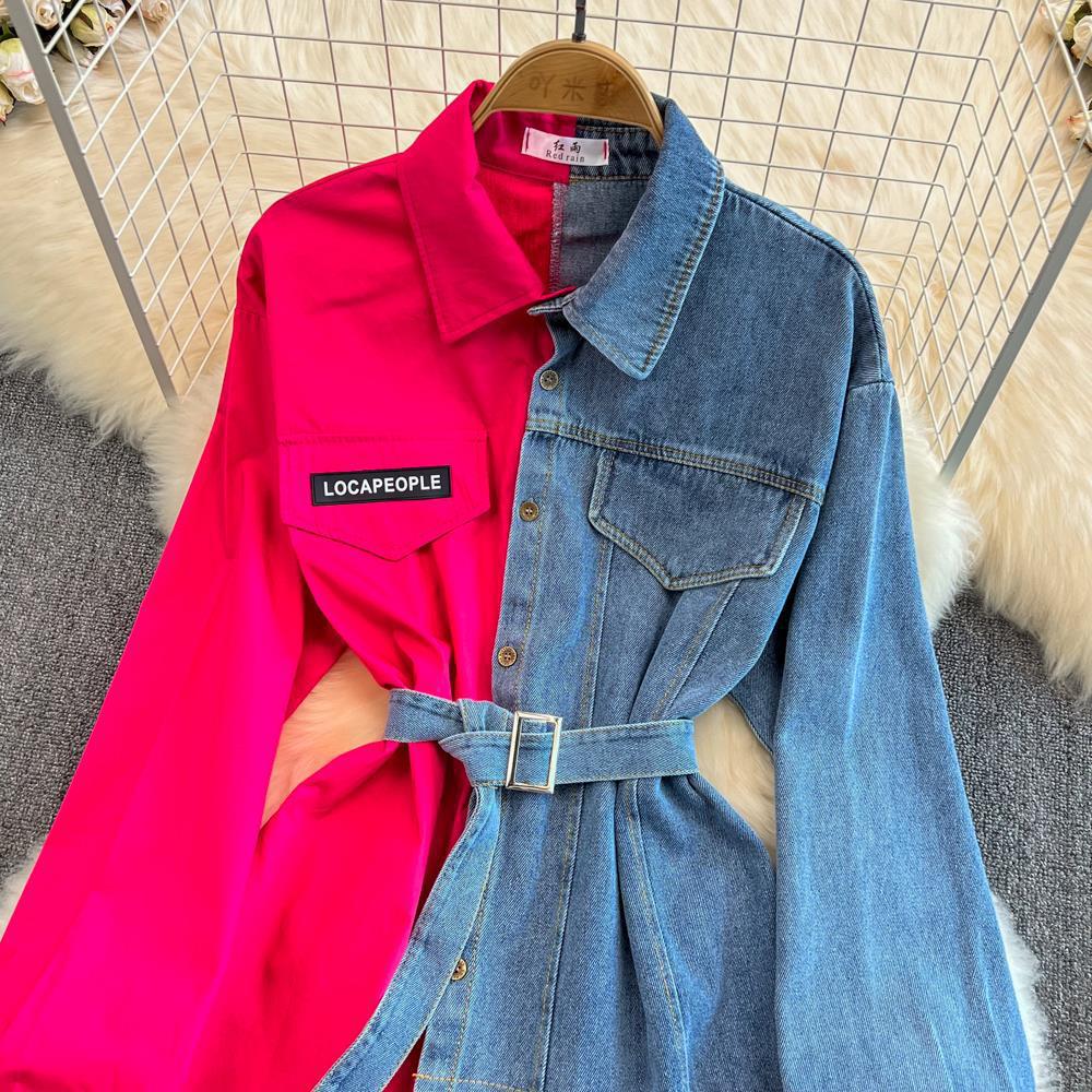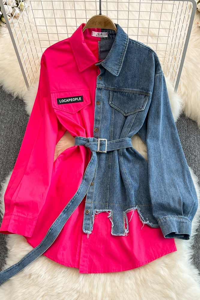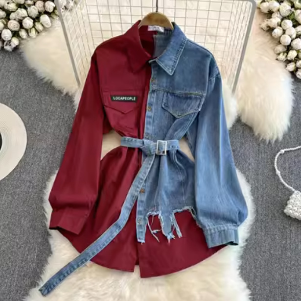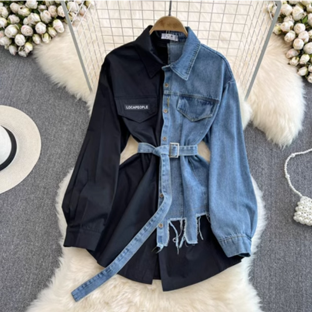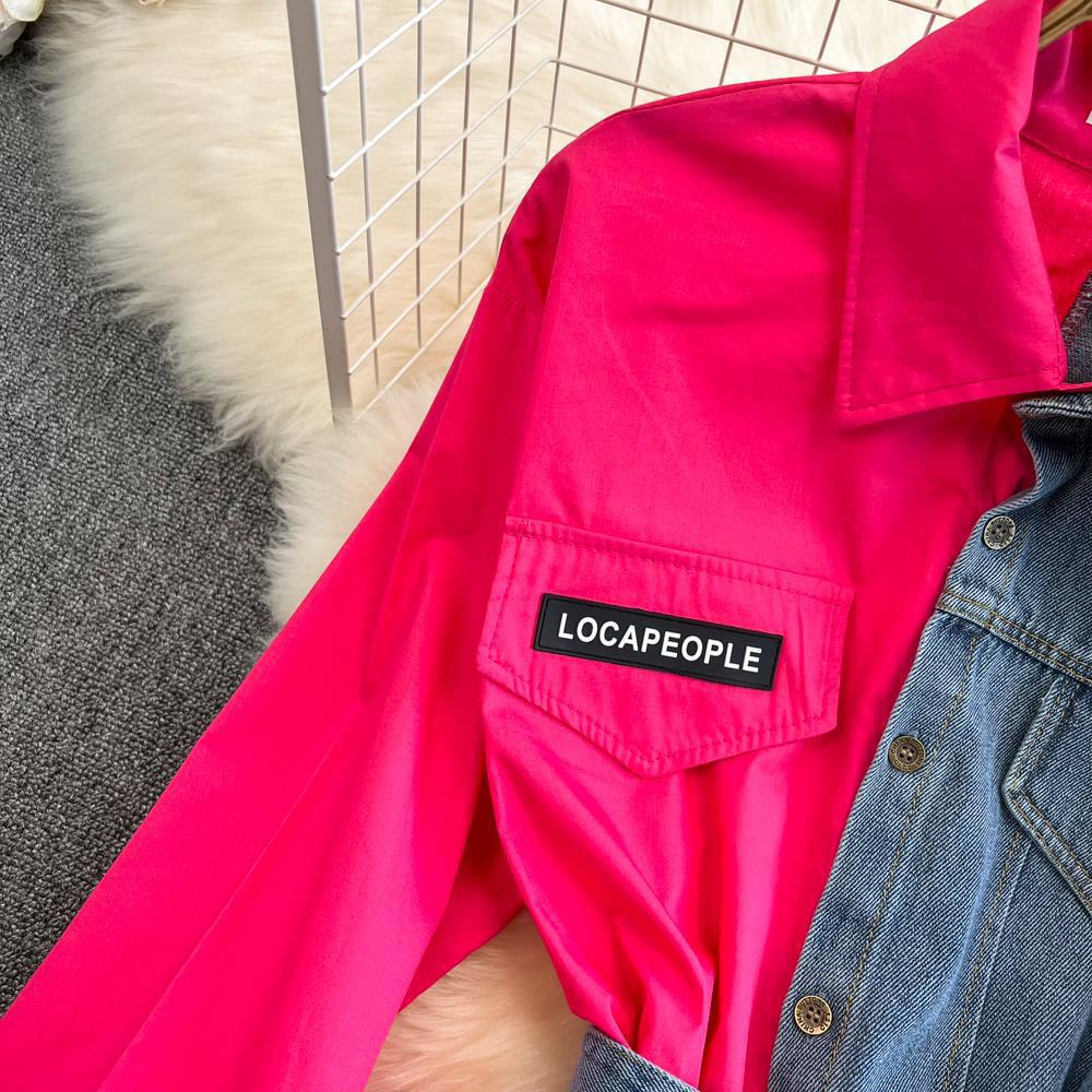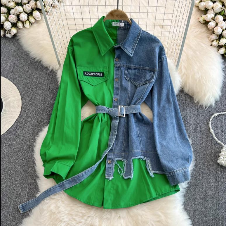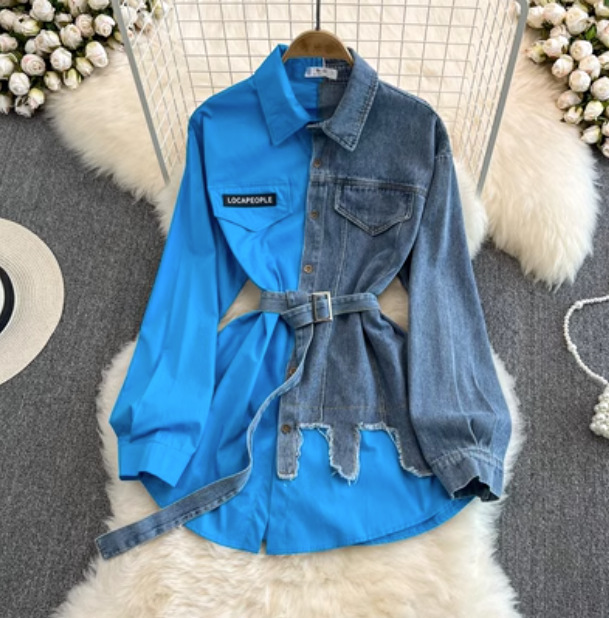 2024休闲风日韩休闲开衫衬衫领宽松型衬衫秋冬女收腰拼接高级个性