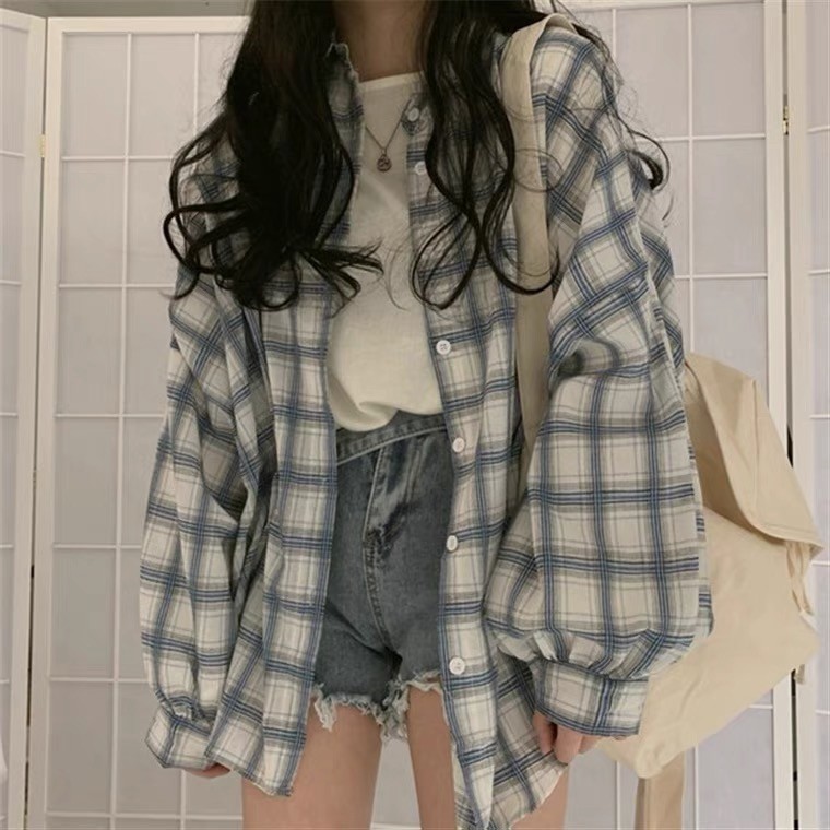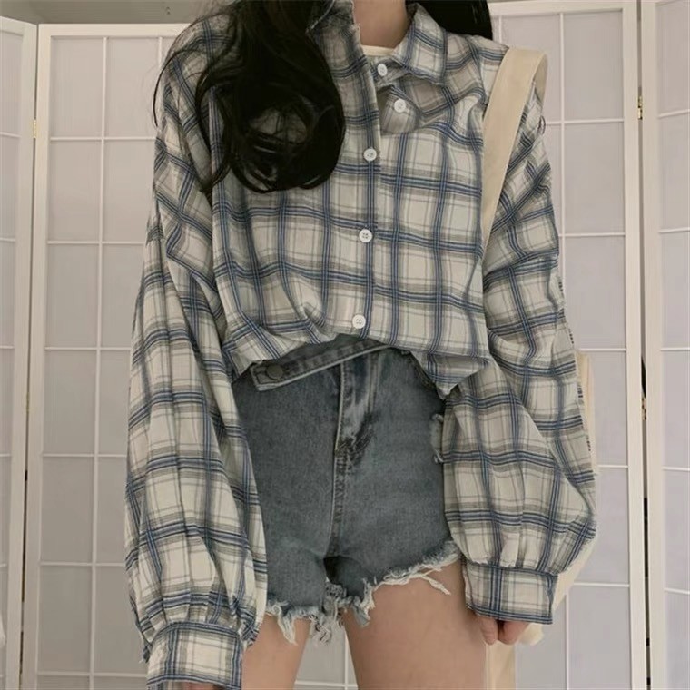 2023 musim panas baru gaya preppy segar kemeja kotak-kotak siswa perempuan Semua cocok longgar mantel lengan panjang menengah modis