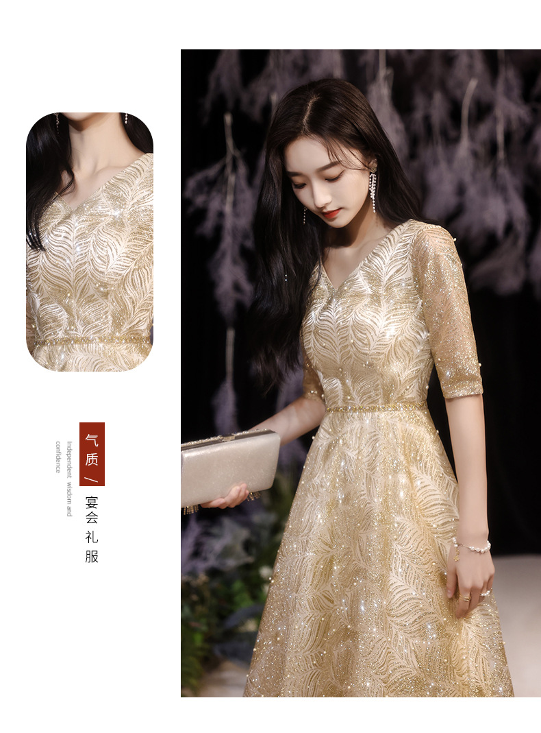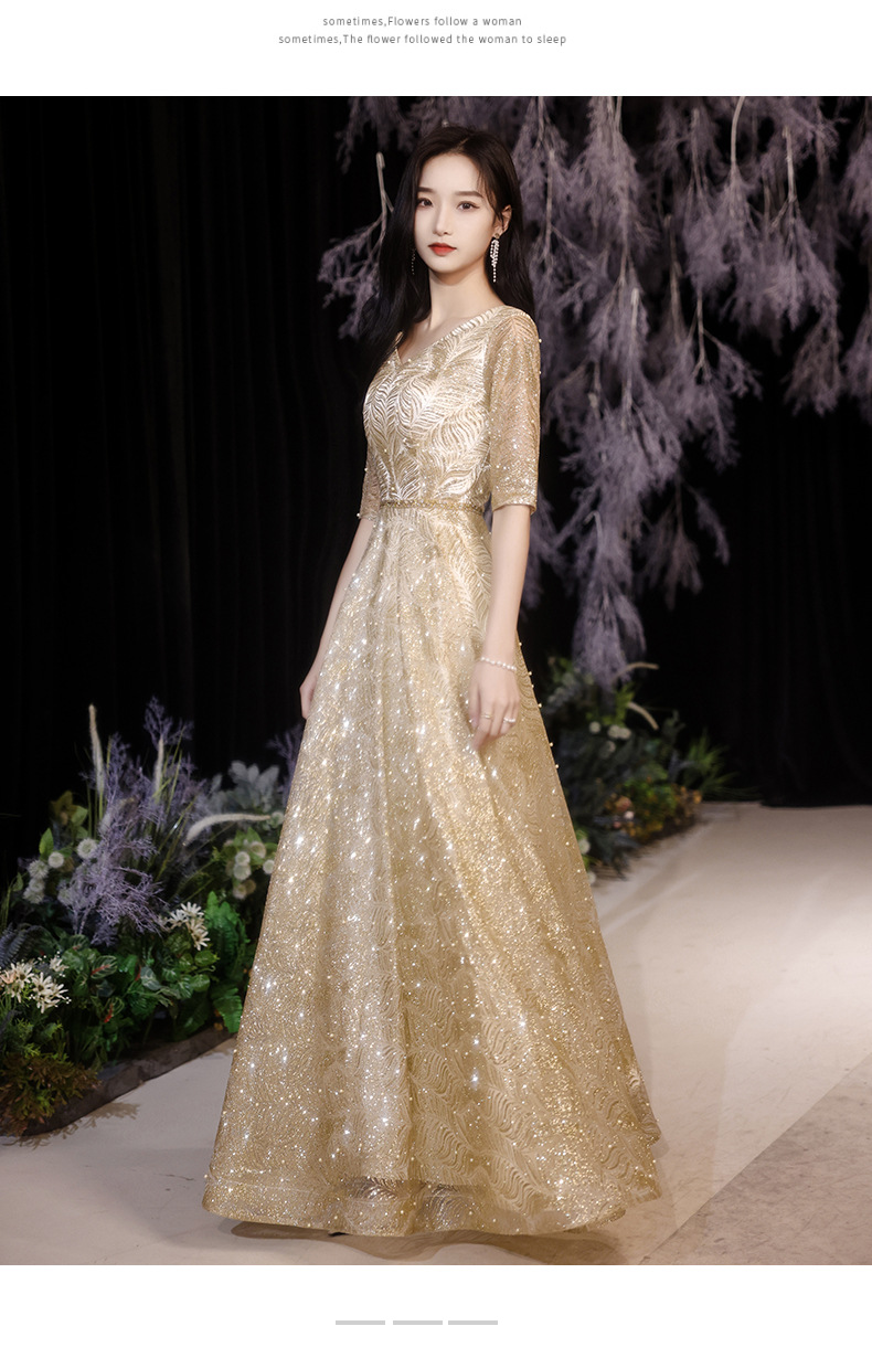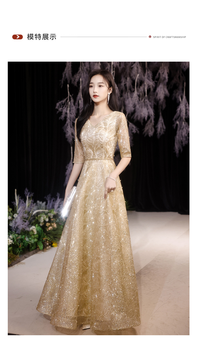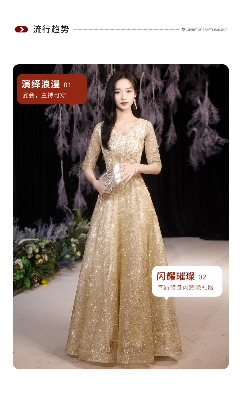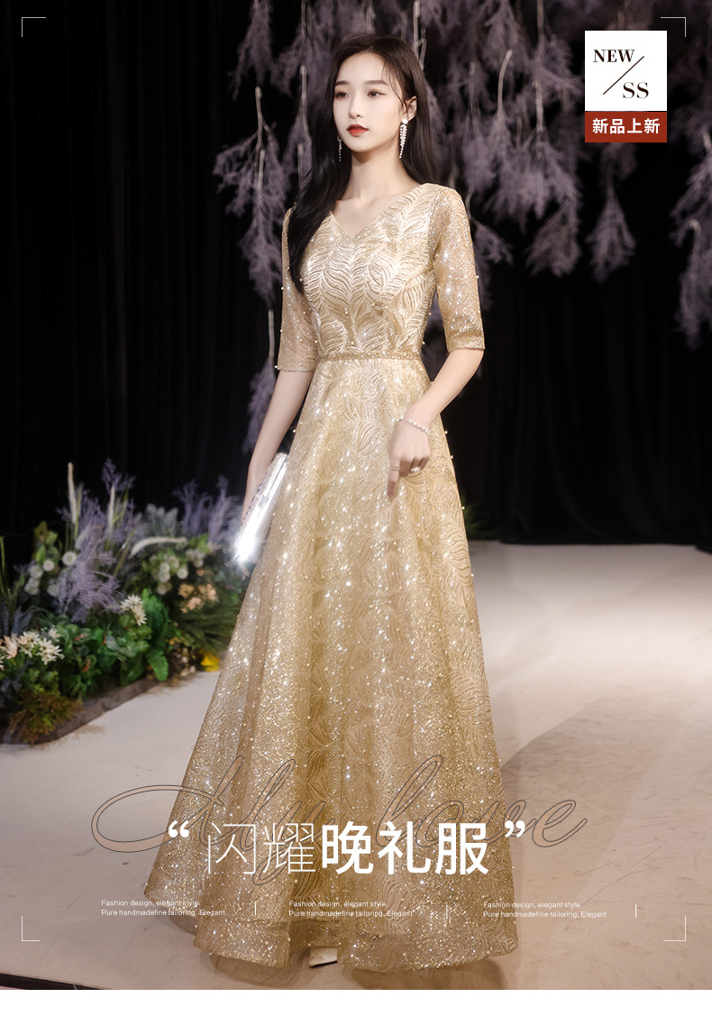 金色演出礼服连衣裙女宴会星空年会主持人大合唱团表演出晚礼服裙
