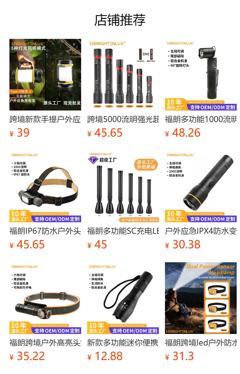 本品集高亮照明与移动充电功能于一体,搭载1颗XTE LED主灯+COB白/红光侧灯,ABS+PC外壳兼顾耐用与透光性,IP44级防水防尘适配户外复杂场景。外观简约大气,功能全面实用,既是露营照明神器,也是应急充电保障。