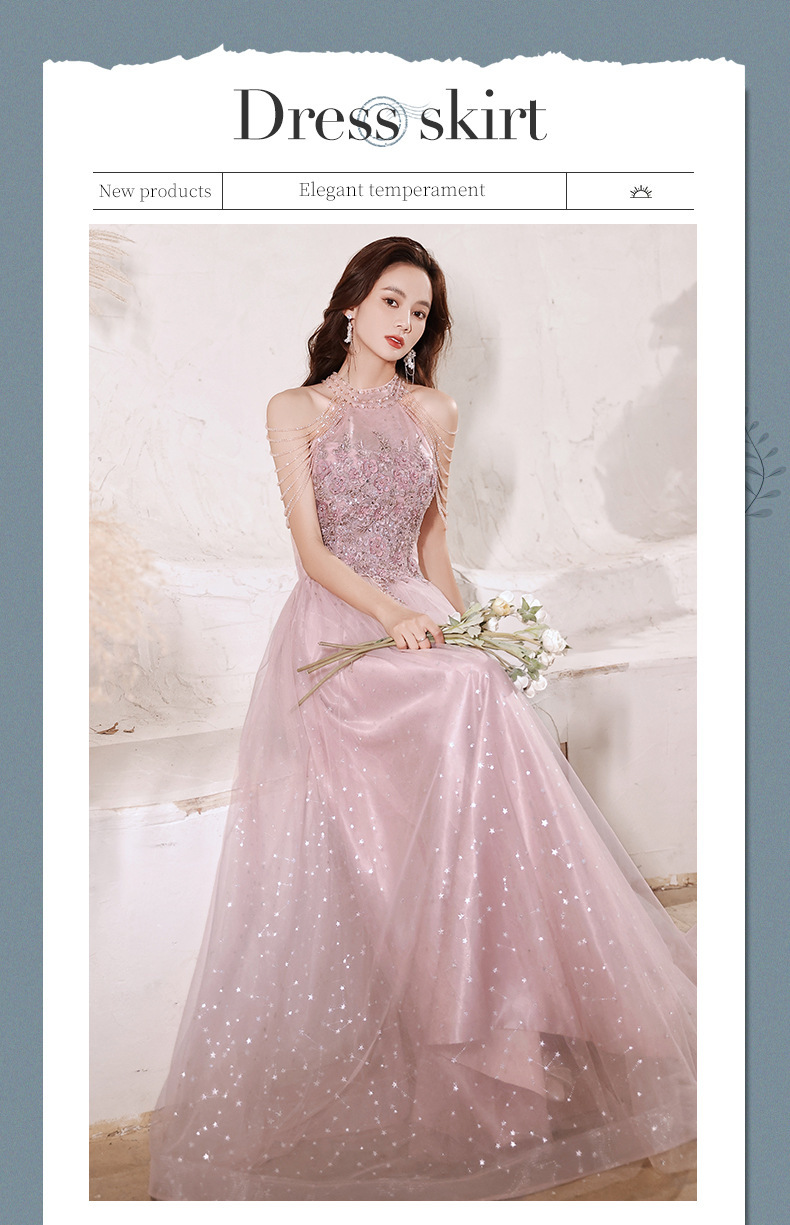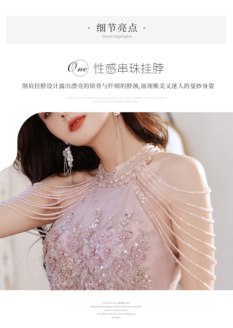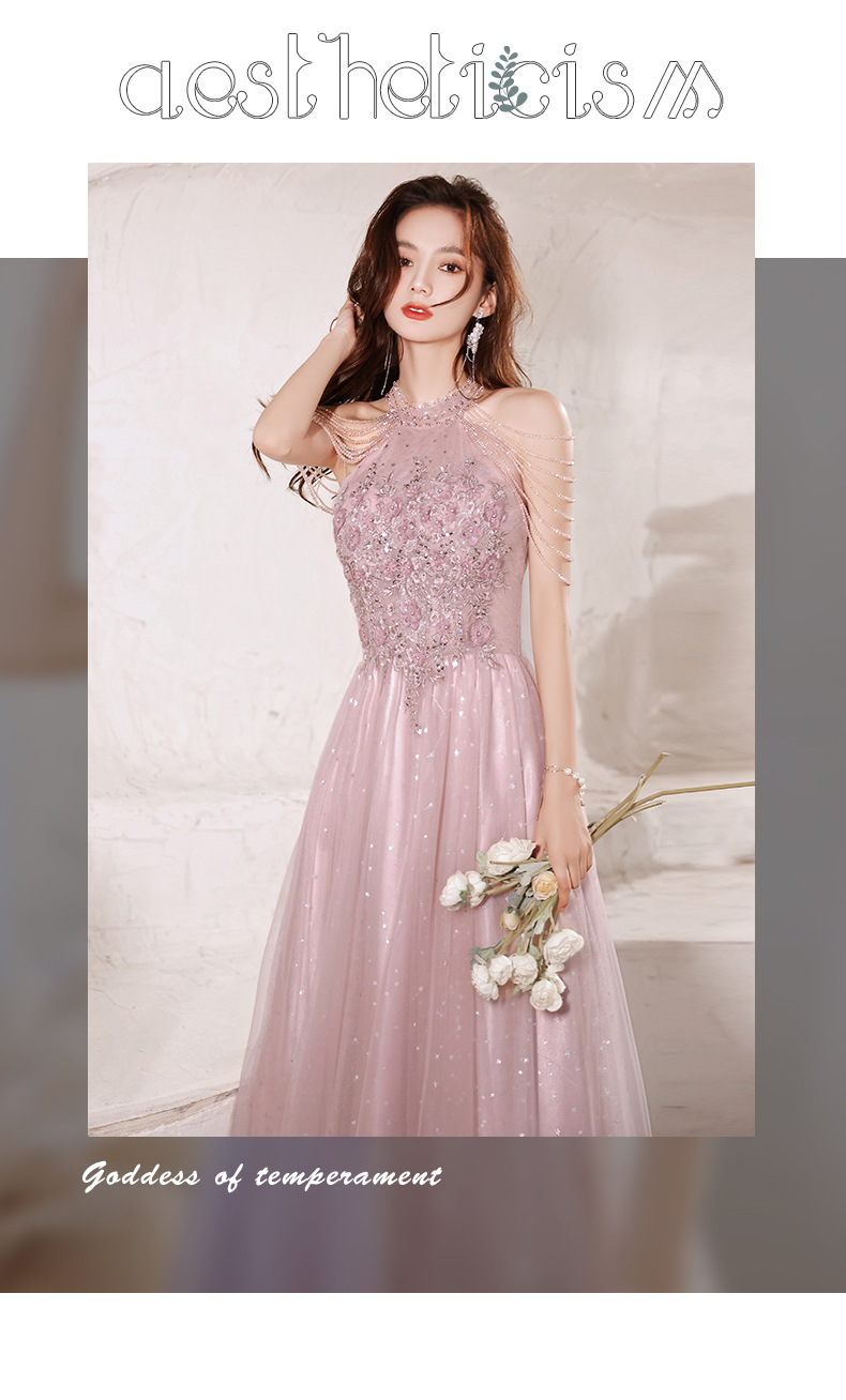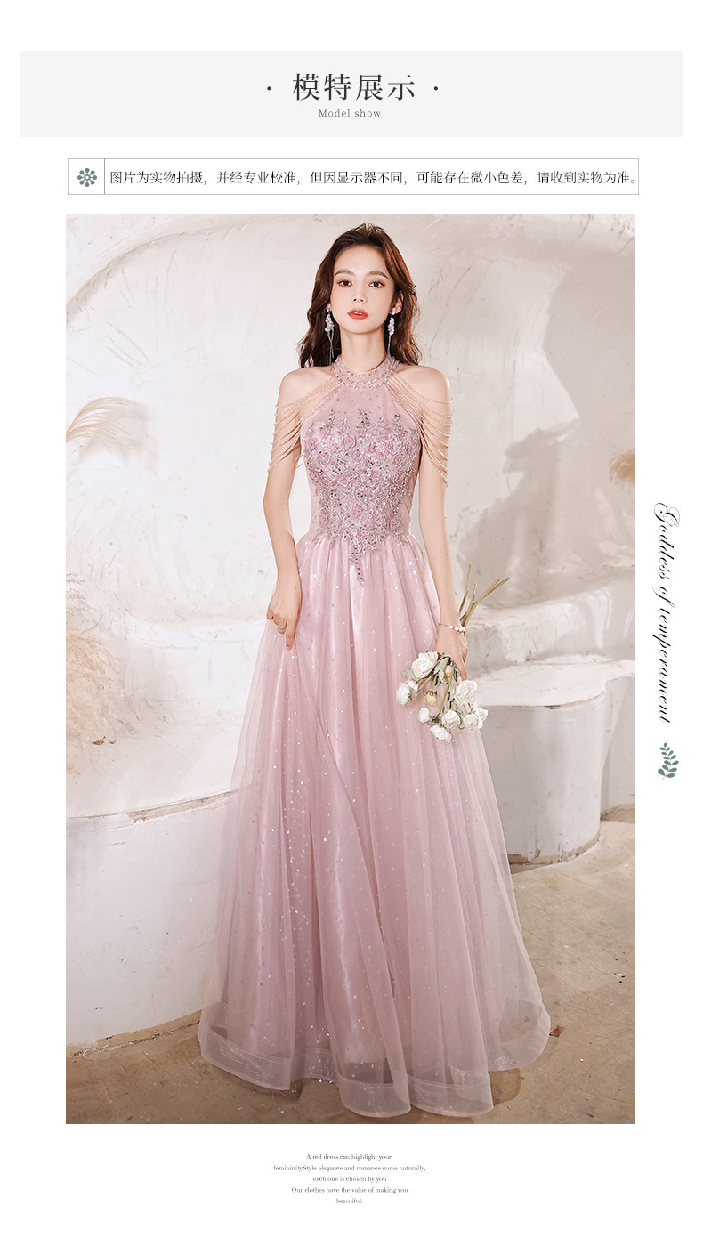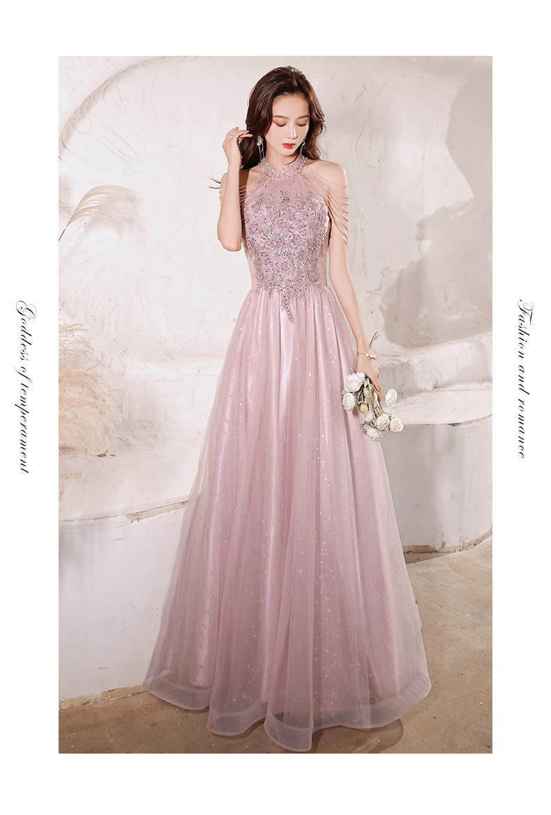 Gaun malam warna pink untuk wanita, model halter neck, gaya baru 2026, elegan dan mewah, cocok untuk pesta, pengiring pengantin, pertunangan, ulang tahun, dan acara penyambutan.