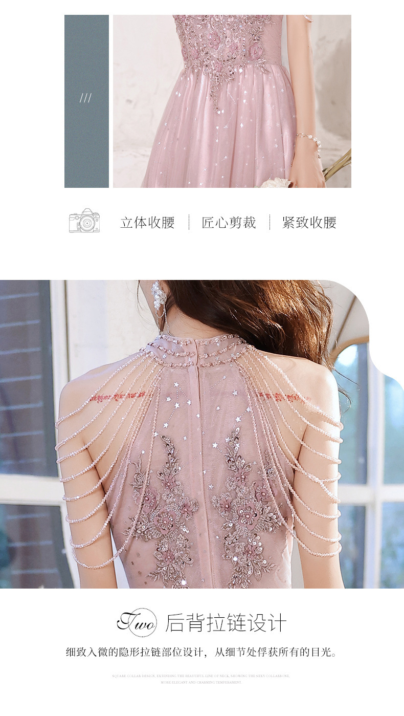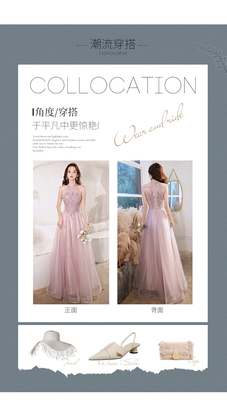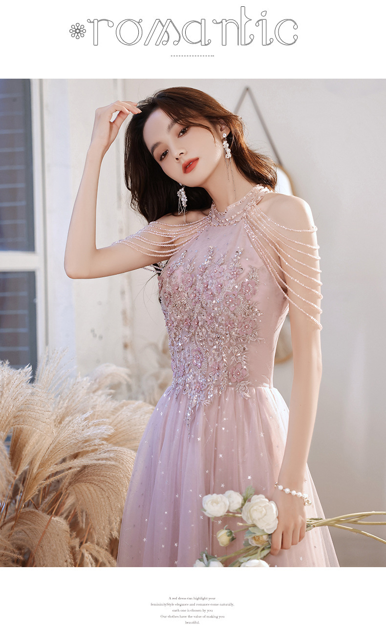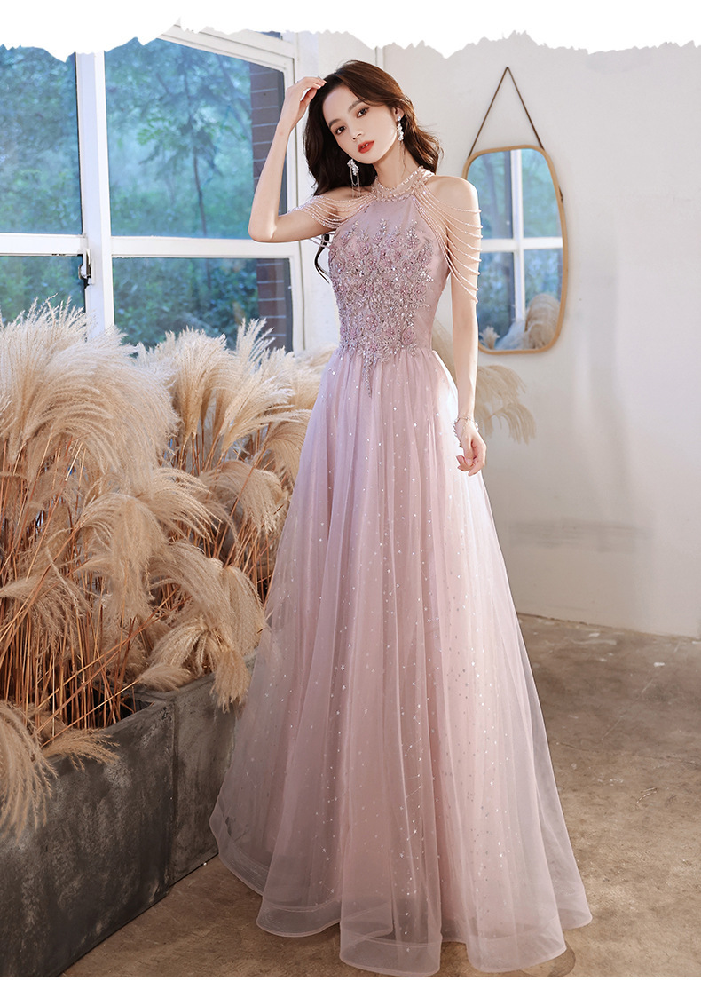 Gaun malam warna pink untuk wanita, model halter neck, gaya baru 2026, elegan dan mewah, cocok untuk pesta, pengiring pengantin, pertunangan, ulang tahun, dan acara penyambutan.