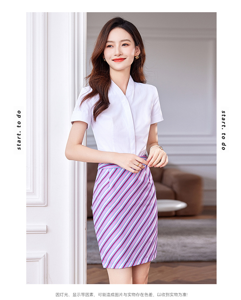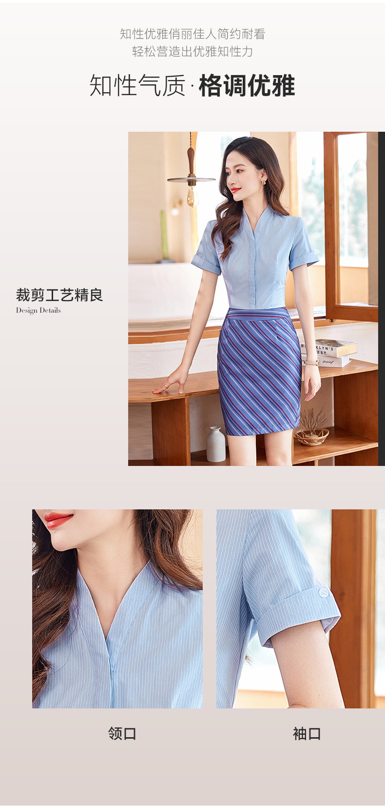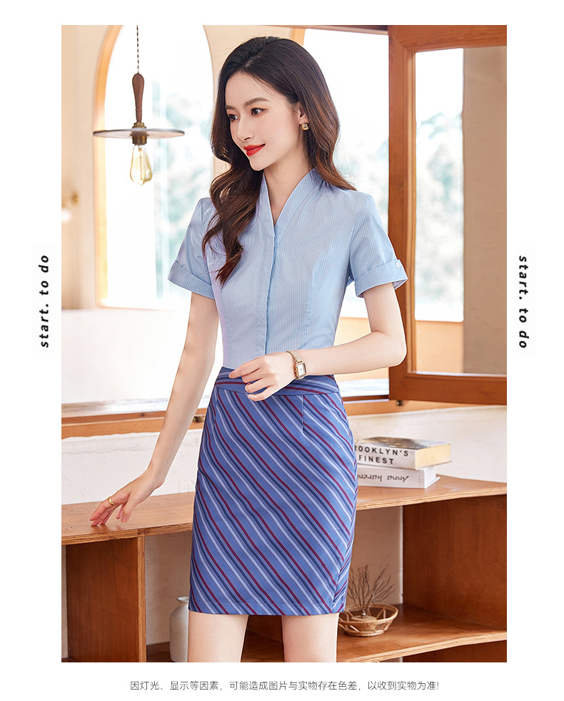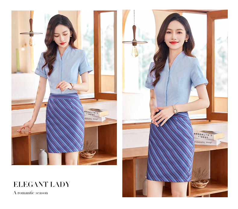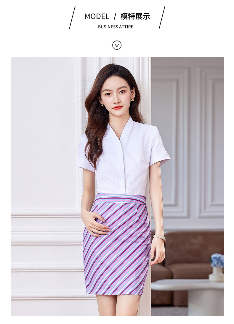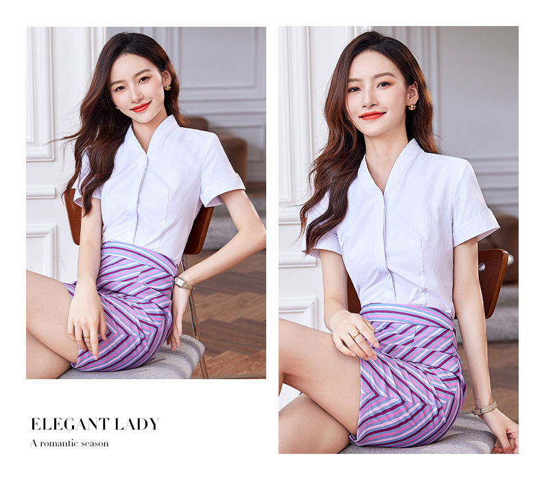 Setelan profesional kemeja bergaris putih kemeja lengan pendek musim panas wanita seragam pramugari salon kecantikan pakaian kerja meja depan inci pakaian
