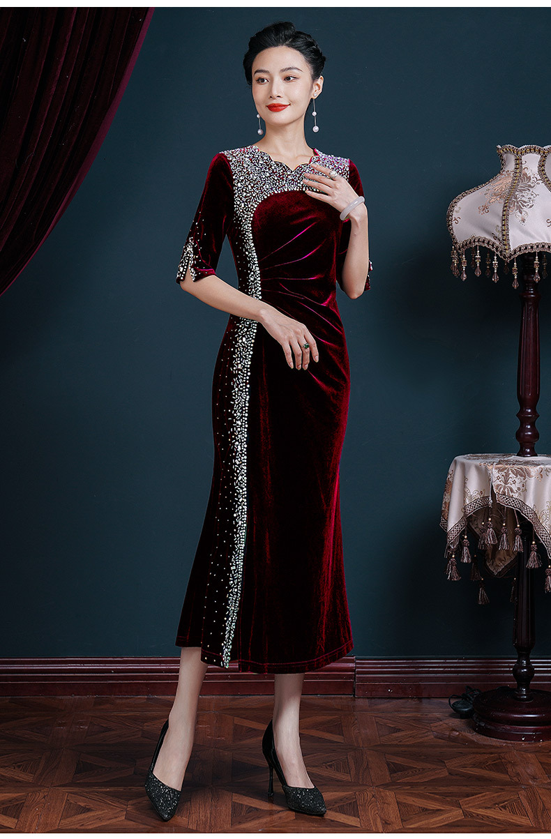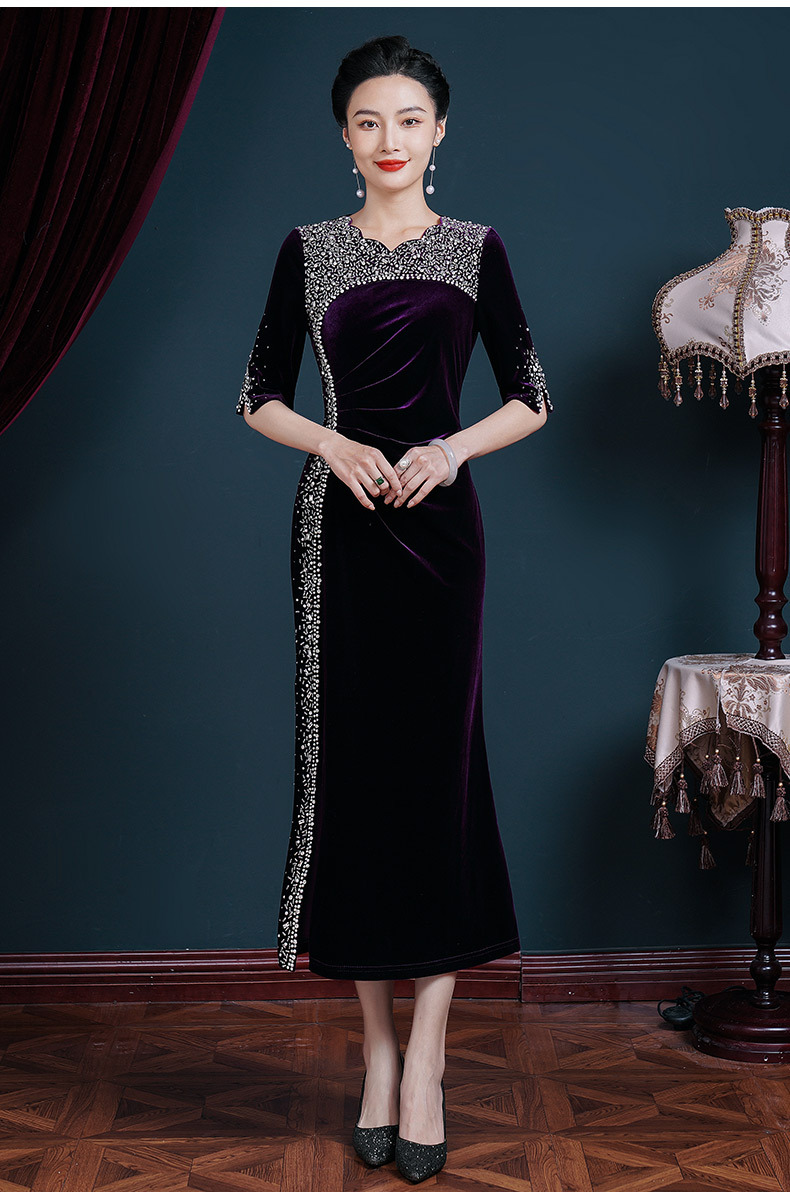 Gaun malam cheongsam paruh baya dan lansia, gaun pesta pernikahan bermanik buatan tangan untuk ibu paruh baya dan lansia ukuran plus beludru emas panjang