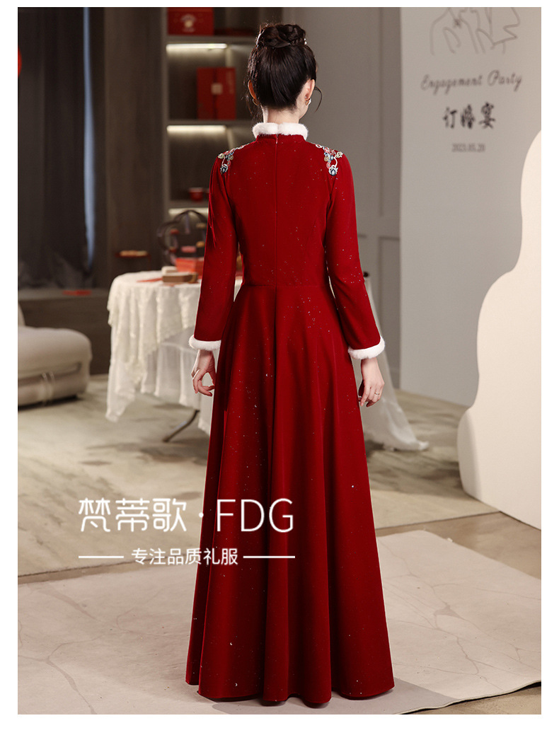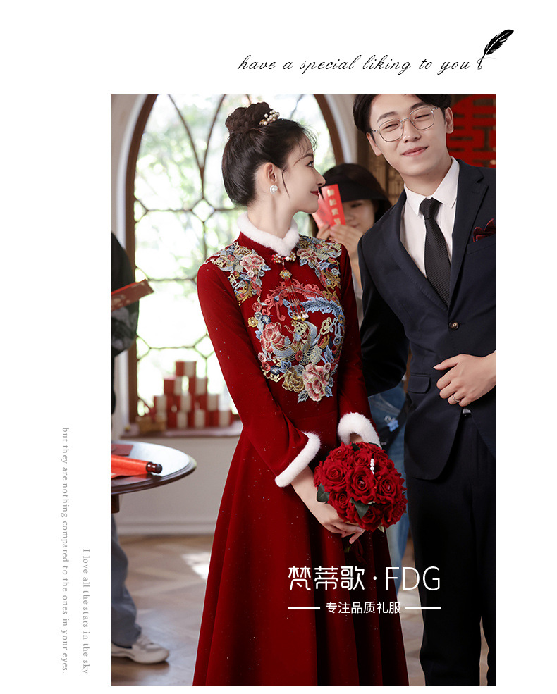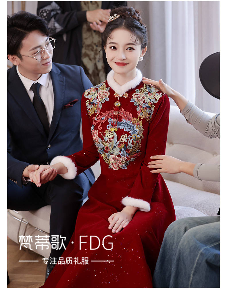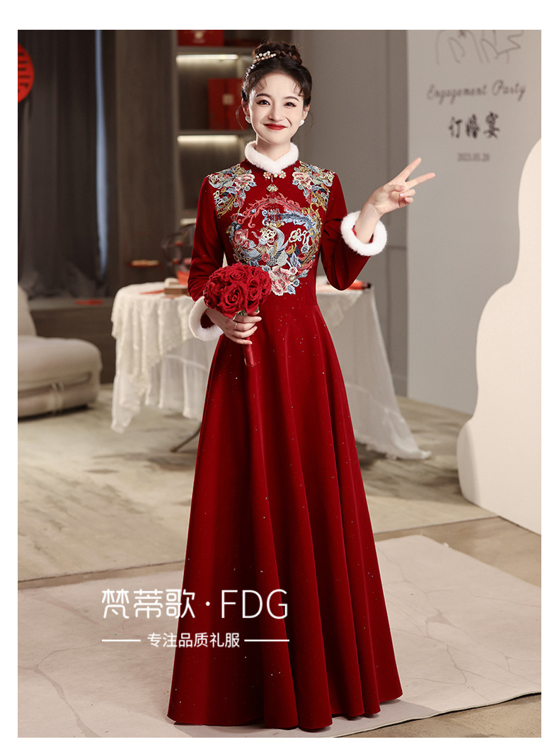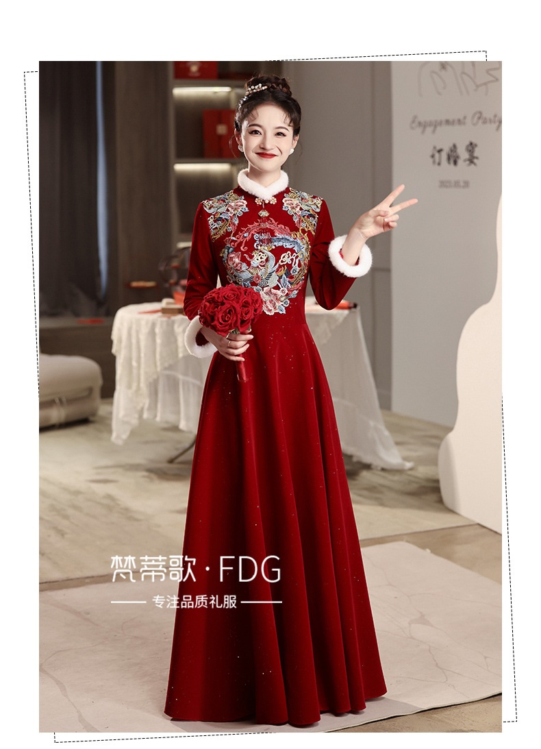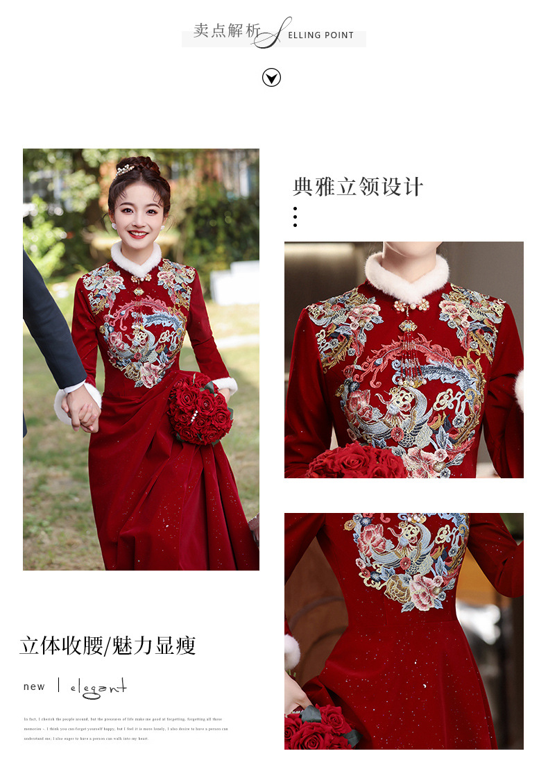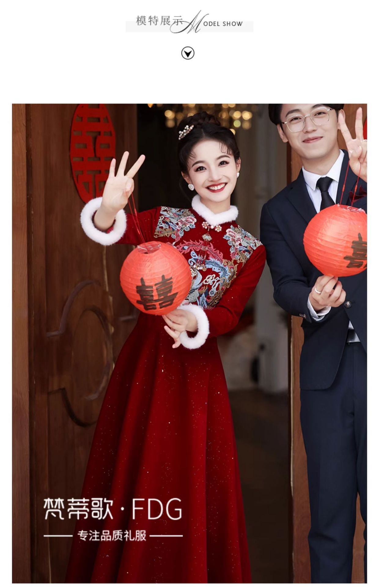 Gaun qipao pengantin Hanfu bergaya Cina baru untuk pesta pernikahan, gaun Xiuhe untuk pertunangan, gaun malam lengan panjang berlapis bulu domba yang hangat.