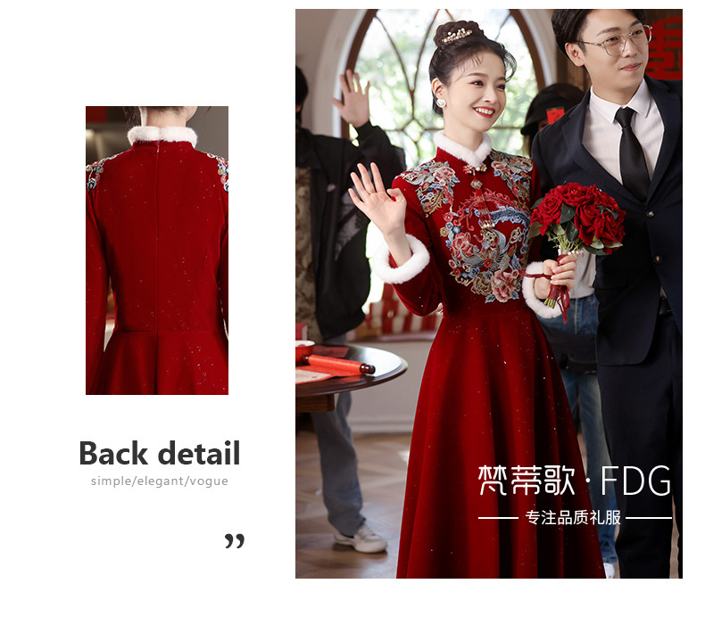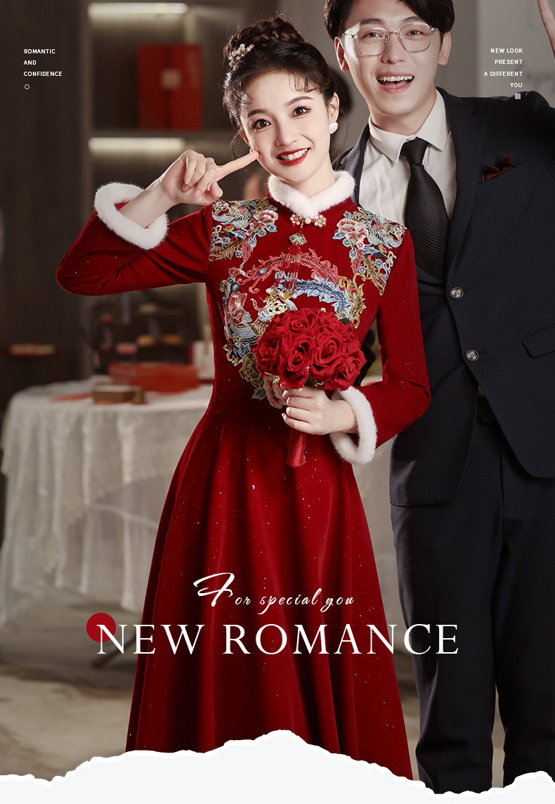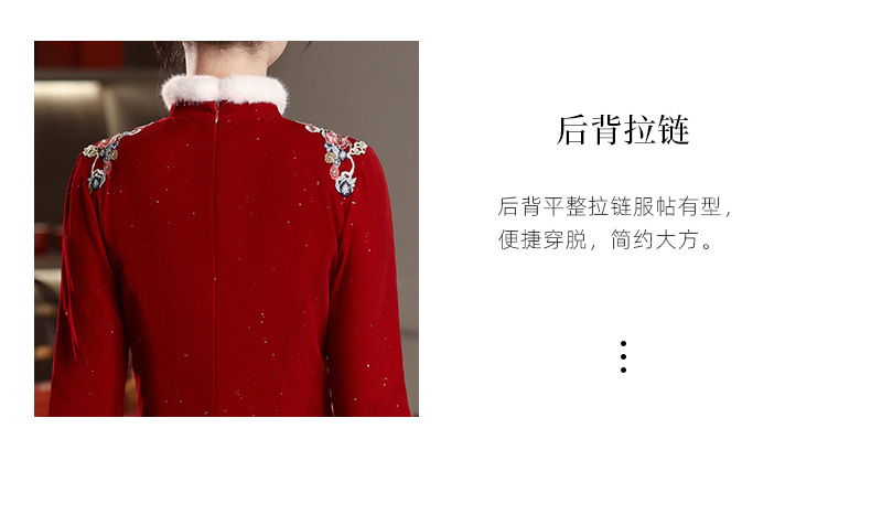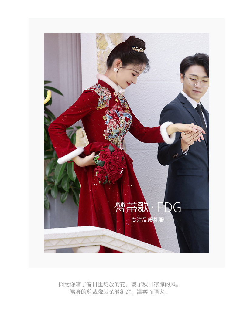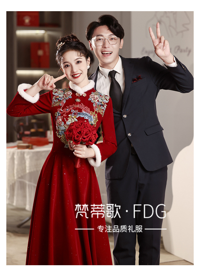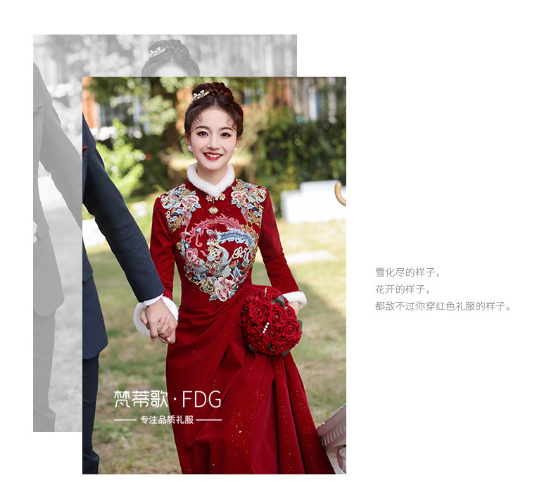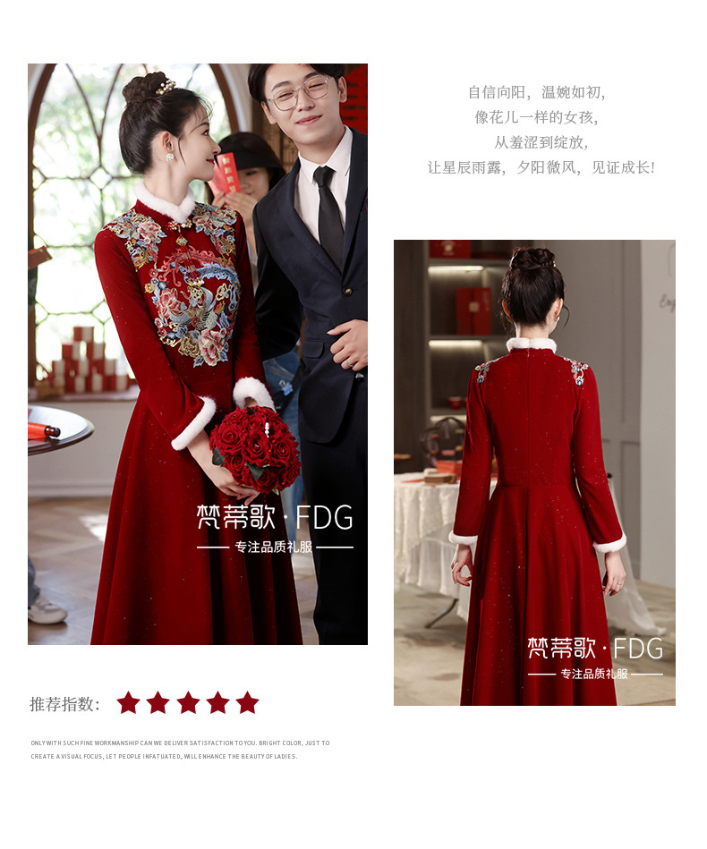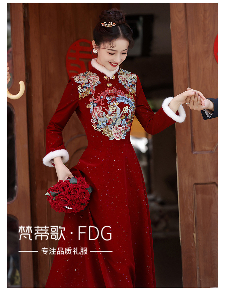 Gaun qipao pengantin Hanfu bergaya Cina baru untuk pesta pernikahan, gaun Xiuhe untuk pertunangan, gaun malam lengan panjang berlapis bulu domba yang hangat.