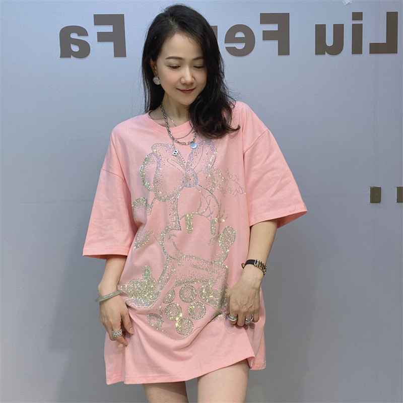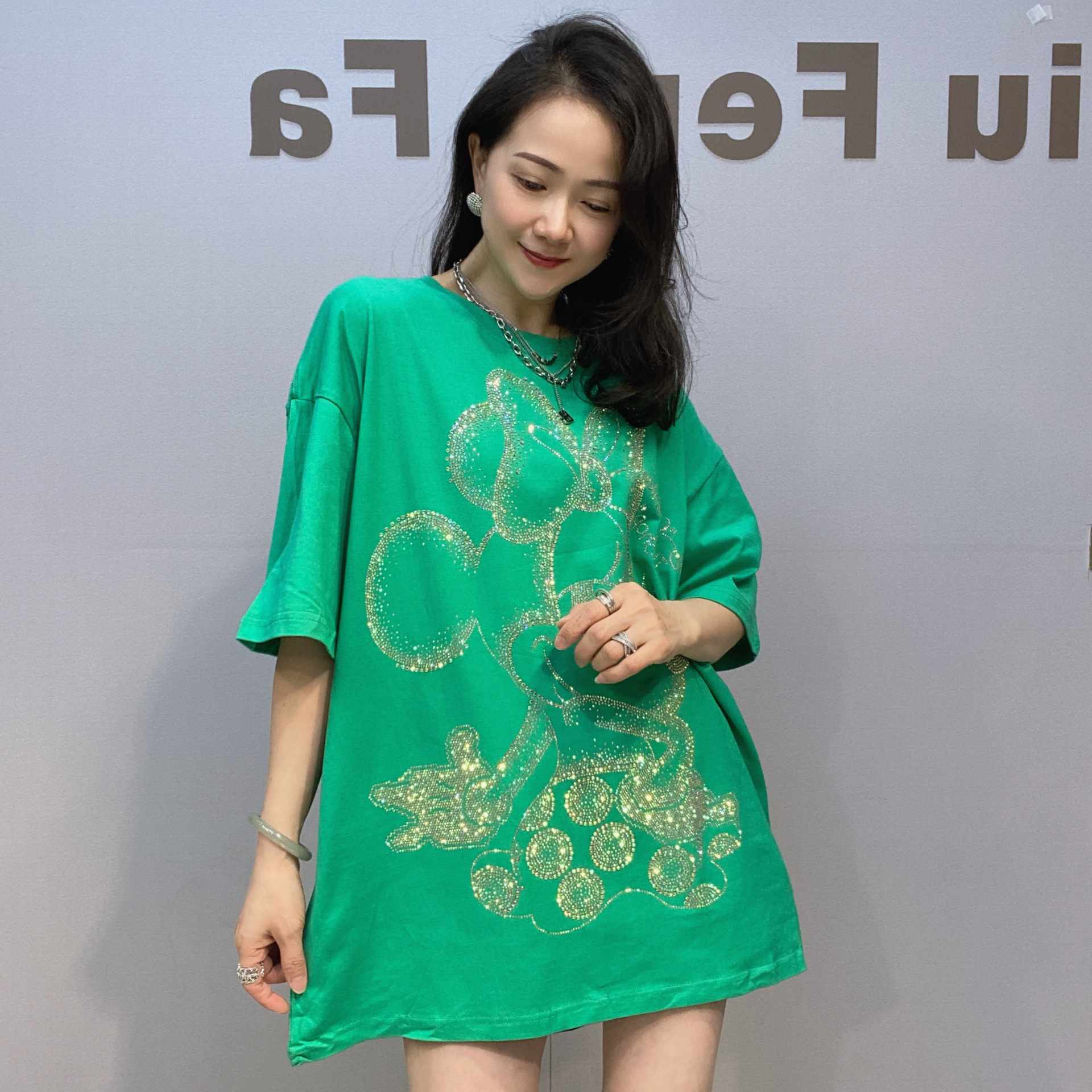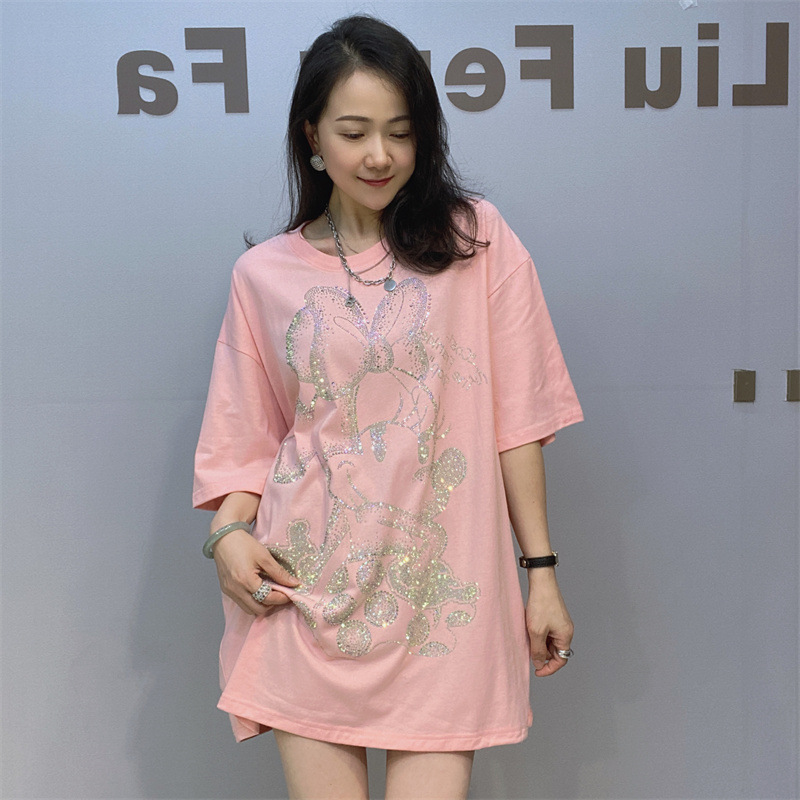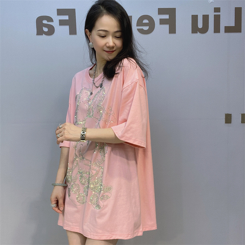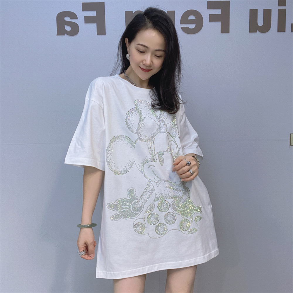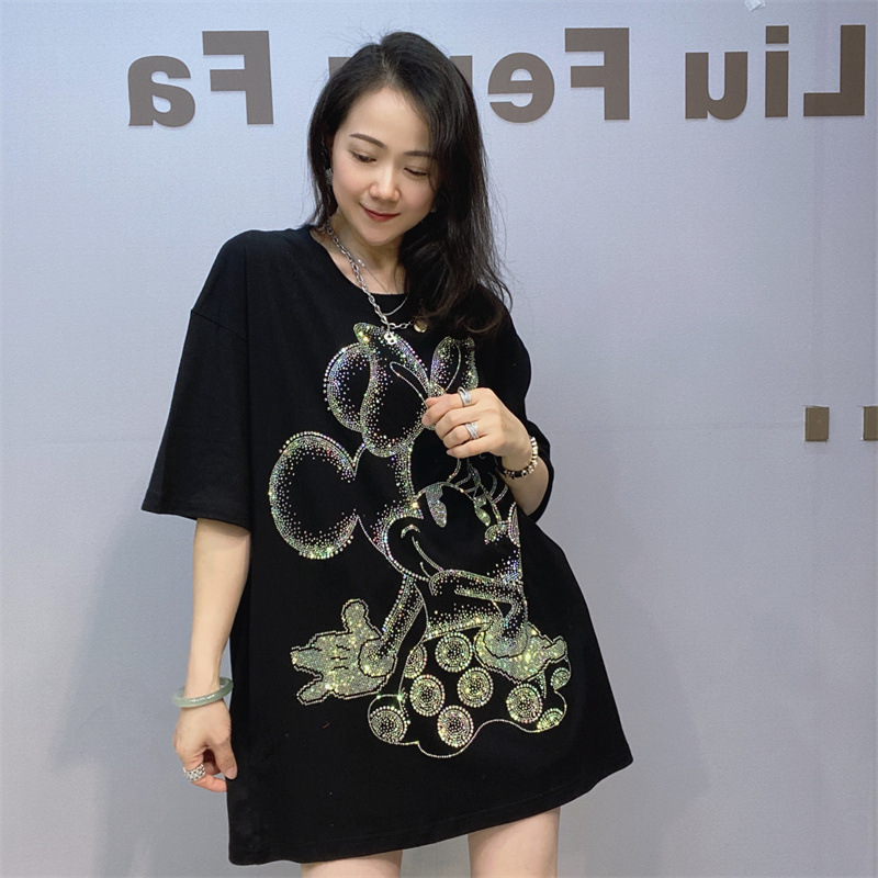 T-shirt Lengan Pendek Mudah Dipadu Padan Gaya Amerika Ukuran Super Besar Pakaian Wanita Musim Panas Warna Katun Murni Atasan Lengan Setengah Kerah Bulat Berlian Berkilau