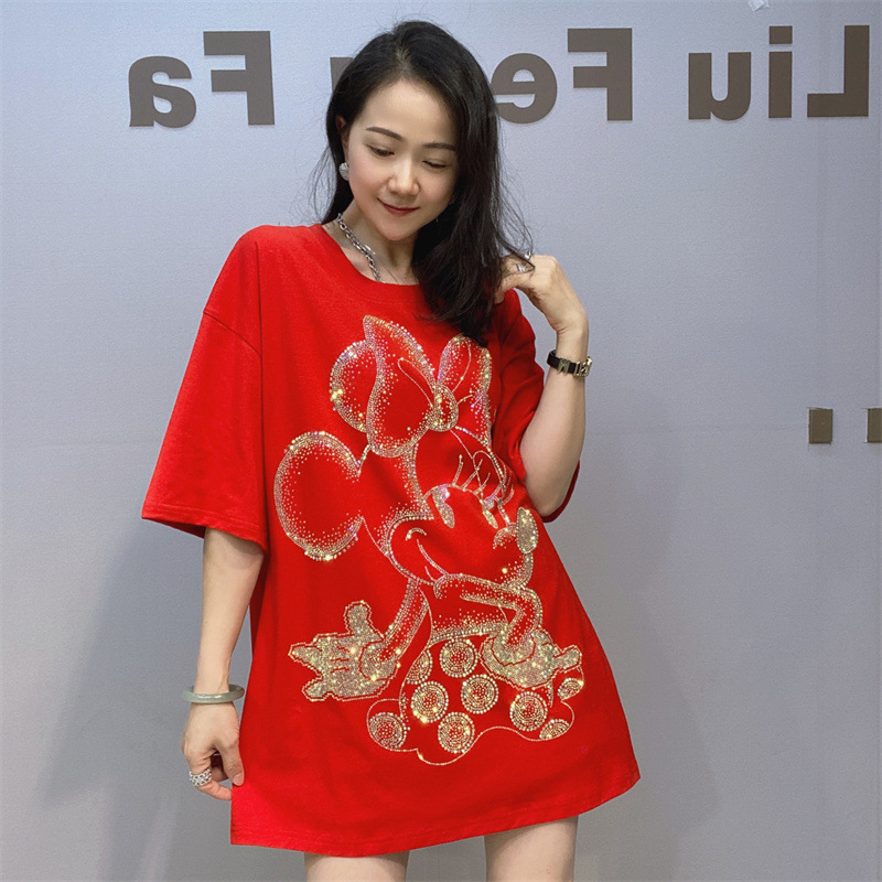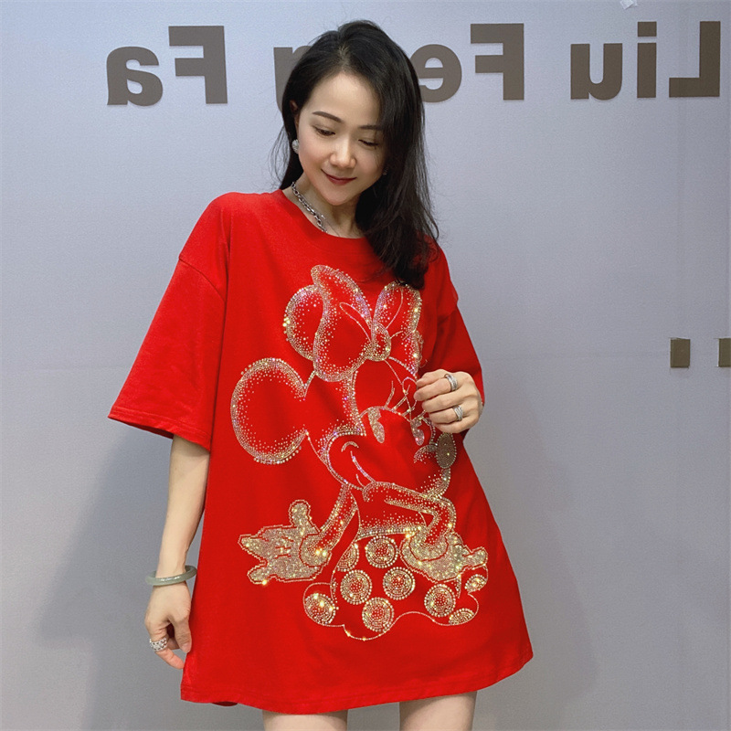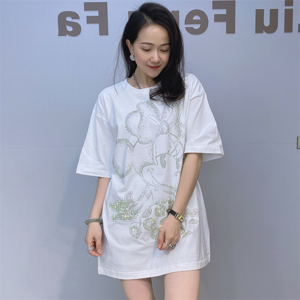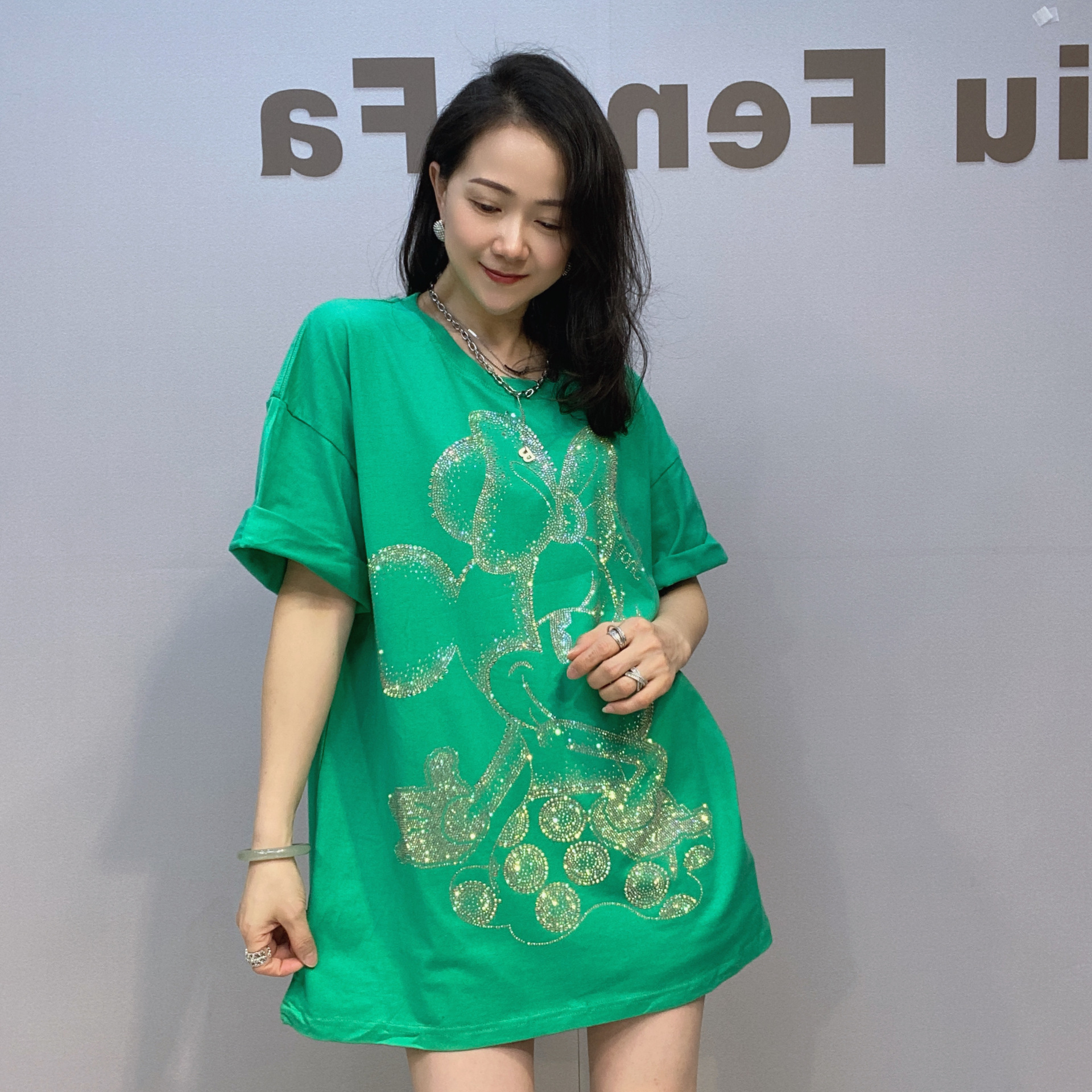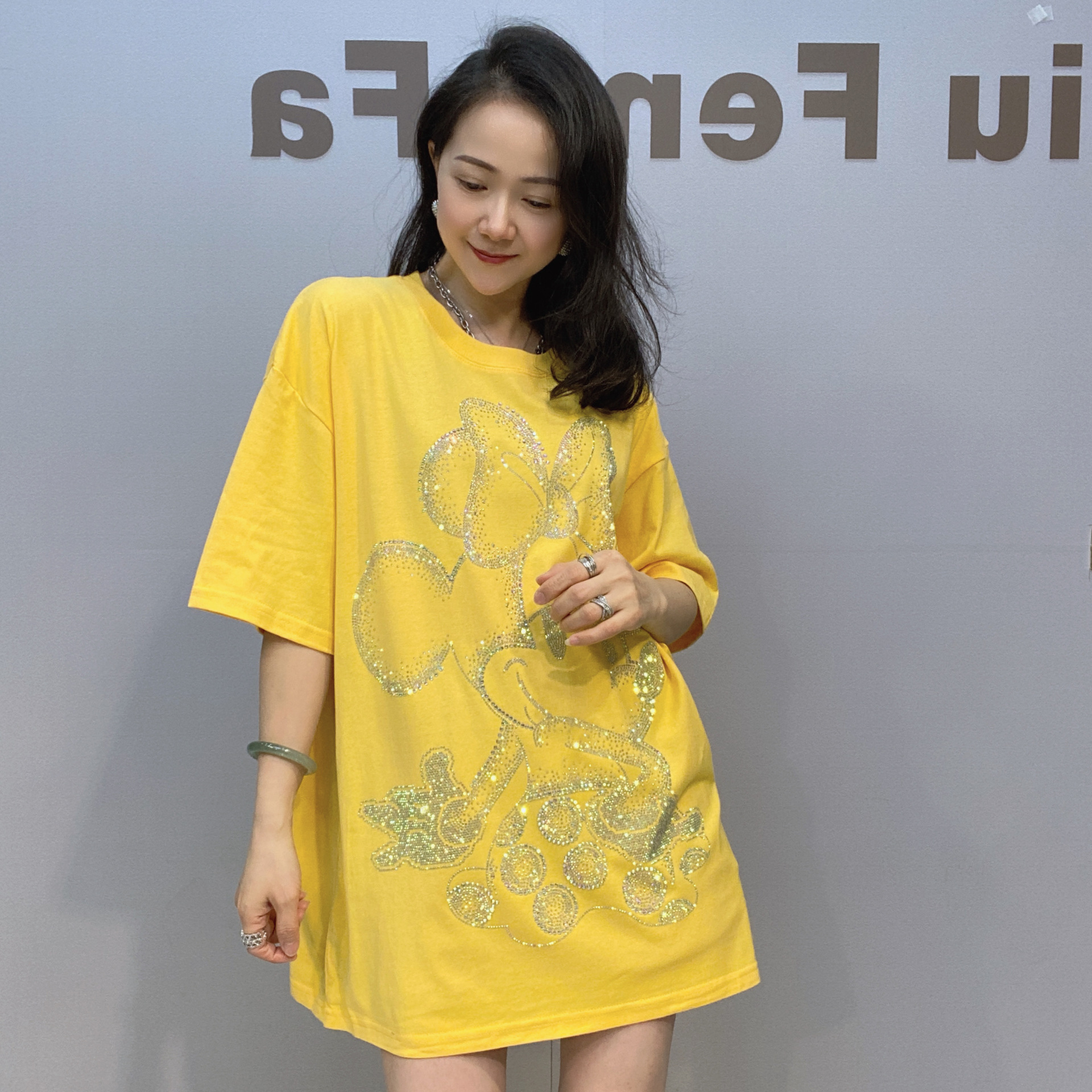 T-shirt Lengan Pendek Mudah Dipadu Padan Gaya Amerika Ukuran Super Besar Pakaian Wanita Musim Panas Warna Katun Murni Atasan Lengan Setengah Kerah Bulat Berlian Berkilau