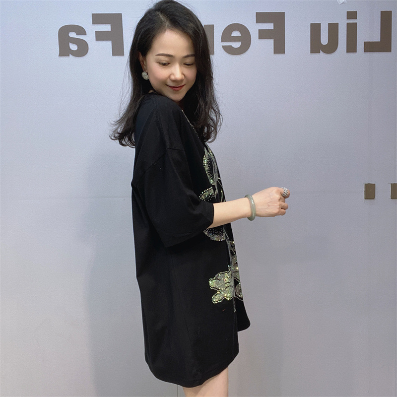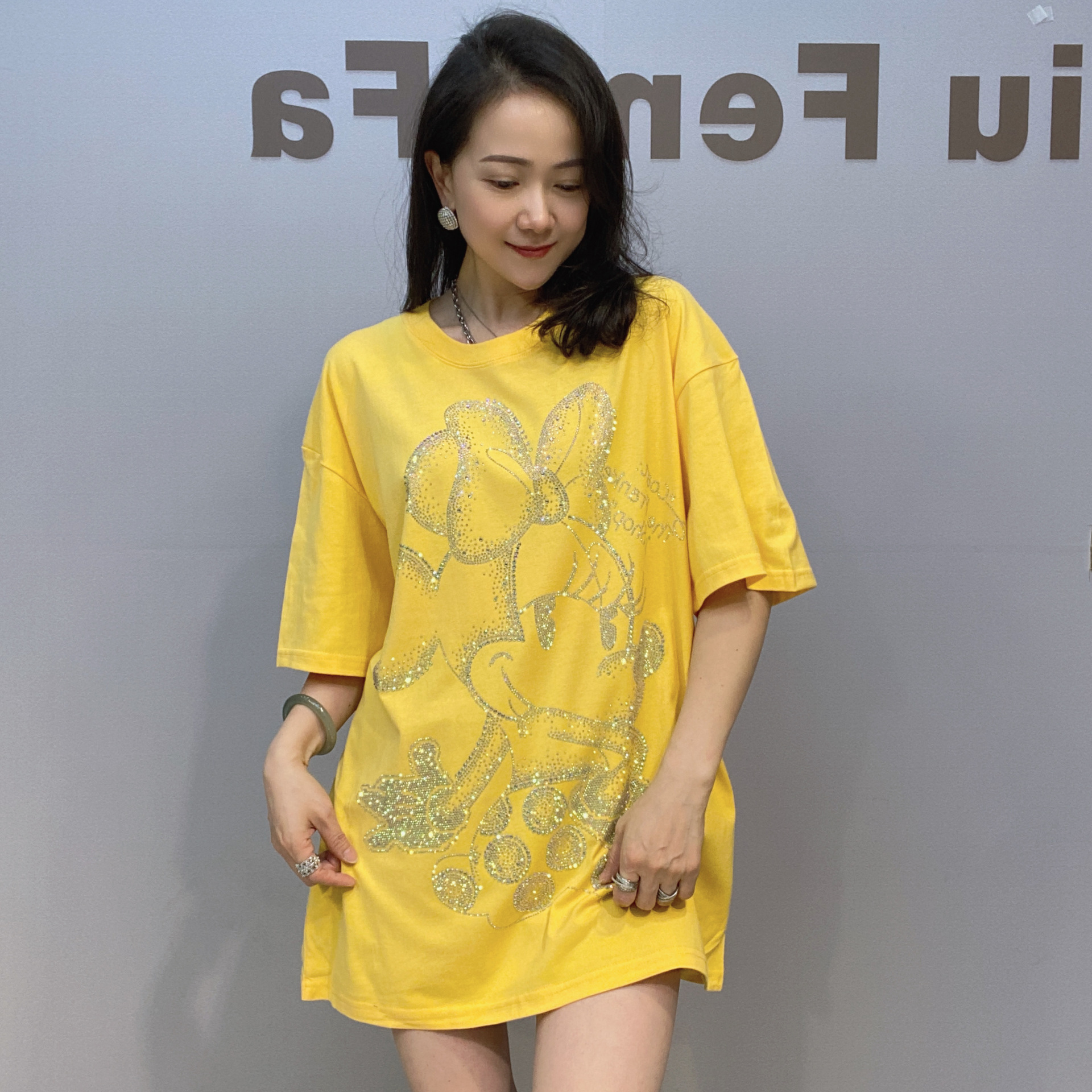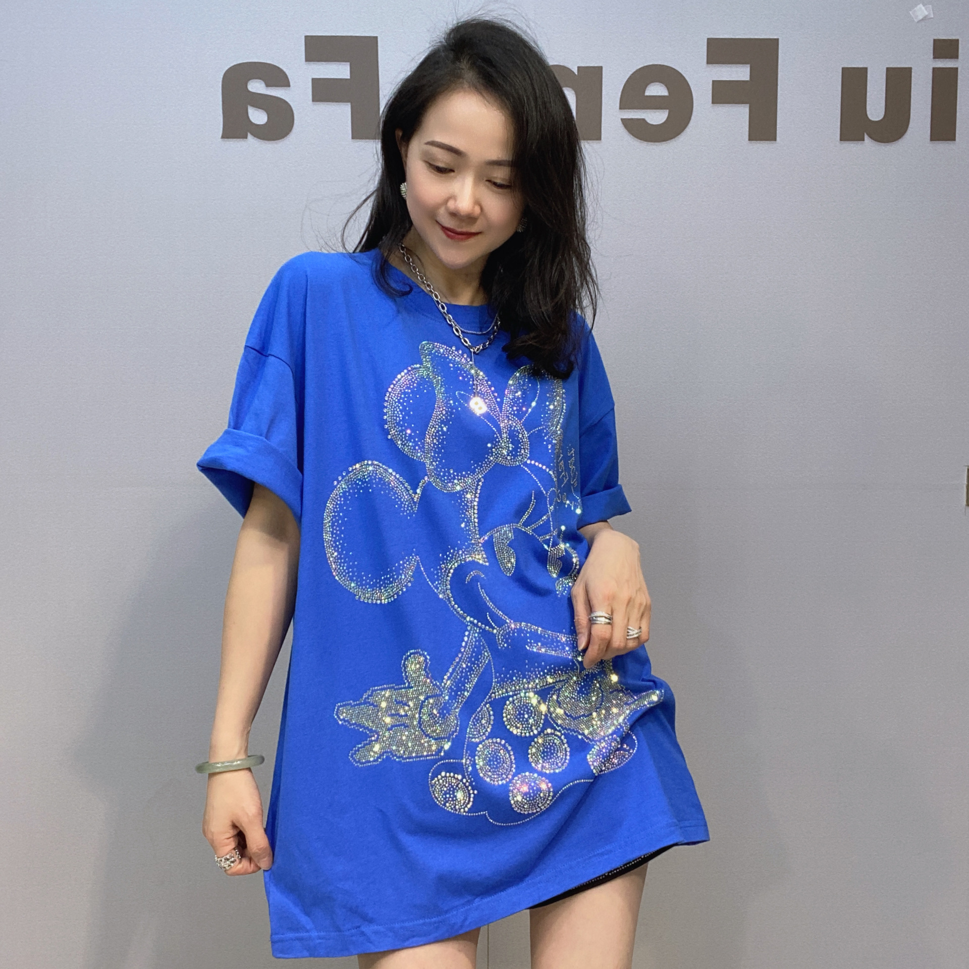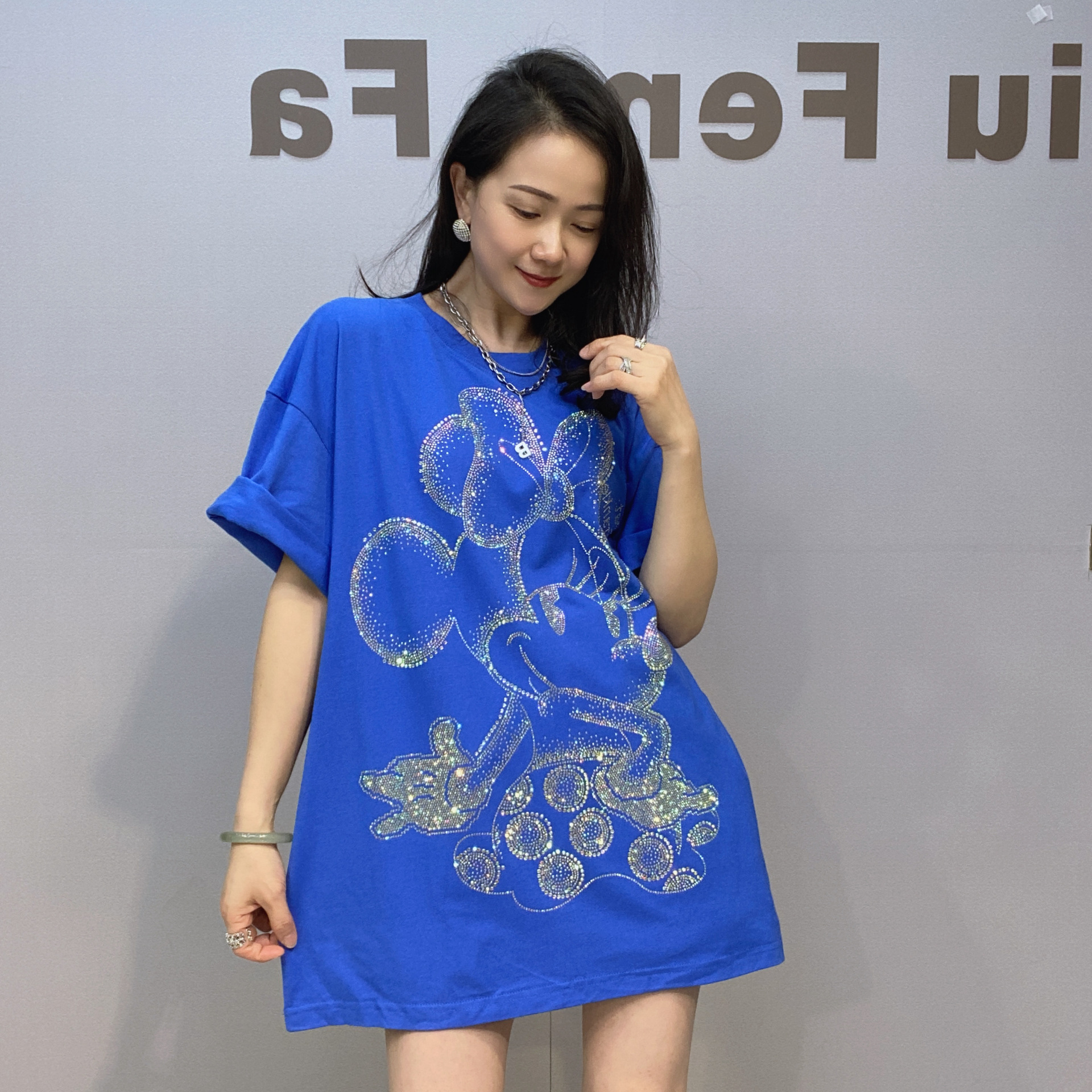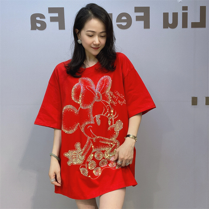T-shirt Lengan Pendek Mudah Dipadu Padan Gaya Amerika Ukuran Super Besar Pakaian Wanita Musim Panas Warna Katun Murni Atasan Lengan Setengah Kerah Bulat Berlian Berkilau