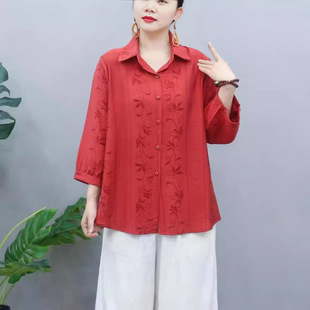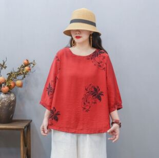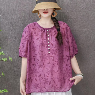 跨境新中式女装中国风女式短袖T恤宽松上衣文艺休闲怀旧风妈妈衫