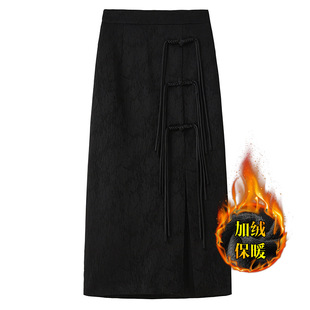 提花盘扣松紧腰半身裙新中式国风开叉A字女装冬季加绒显瘦中长裙