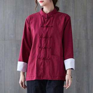 新中式改良唐装女上衣盘扣立领棉麻国风复古茶服春秋款宽松外套