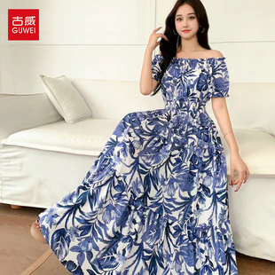 露肩女夏裙子性感度假海边沙滩裙短袖连衣裙人棉旅游风波西米亚