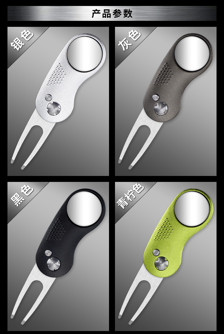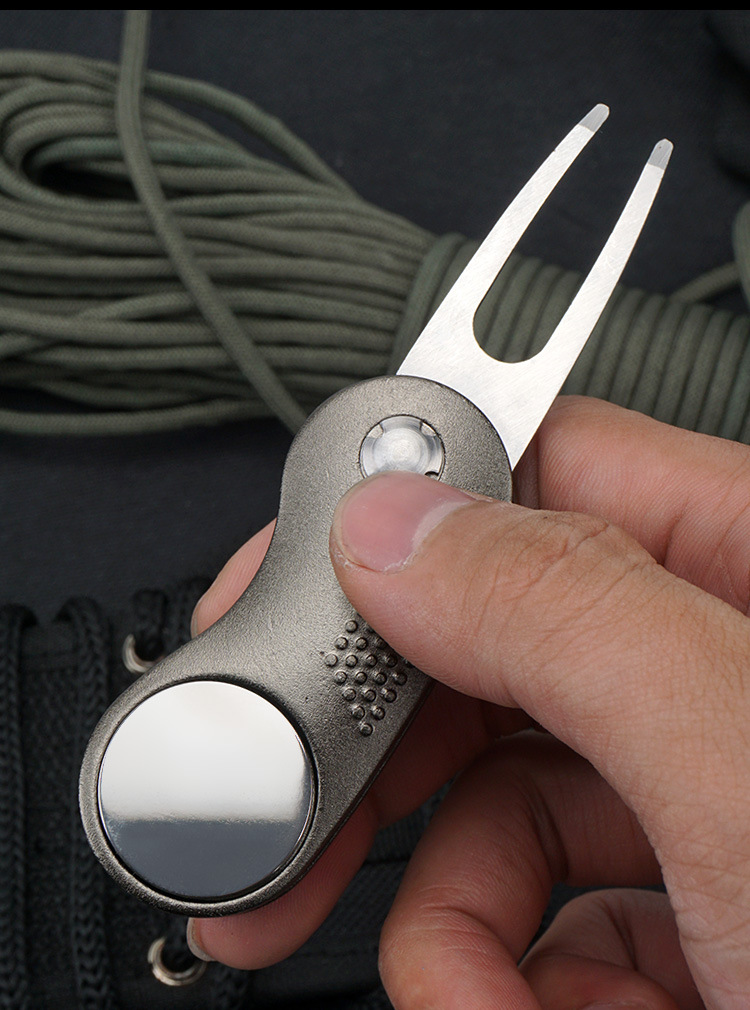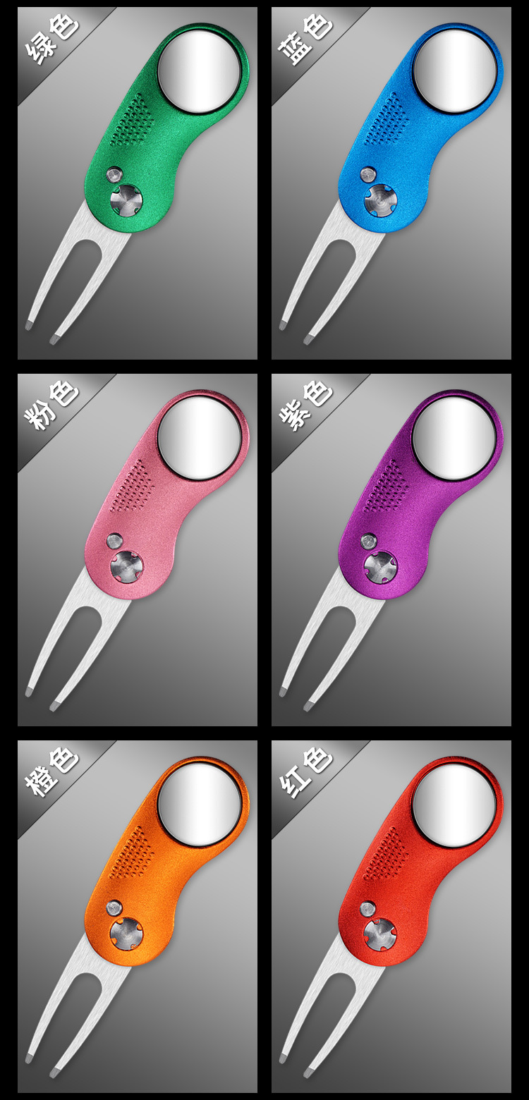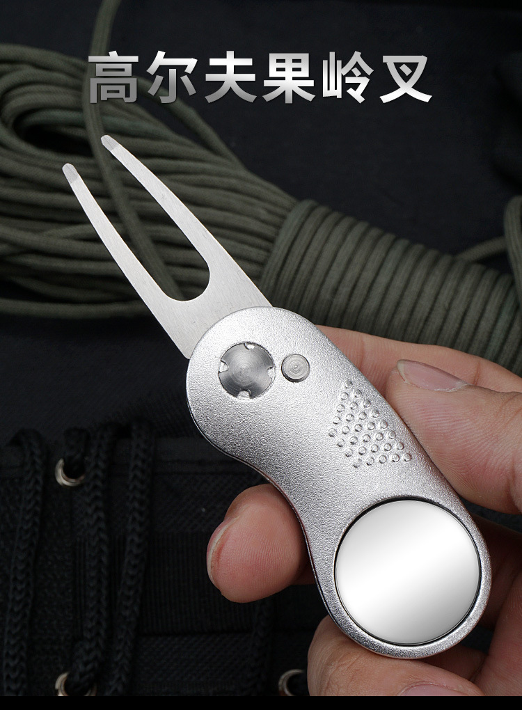 Perlengkapan golf tersedia: garpu rumput, garpu bola, gagang aluminium, pegas baja tahan karat, aksesoris logam, alat perbaikan rumput.