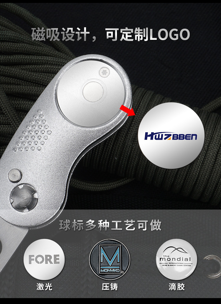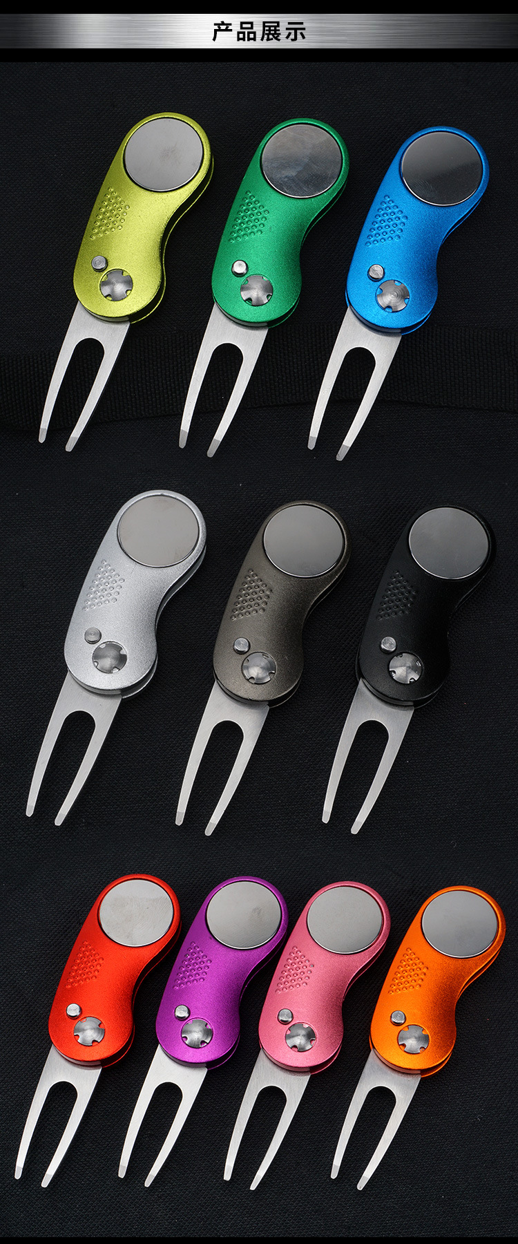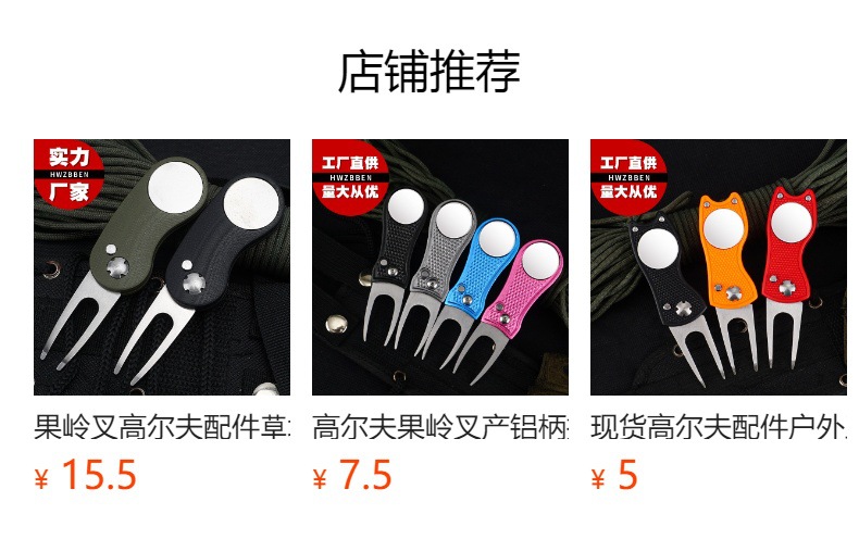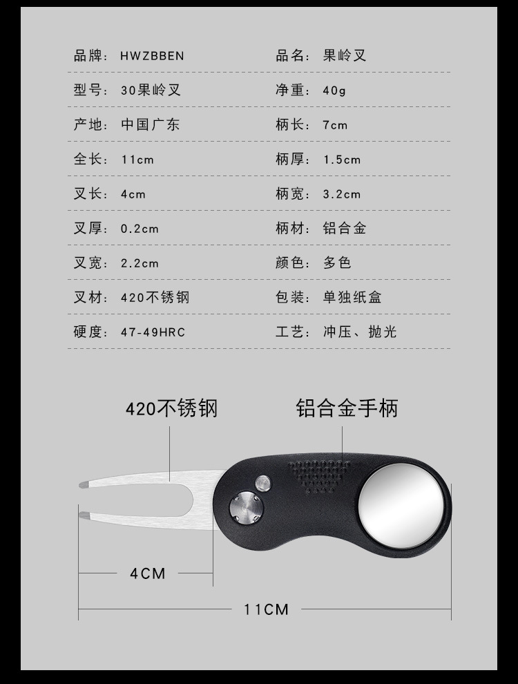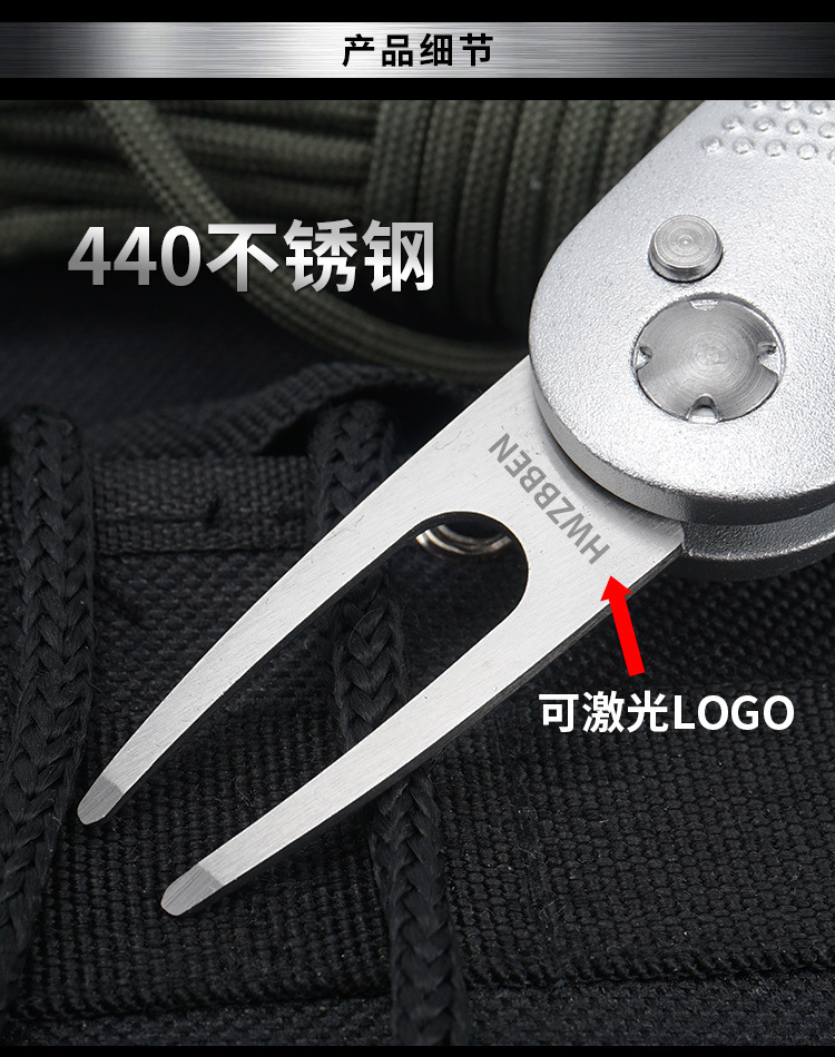 Perlengkapan golf tersedia: garpu rumput, garpu bola, gagang aluminium, pegas baja tahan karat, aksesoris logam, alat perbaikan rumput.