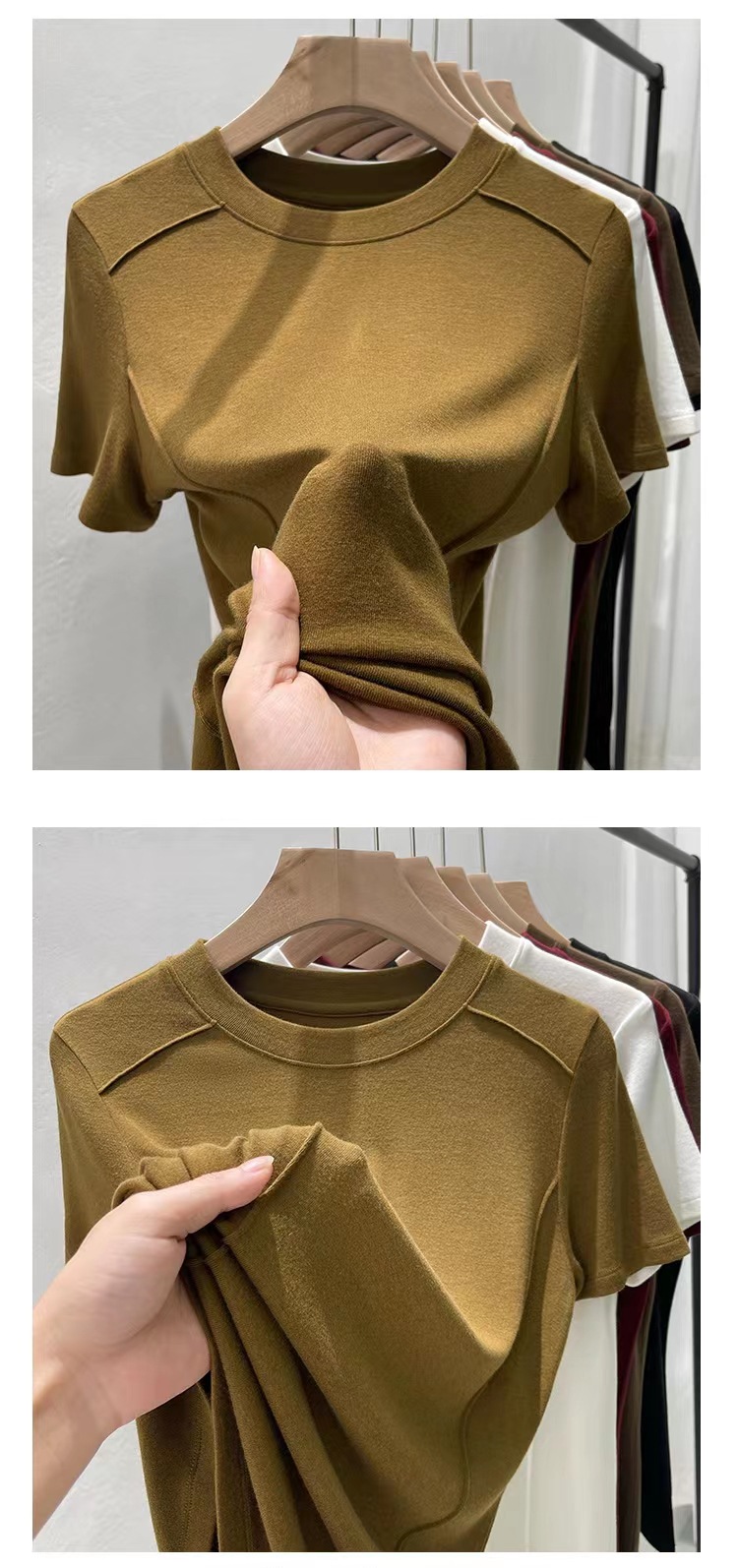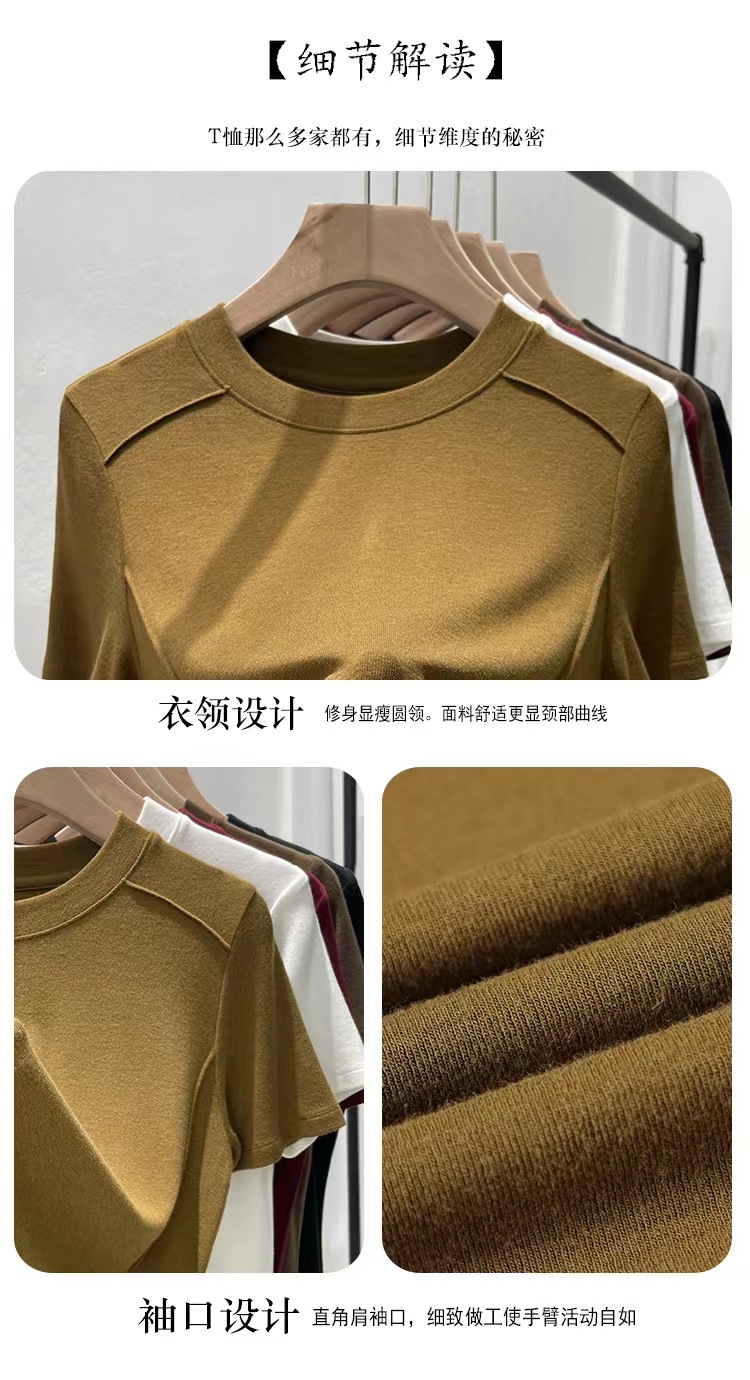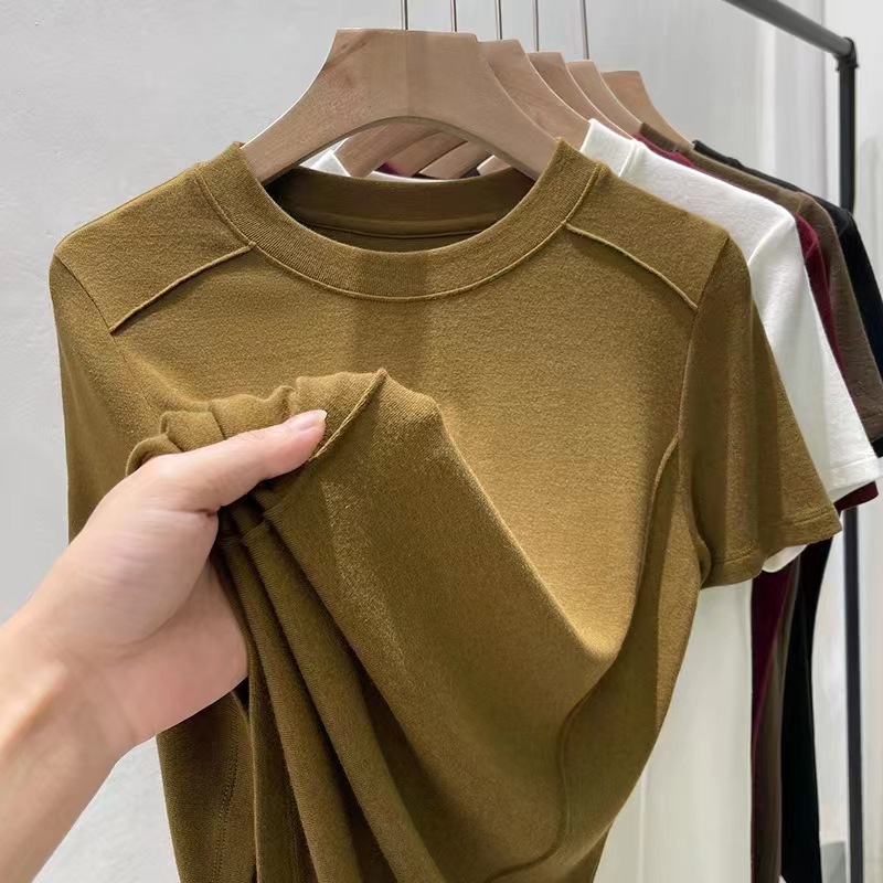 Kaos wanita lengan pendek model tulang ikan, kerah bulat, berbahan ribbed, ukuran plus, elastis, cocok untuk lapisan dasar atau outerwear, dengan nuansa mewah.