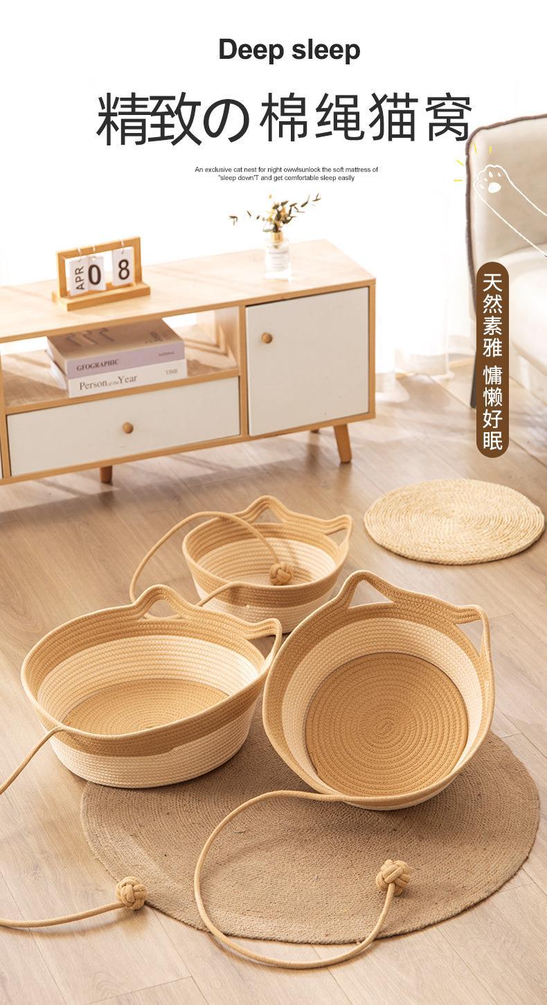 Sarang kucing rotan linen kasar, empat musim universal tempat tidur kucing tenun alas tidur kandang hewan peliharaan