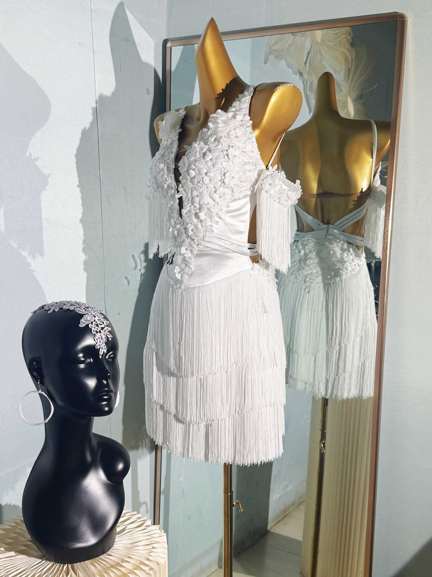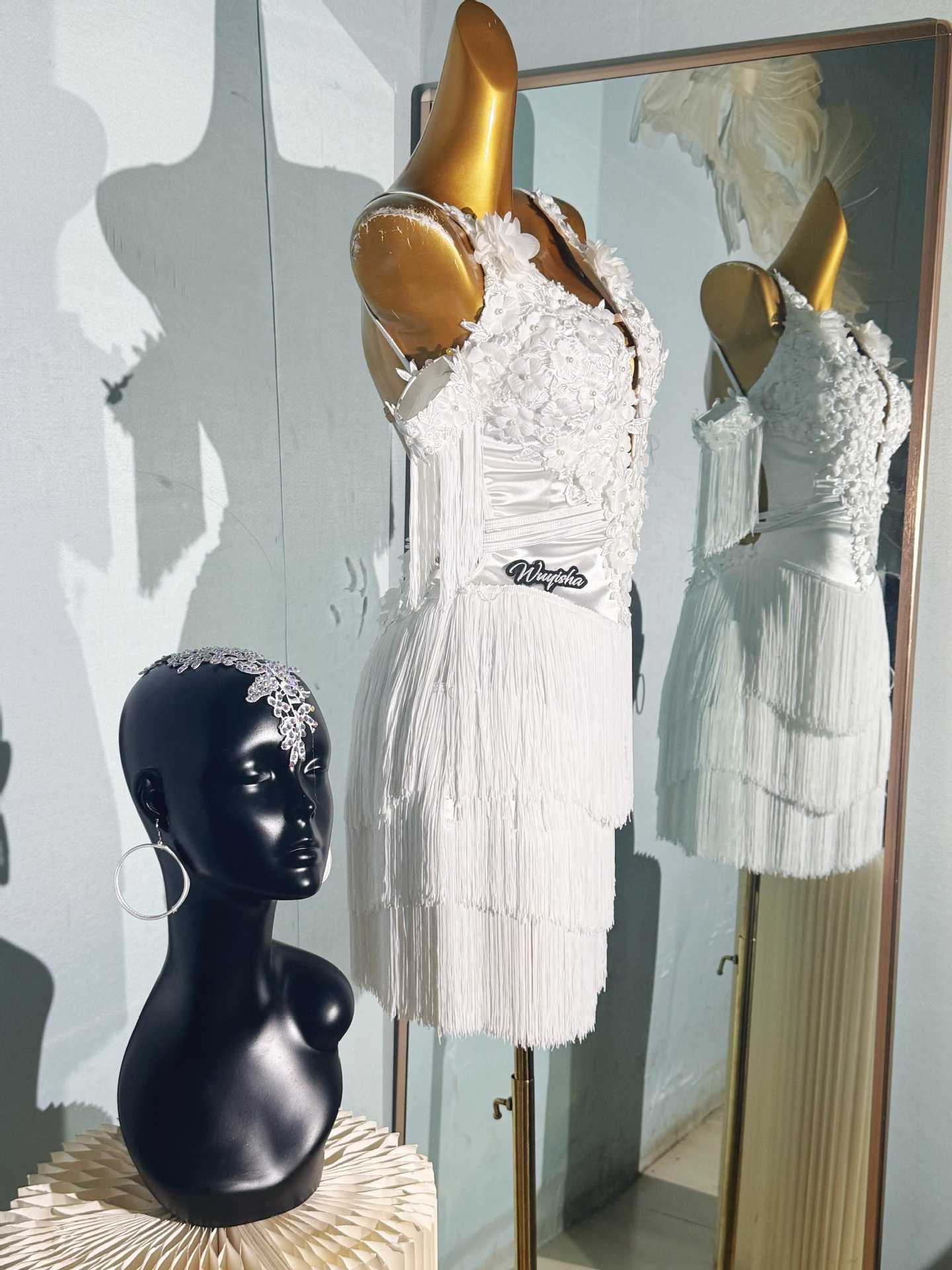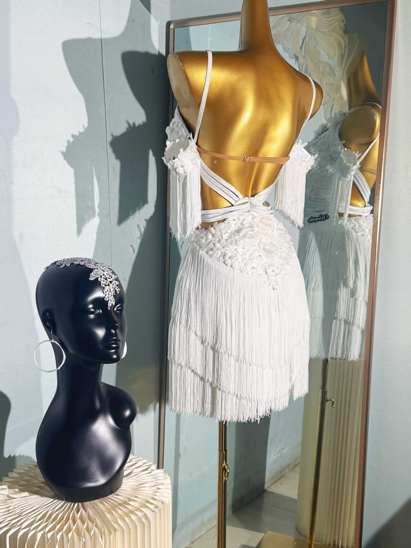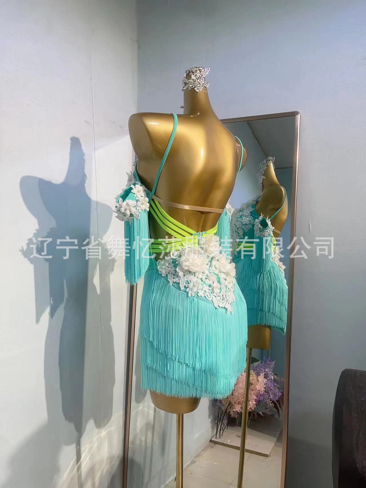 Pakaian tari Latin anak-anak gaya baru dengan payet berlian dan rumbai untuk pertunjukan dan kompetisi tari Latin anak perempuan.