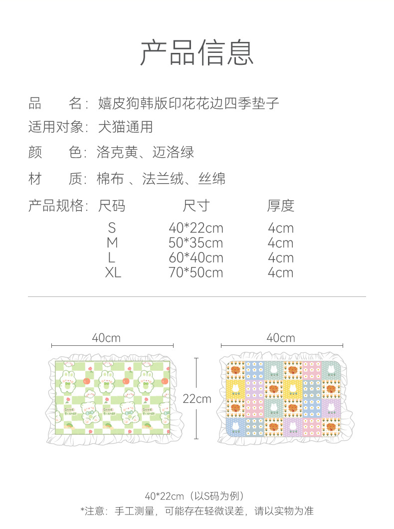 | 本店于3月4日-3月31日开始2026年春夏服饰、窝垫的新品预售活动 所有预售服饰9折且满500元包邮(除偏远);窝垫9折 新的一年,抢占先机,就看第一步!! 凡是本店下单预售商品的老客户,均可延长售后30天!! | ||