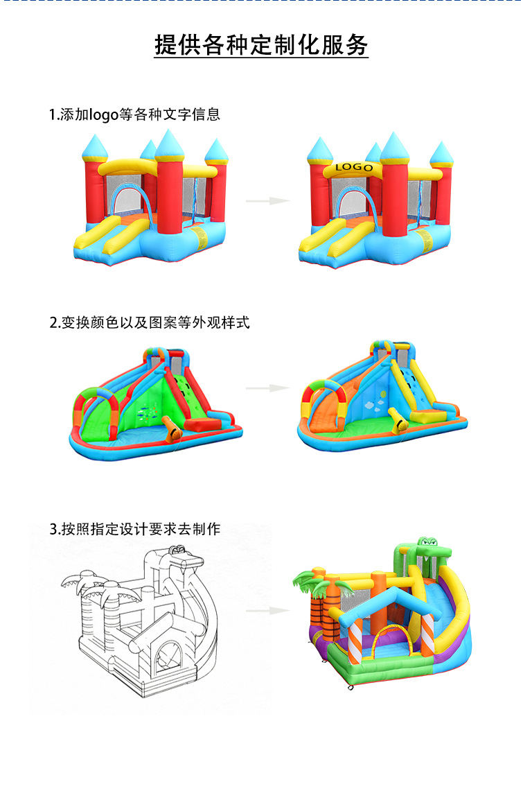 跳迪的目标是成为充气城堡行业的领先者,我们不仅提供优秀的充气城堡产品,还提供充气城堡设计生产解决方案和相关服务。我们希望在质量、创新和可靠性方面超越客户的期望。公司内部管理体系完善,各环节流程清晰,高品质,高效率,坚持以客户为中心,提供一站式服务使我们的企业理念。