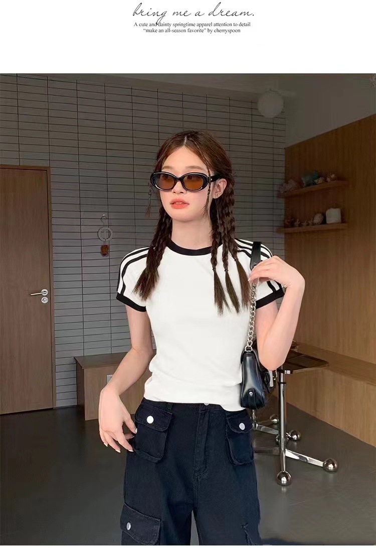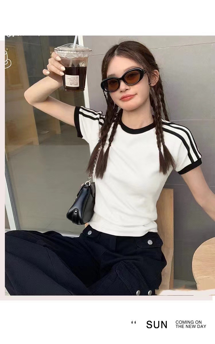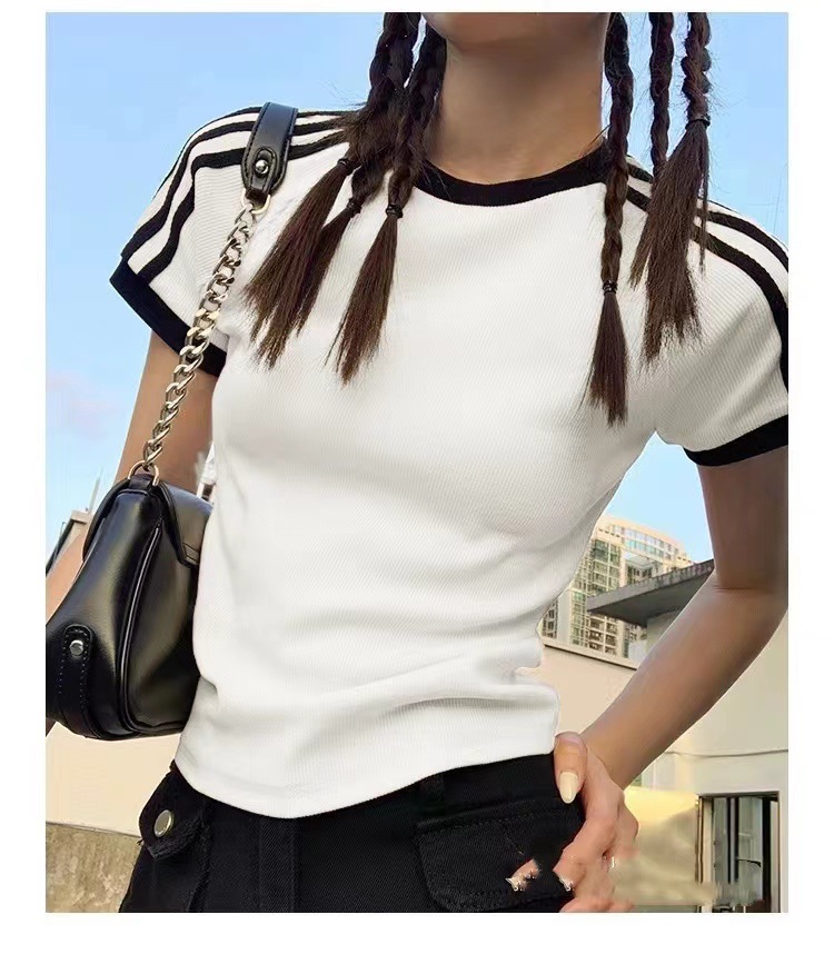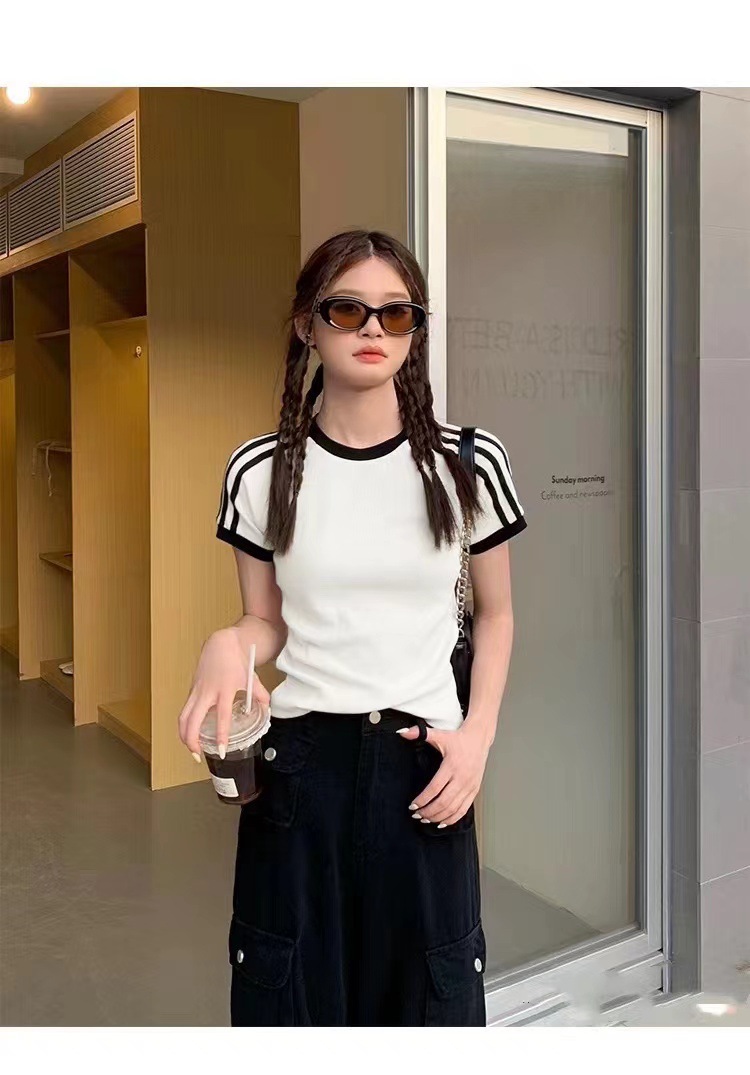 Kaus Wanita Lengan Pendek Bahu Kanan Pakaian Tampilan Pelangsing Tiga Garis Baru Atasan Kelas Atas Musim Panas Wanita Ukuran Besar