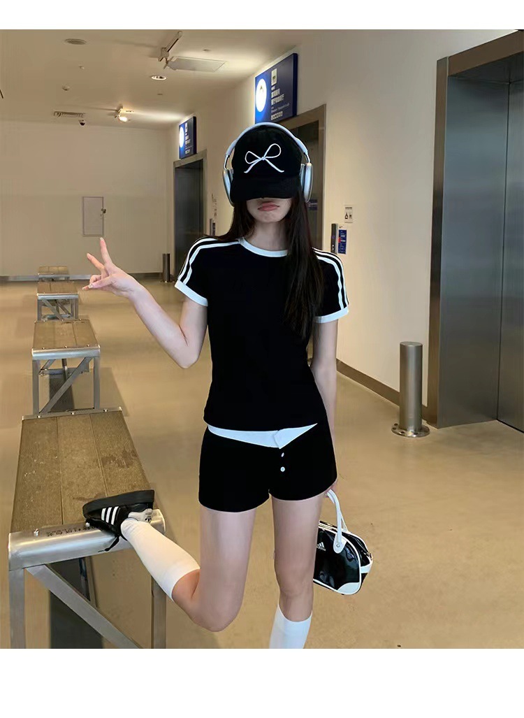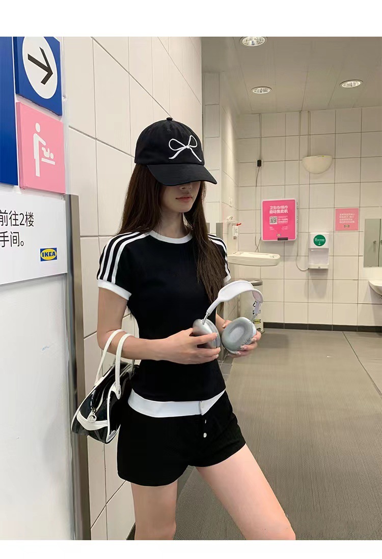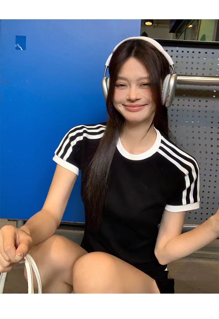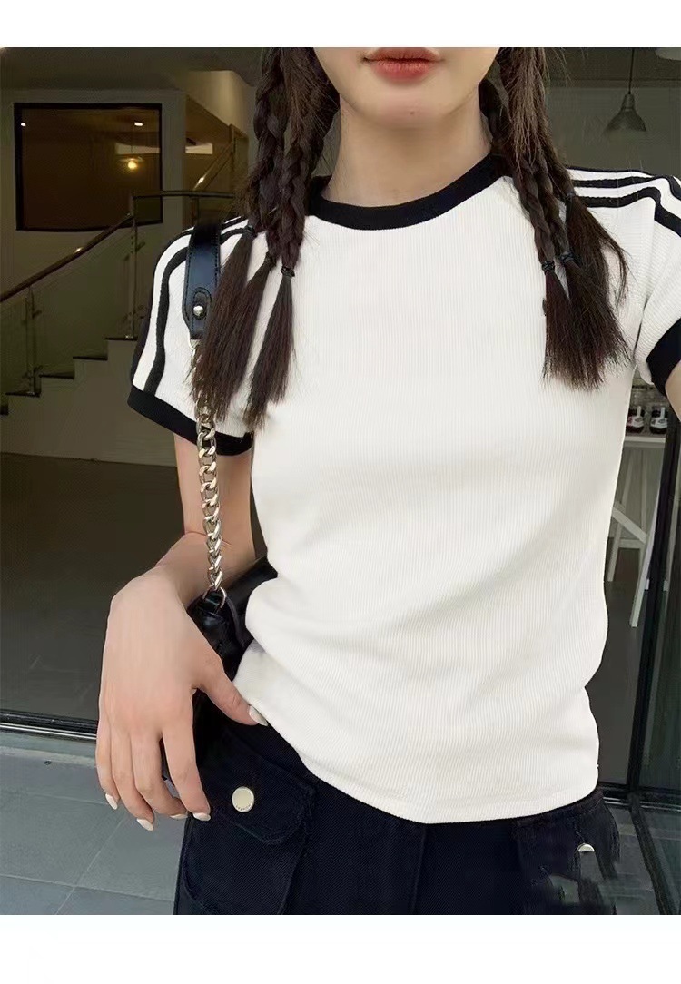Kaus Wanita Lengan Pendek Bahu Kanan Pakaian Tampilan Pelangsing Tiga Garis Baru Atasan Kelas Atas Musim Panas Wanita Ukuran Besar