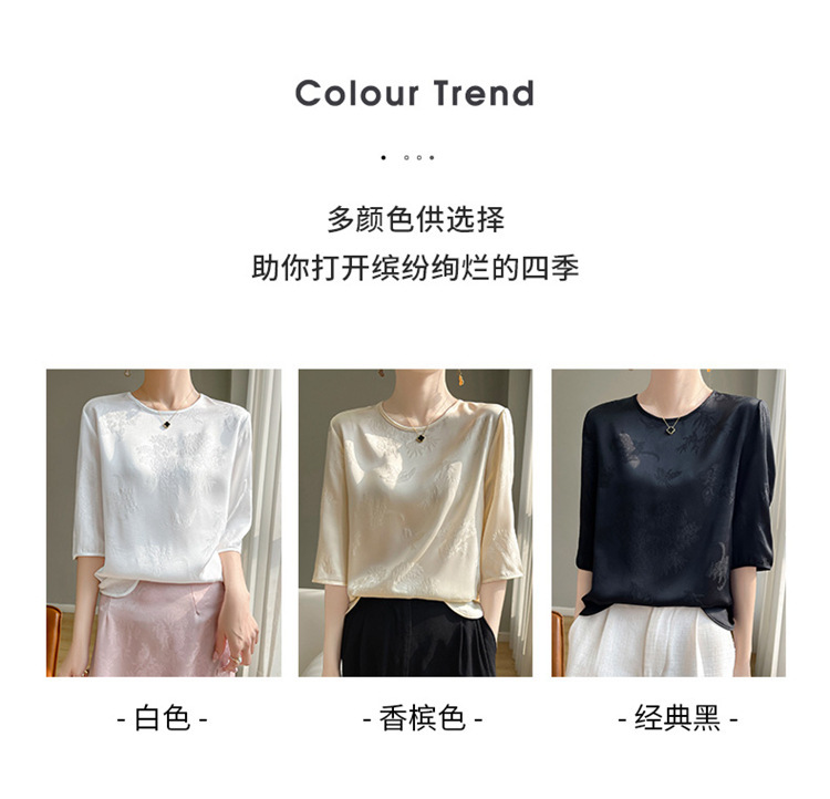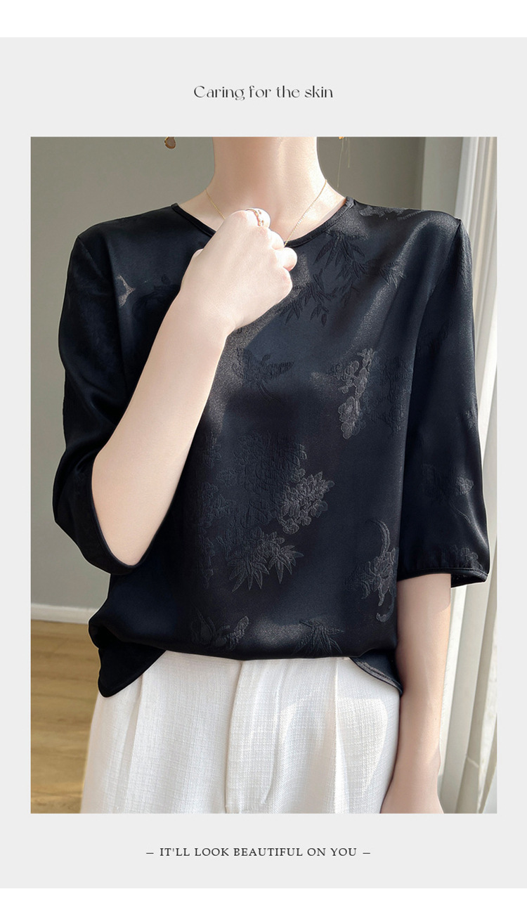 真丝缎面2024夏季女装新款圆领短款气质暗花大码短袖百搭T恤上衣