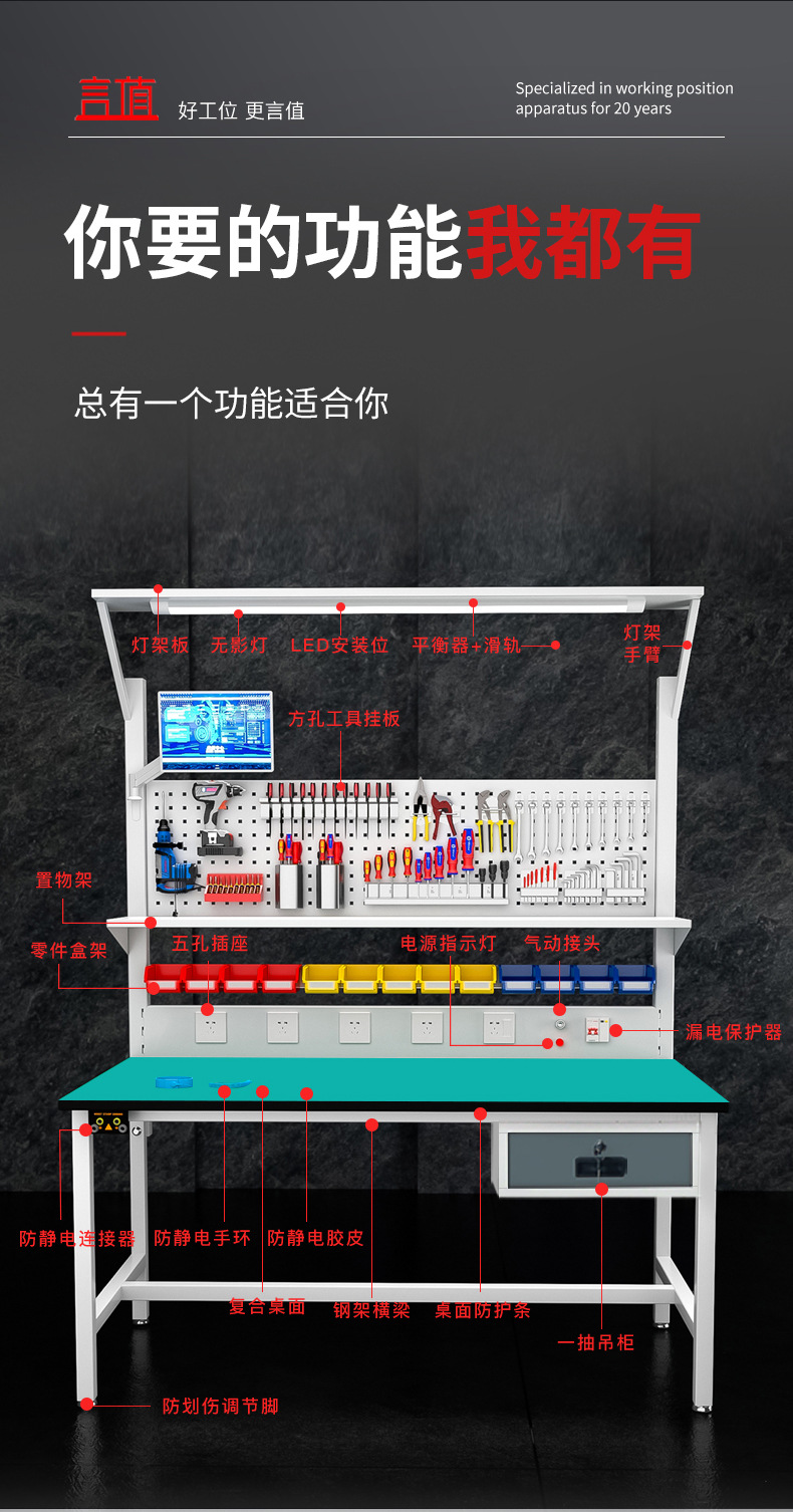 Meja kerja lokakarya anti statis, meja kerja dengan lampu, perbaikan ponsel, garis perakitan, konsol meja percobaan