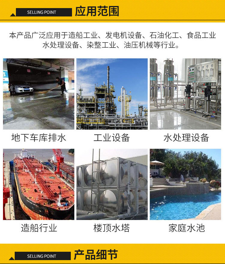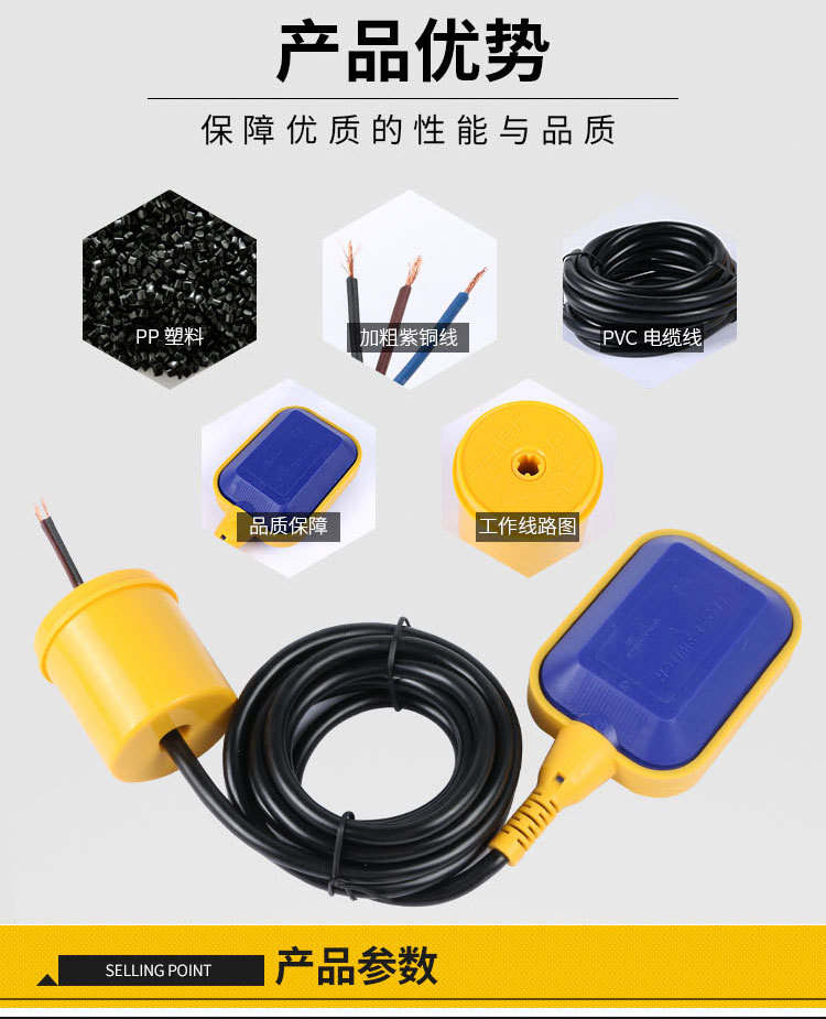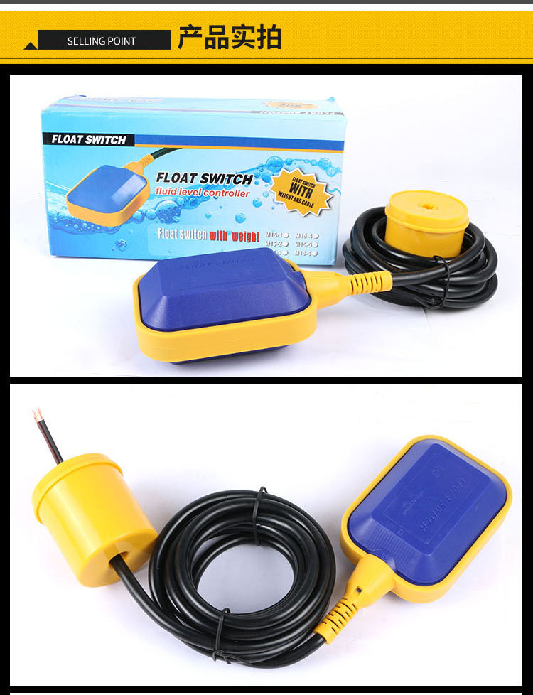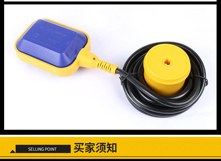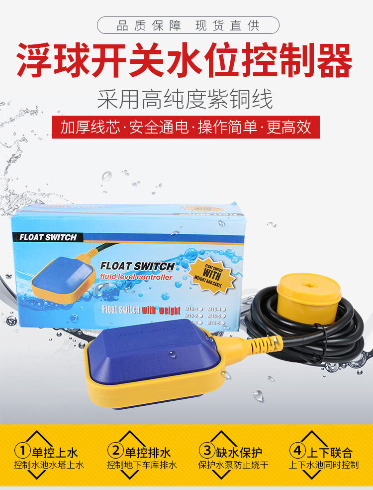 浮球控制器是一个能够调节桶.槽或井中液位的开关。它可自动调节,易于操作,便于安装,安全可靠,免予维修,无毒环保。它对污水有抵抗作用。广泛应用于家庭,厂矿等的水池,油,弱酸和弱碱的池,桶,槽,灌等的容器之中。如串联两个控制器,即一个放至水池 ,加一个放至水井来控制水泵,就能防止因水源不足开空泵而损坏水泵设备。也可以三个控制器串联,一个放至水塔,一个放至过滤池和一个放至河水(水井)能同时控制两台水泵设备。