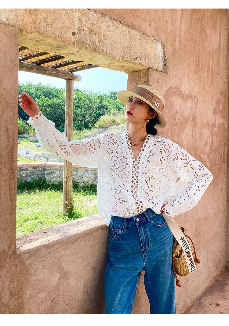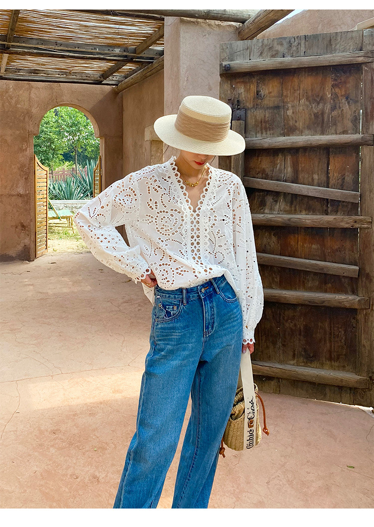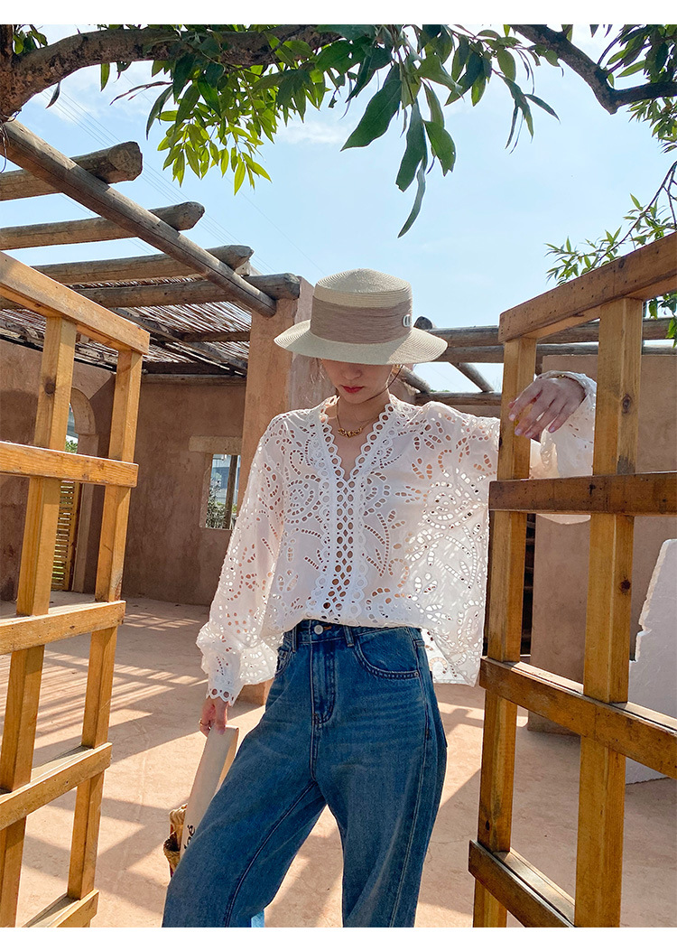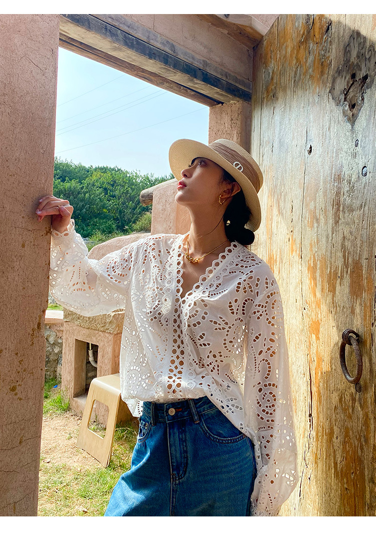 Kemeja Putih Perancis Bordir Katun Eropa dan Amerika Musim Gugur 2025 Kemeja Desain Lengan Panjang Wanita Pakaian Wanita Shenzhen Nanyou