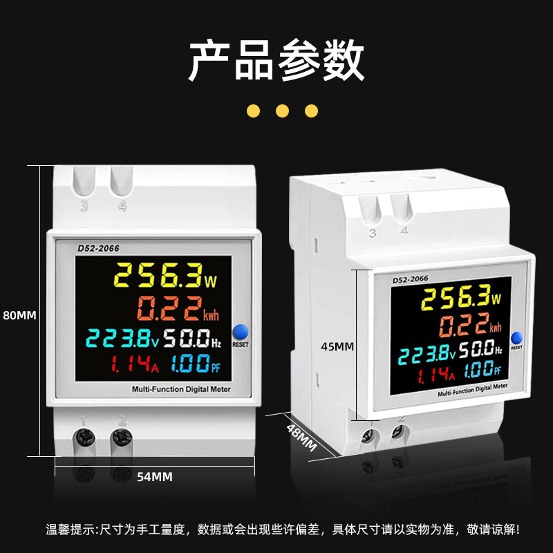 D52-2066型导轨式数显多功能表是在仪表上同时示交流电压、交流电流、有功功率、功率因素、频率以及电能等6个参数。仪表显示部分采用彩色全视角高清液晶显示屏。