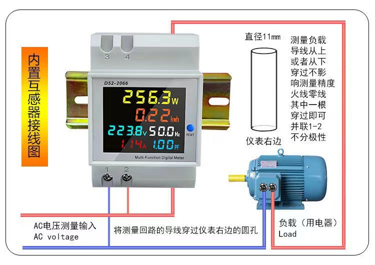 2.内置互感器按图一接线图接线,将测量回路的导线穿过仪表的下方的圆孔,导线的穿入方向用户根据使用的情况任