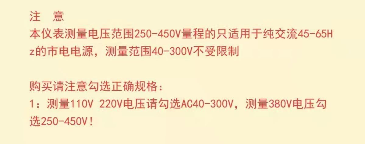 2.测量范围: 交流电压:AC40.0-300.0V,(或AC250.0-450.0V),用户在订货时根据需要选择一种合适的量程)