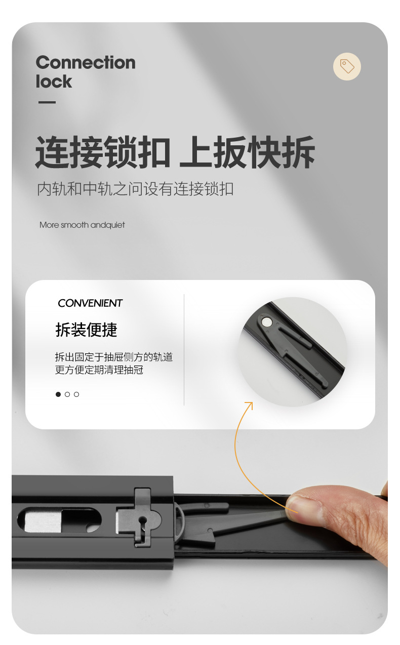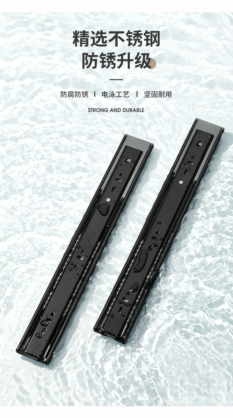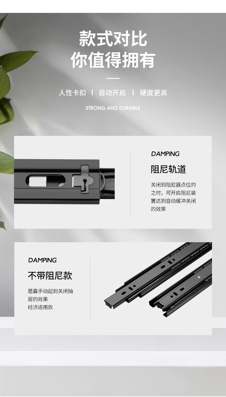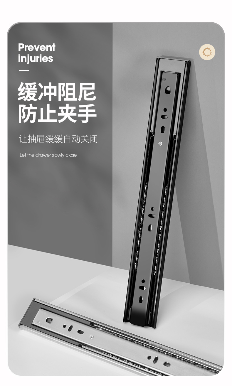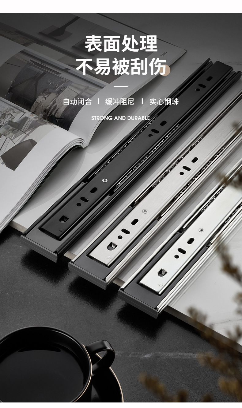 Rel laci geser tiga bagian dengan peredam kejut, rel pemandu penutup kabinet, rel penutup lemari senyap, strip baja tahan karat.