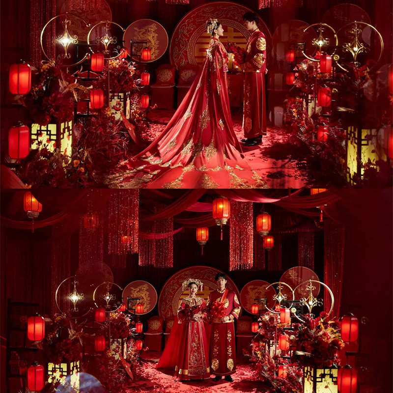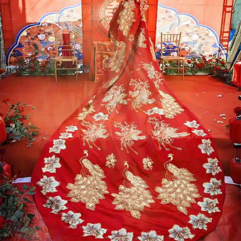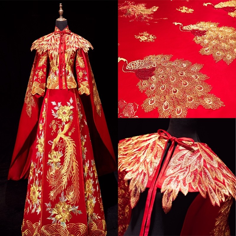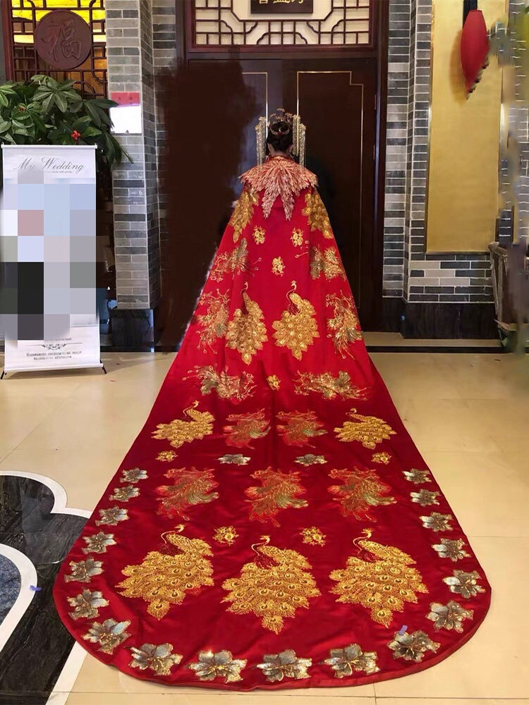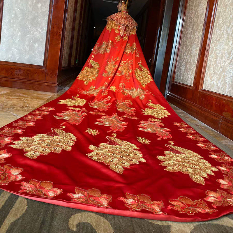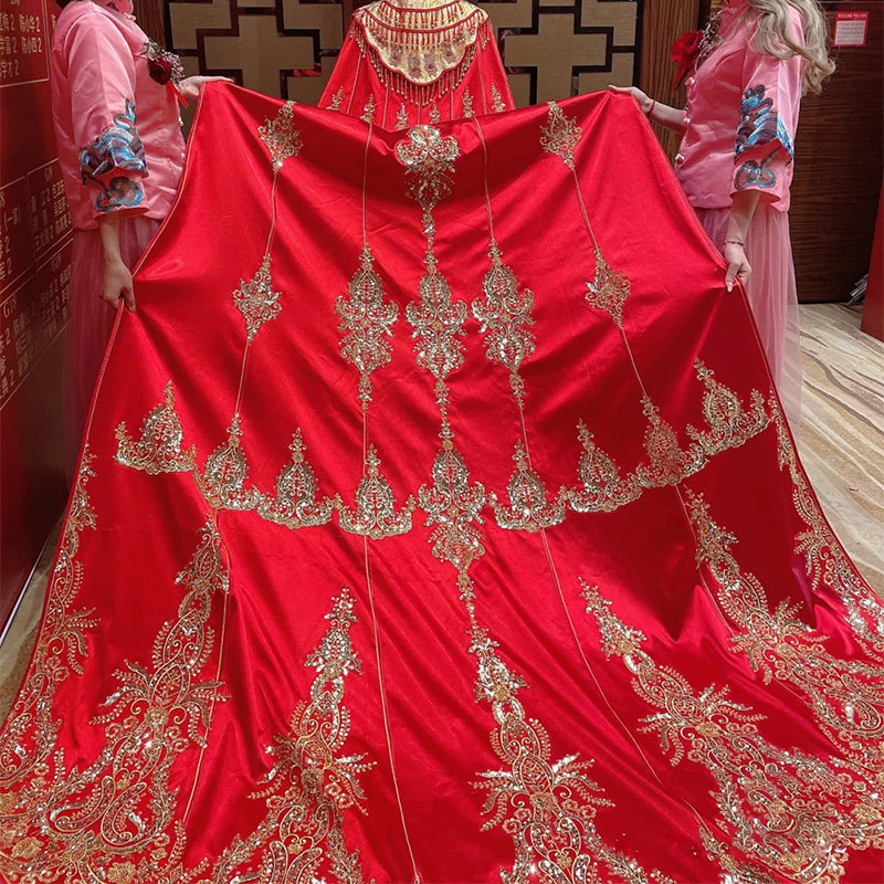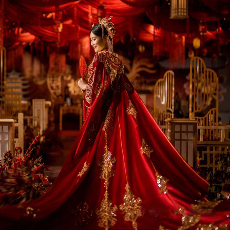 Gaun pengantin Xiuhe gaya 2025, gaun pengantin Cina dengan jubah panjang, kostum kuno, selendang gaun pengantin, mahkota phoenix, jubah dengan ekor panjang
