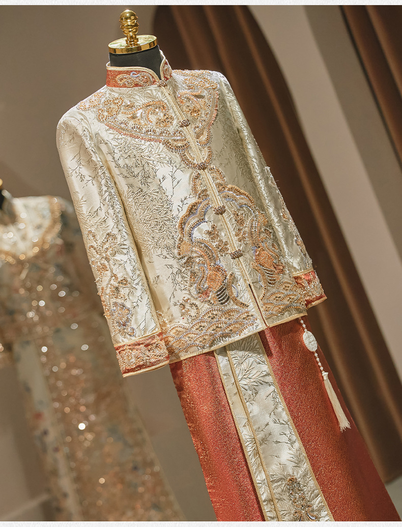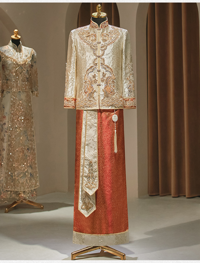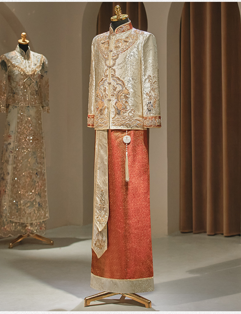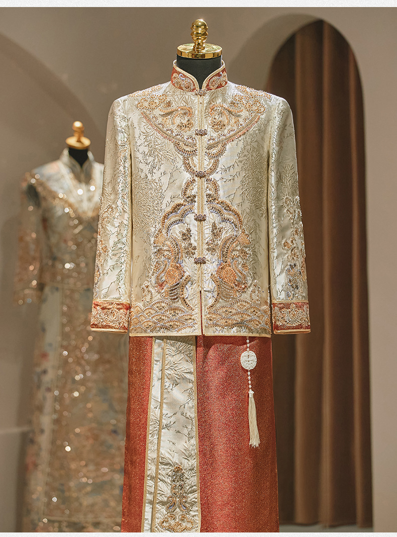 Jas Xiuhe warna sampanye untuk pria, gaya baru 2025 untuk pakaian pengantin pria, jas Xiuhe yang rumit, jubah naga dan phoenix untuk pria.