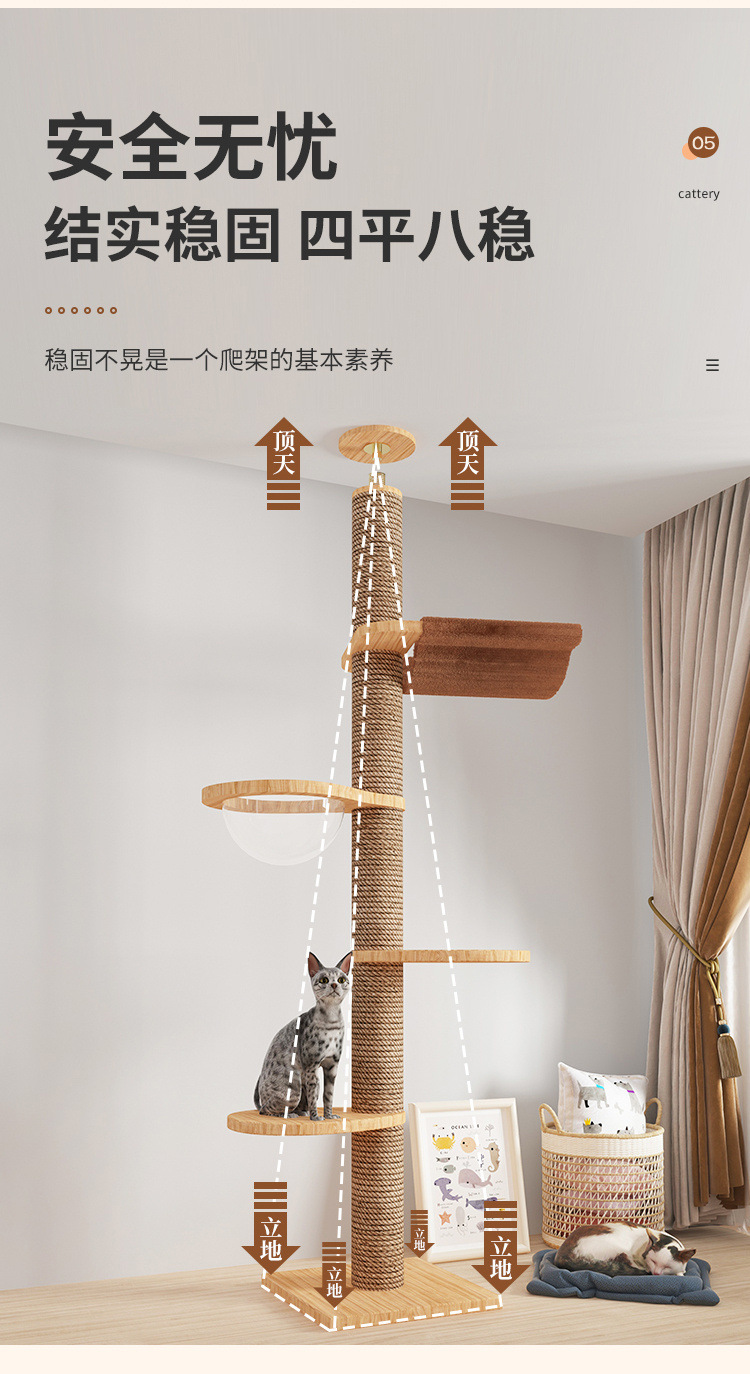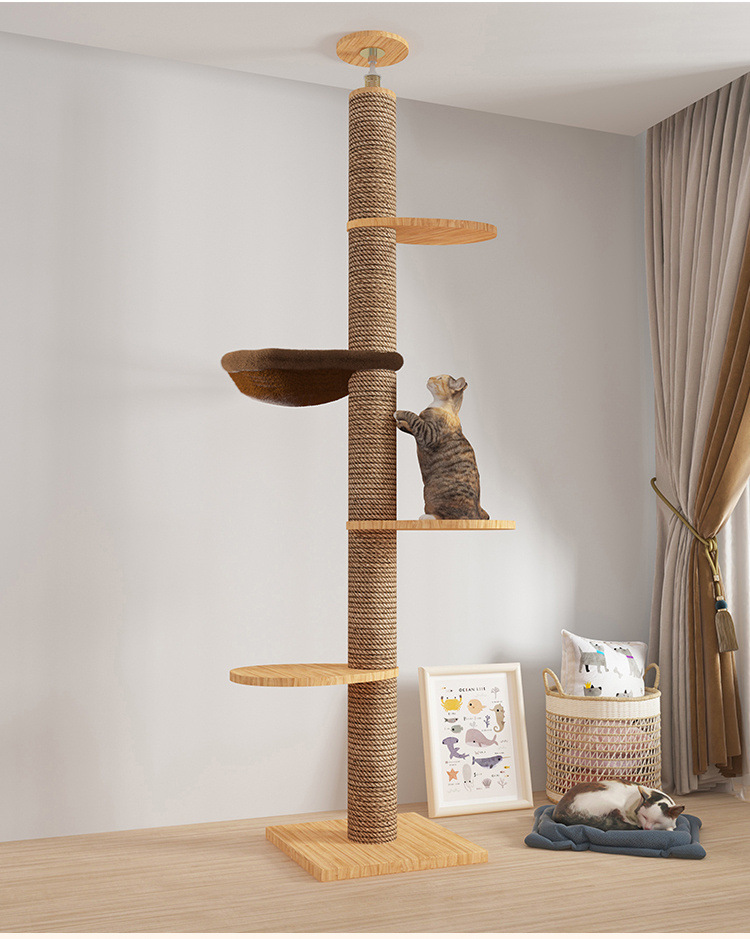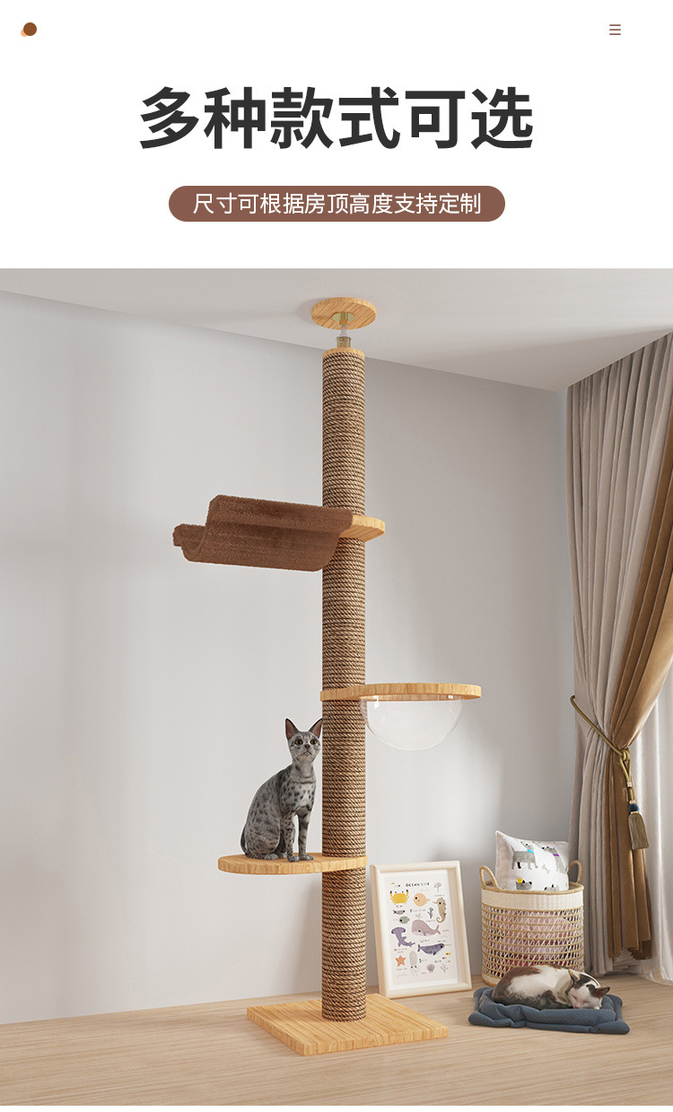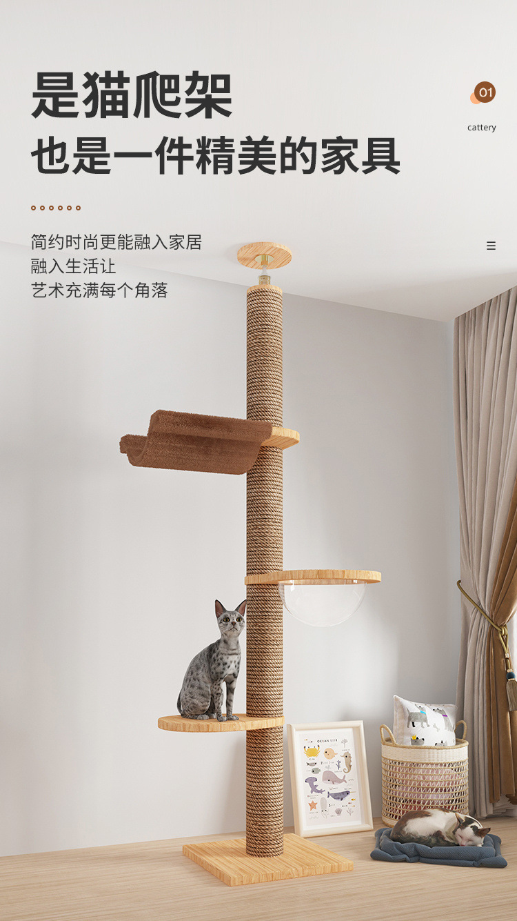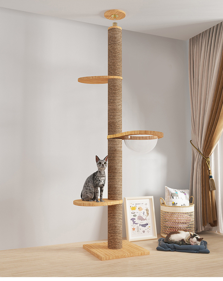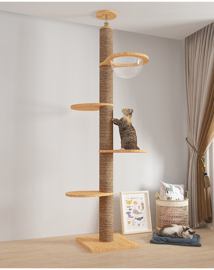 Rak panjat kucing dengan tiang setinggi langit, pohon tempat tidur kucing, kapsul ruang angkasa, tiang garukan kucing, mainan kucing kayu solid, struktur panjat, langsung dari pabrik, empat tingkat.