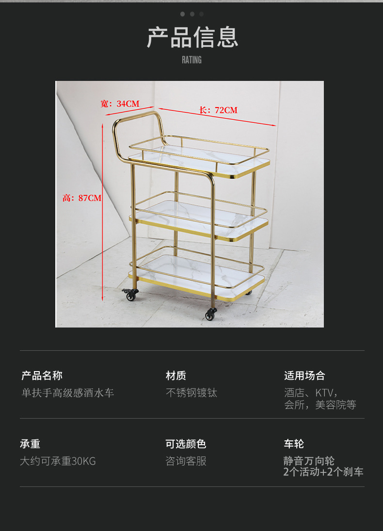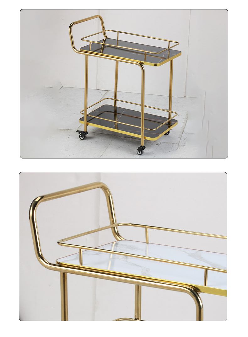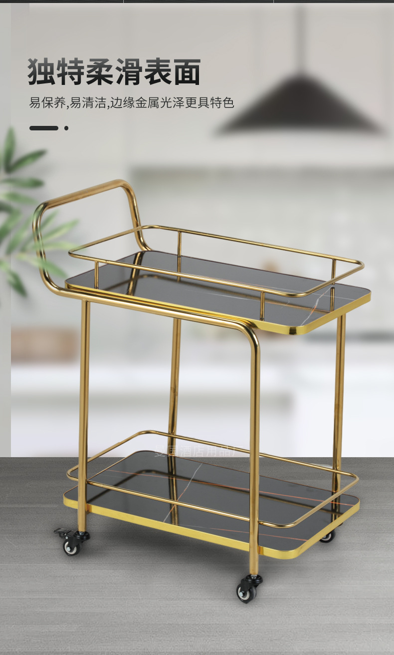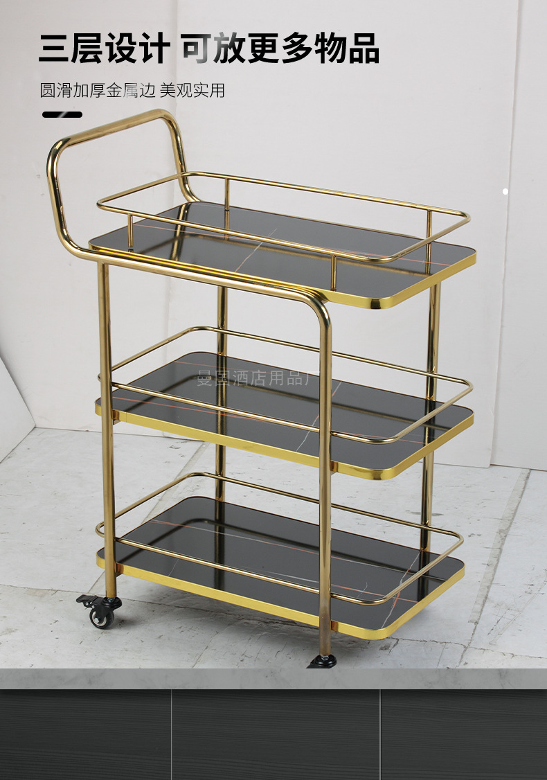 Restoran hotel kereta makan tiga lantai troli emas titanium kereta pengiriman anggur komersial dengan pagar pembatas kereta layanan bergerak besar