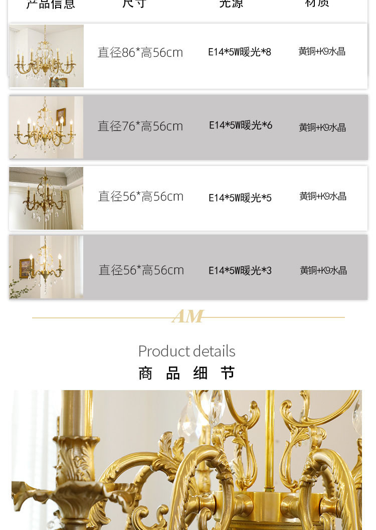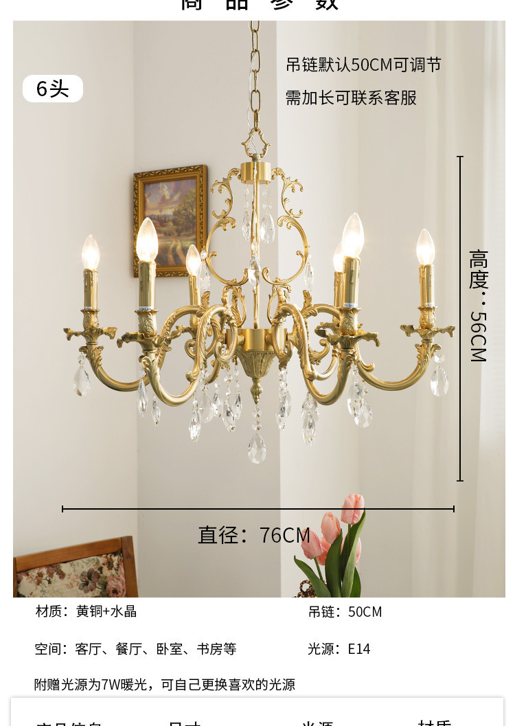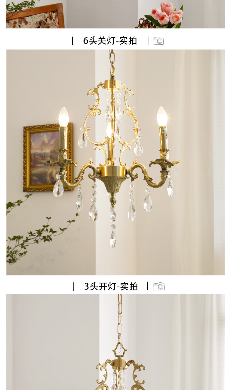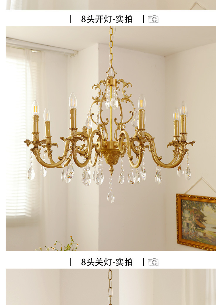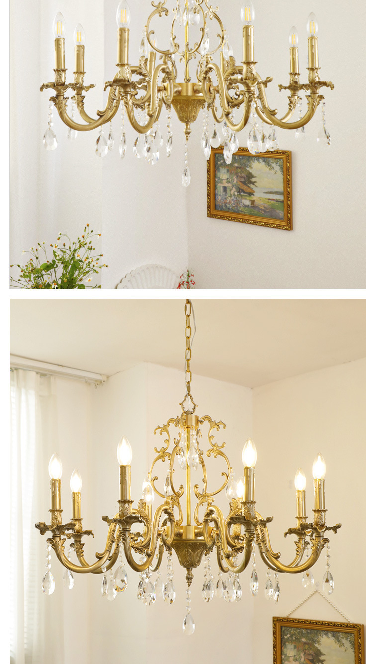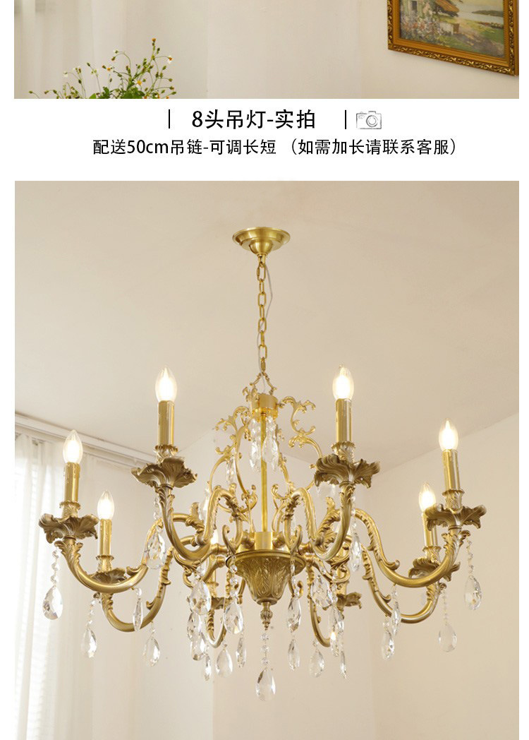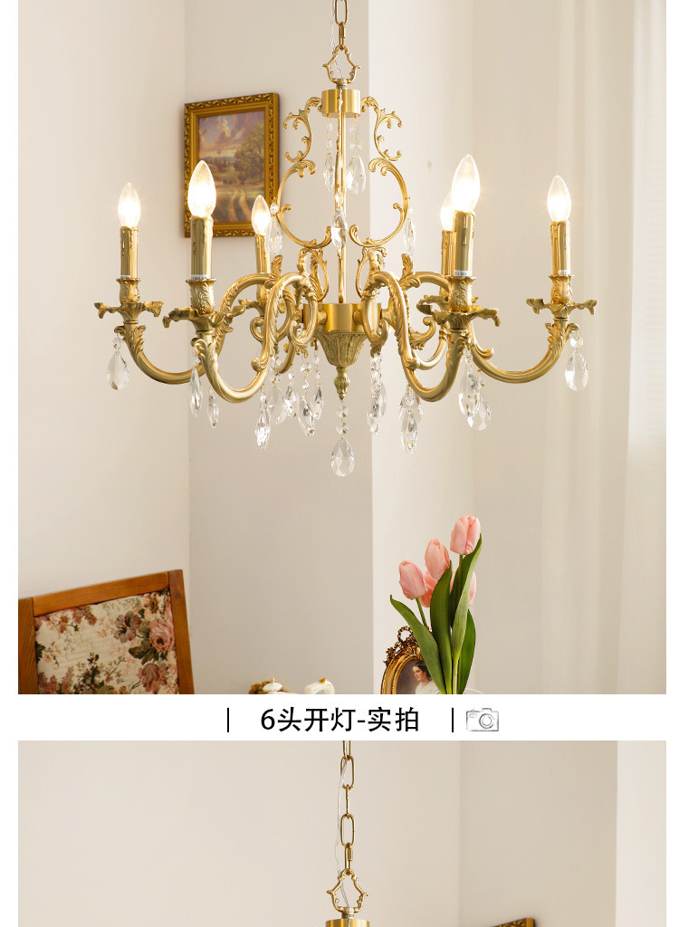 Lampu gantung kristal ruang tamu retro Amerika antik klasik kuno tengah lampu gantung restoran retro Prancis kuningan enam-lengan