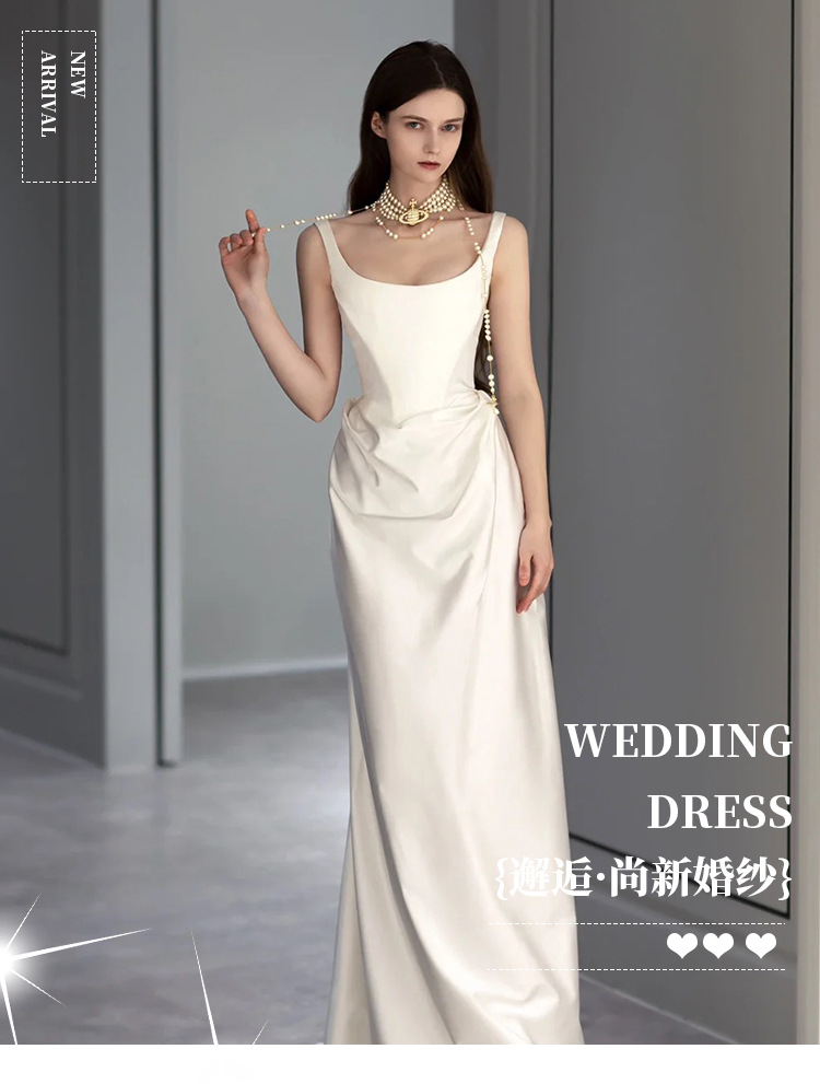 Grosir gaun pengantin satin sederhana vintage baru tahun 2026 dengan ekor pendek dan tali spaghetti, cocok untuk acara keluar atau sebagai gaun malam.