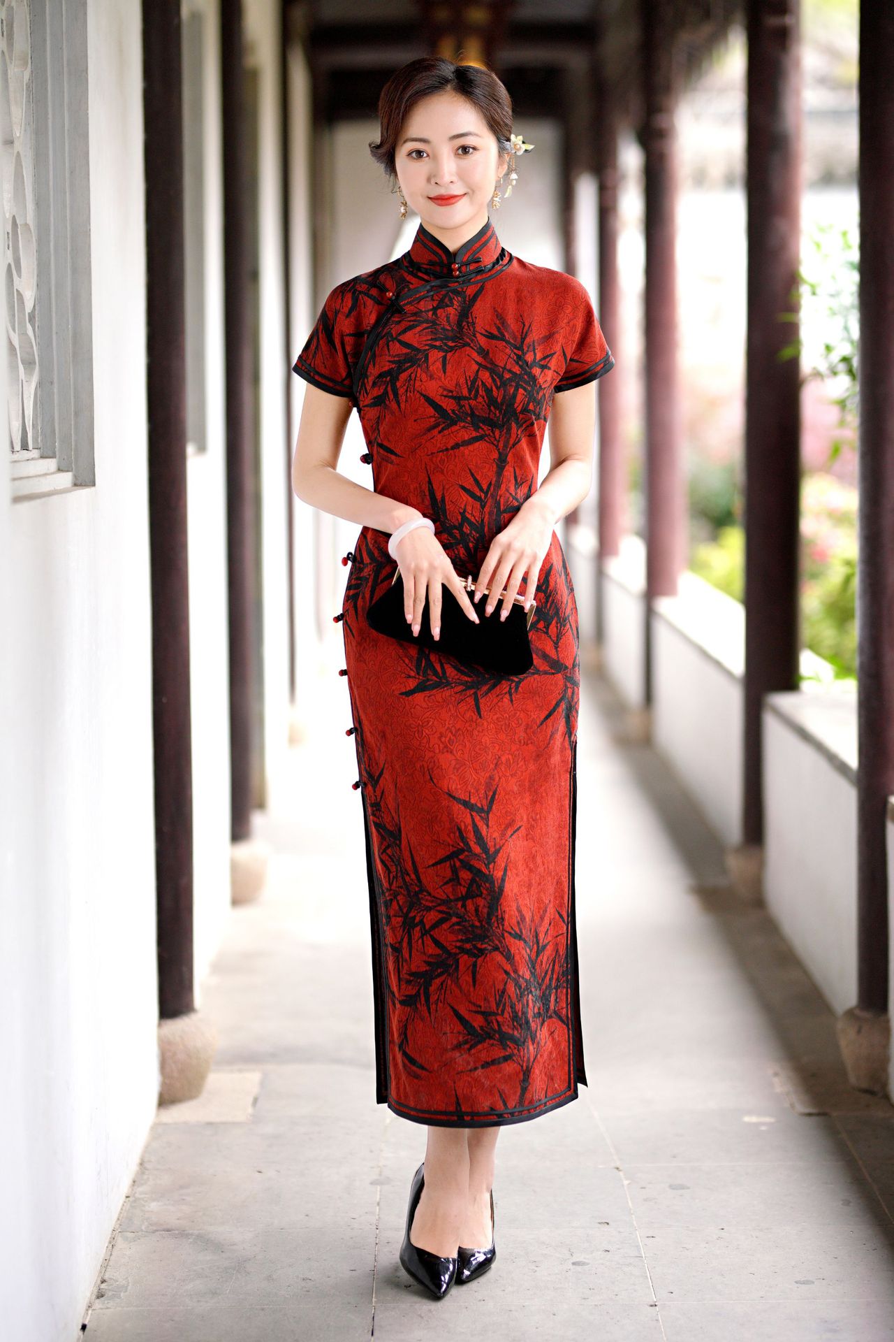Gaun cheongsam jacquard sutra panjang model ibu mertua bergaya pernikahan dengan cheongsam sutra tradisional yang elegan