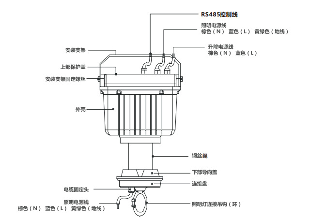 灯具在顶部时,可使用面板对灯具进行开关灯,下降时通电接插件 自动断电,灯具上升至顶部时,3秒后开始给灯具供电,主要防止瞬间 电流对灯具的自动损坏。