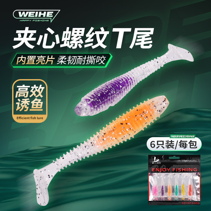 Umpan palsu Luya spiral T ekor, baru umpan lembut ekor air tawar T kait kepala cacing lembut bass ikan Mandarin tembakan panjang