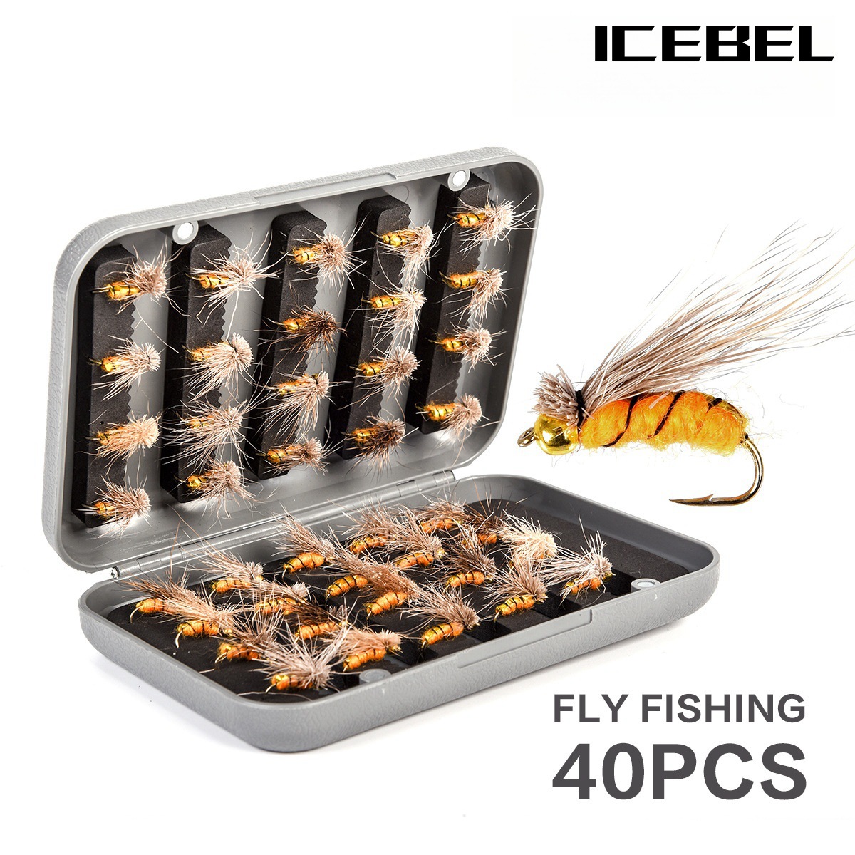 ICEBEL kotak fly hook setelan bulu besar fly worm 40PCs terbang memancing kait bionic serangga dengan kotak umpan