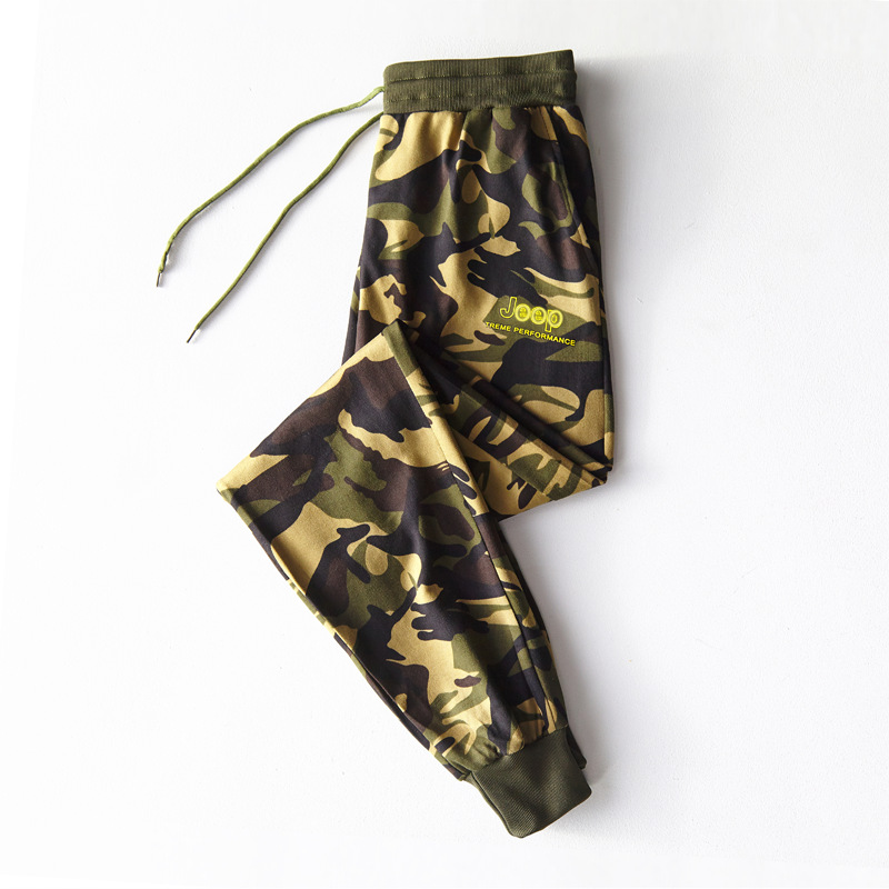 Celana panjang kurus tertutup pria dan wanita, celana panjang olahraga kamuflase kain lembut bersaku sama untuk lelaki