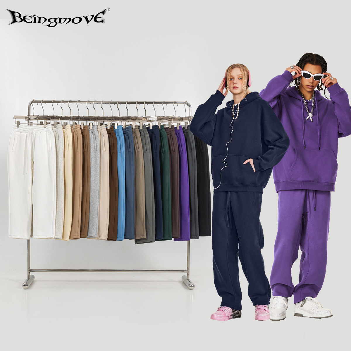 Celana training pria model Amerika musim gugur-dingin 2025, merek trendi, warna polos, ukuran besar longgar, bahan tebal, potongan lurus, gaya kasual.